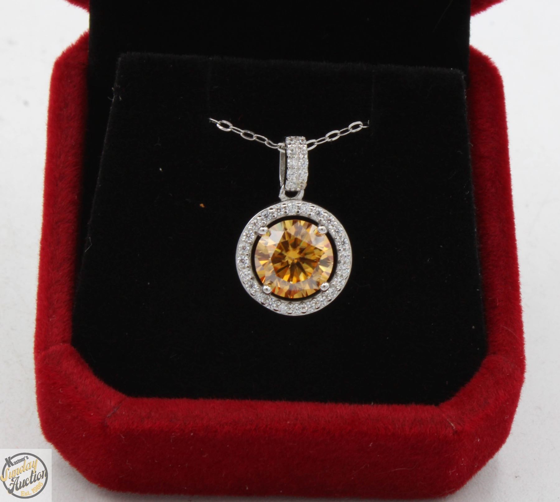 CUT MOISSANITE STONE VVS FANCY ORANGE COLOR WITH 24 ROUND BRILLIANT CUT CUBIC ZIRCONIA SET IN ROUND HALO WITH 10 MORE SET IN BALE SET IN 925 SILVER PENDANT **ALL ITEMS MUST BE REMOVED BY 5PM SATURDAY, JULY 5TH 2025. ALL REMAINING ITEMS WILL BE SUBJECT TO A $6.00 PER DAY STORAGE CHARGE. ANY ITEMS REMAINING AFTER MONDAY, JULY 21ST 2025 WILL BE CONSIDERED FORFEITED. NO REFUNDS WILL BE ISSUED FOR FORFEITED ITEMS. TO SCHEDULE A PICK UP APPOINTMENT CLICK HERE