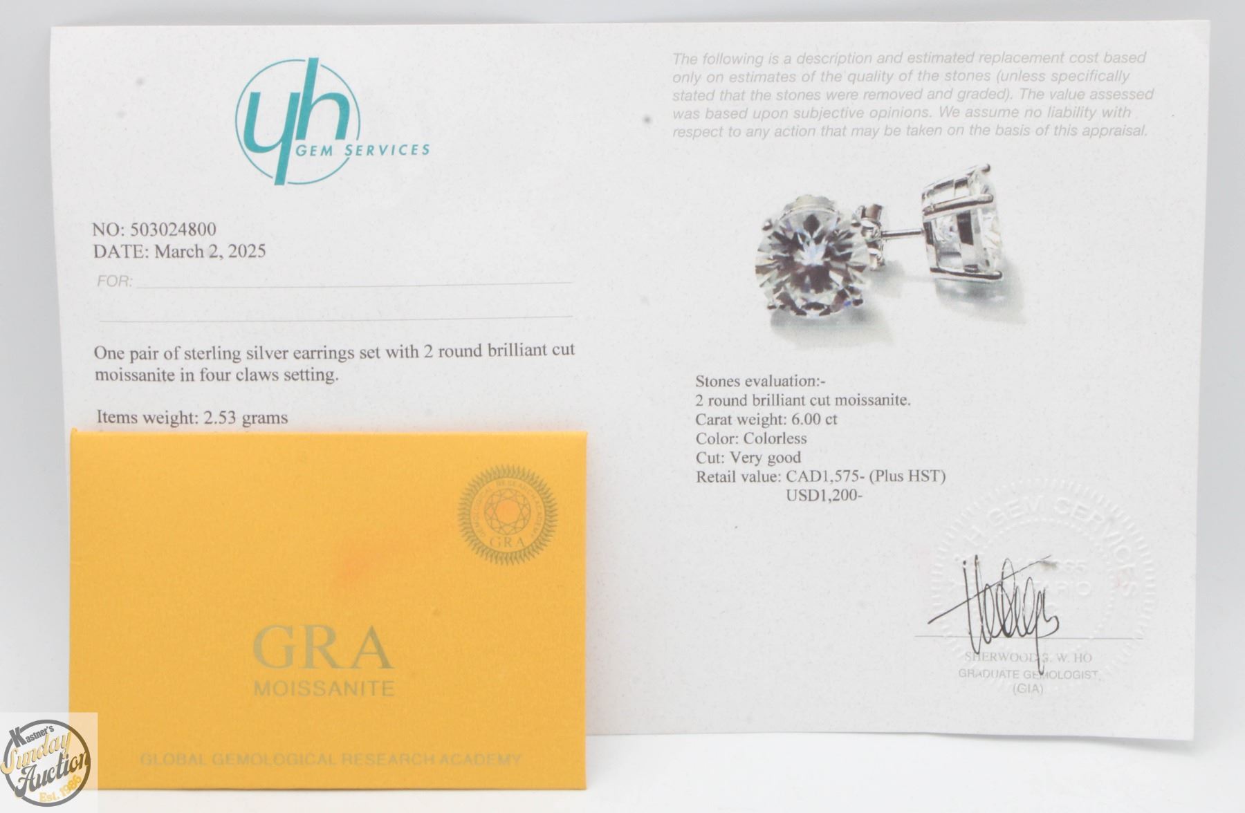 CUT MOISSANITE STONES VVS D COLOR SET IN 4 CLAW HEAD SET IN 925 SILVER EARRINGS RETAIL VALUE $1,575.00 **ALL ITEMS MUST BE REMOVED BY 5PM SATURDAY, JULY 5TH 2025. ALL REMAINING ITEMS WILL BE SUBJECT TO A $6.00 PER DAY STORAGE CHARGE. ANY ITEMS REMAINING AFTER MONDAY, JULY 21ST 2025 WILL BE CONSIDERED FORFEITED. NO REFUNDS WILL BE ISSUED FOR FORFEITED ITEMS. TO SCHEDULE A PICK UP APPOINTMENT CLICK HERE