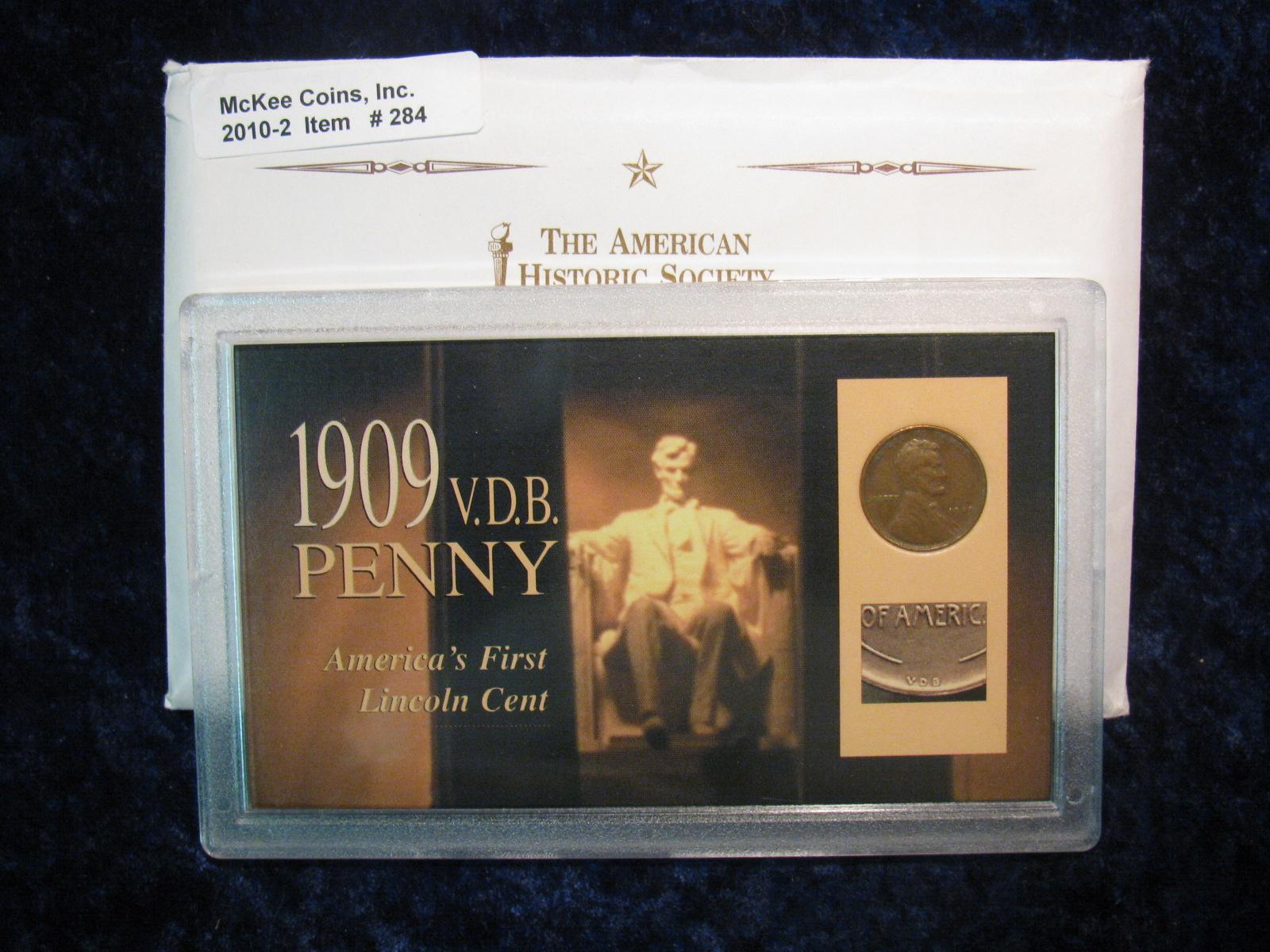 284. 1909 P VDB Penny "America's First Lincoln Cent" in a fancy case. F-12. Comes with a certificate of authenticity.