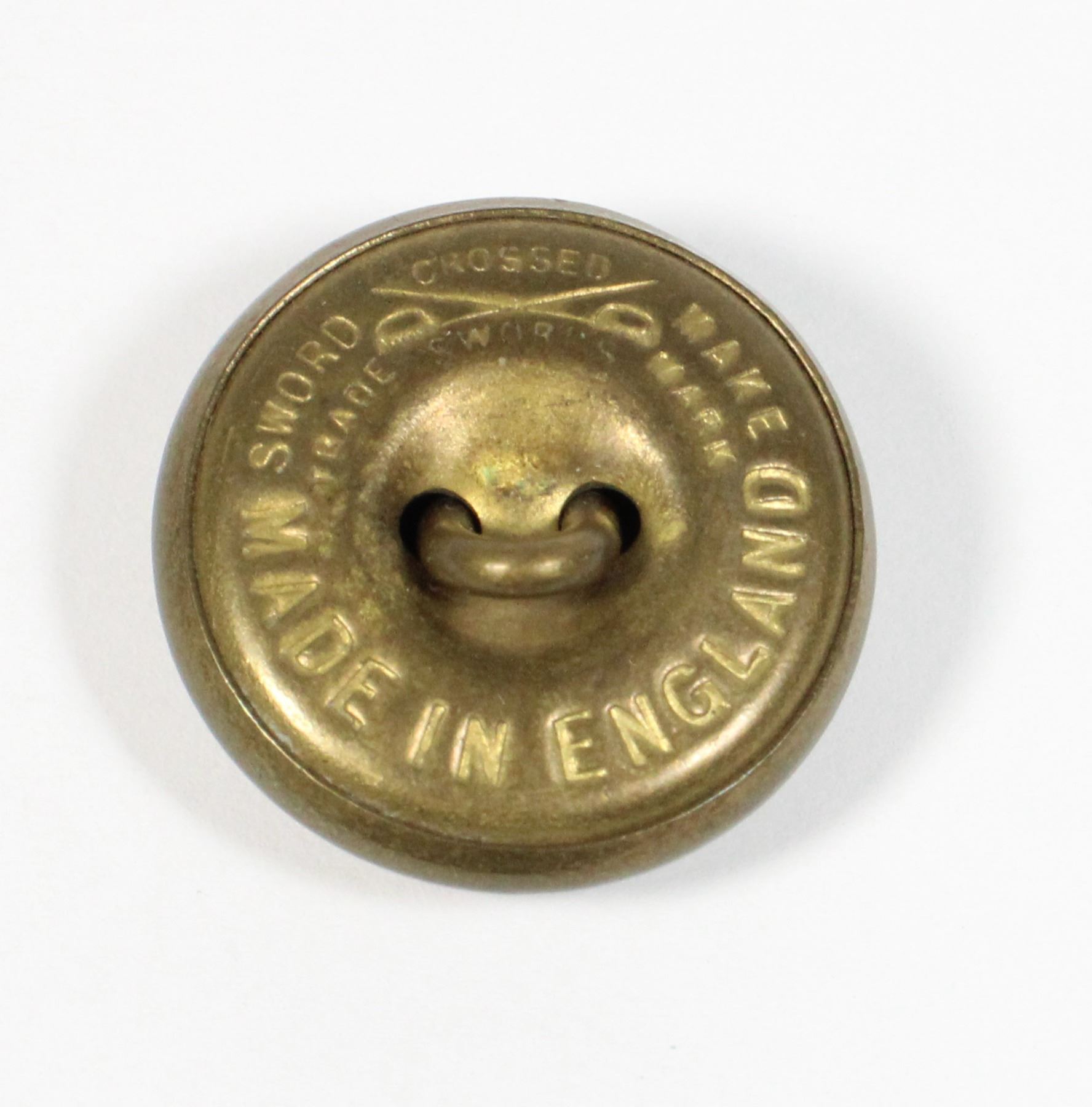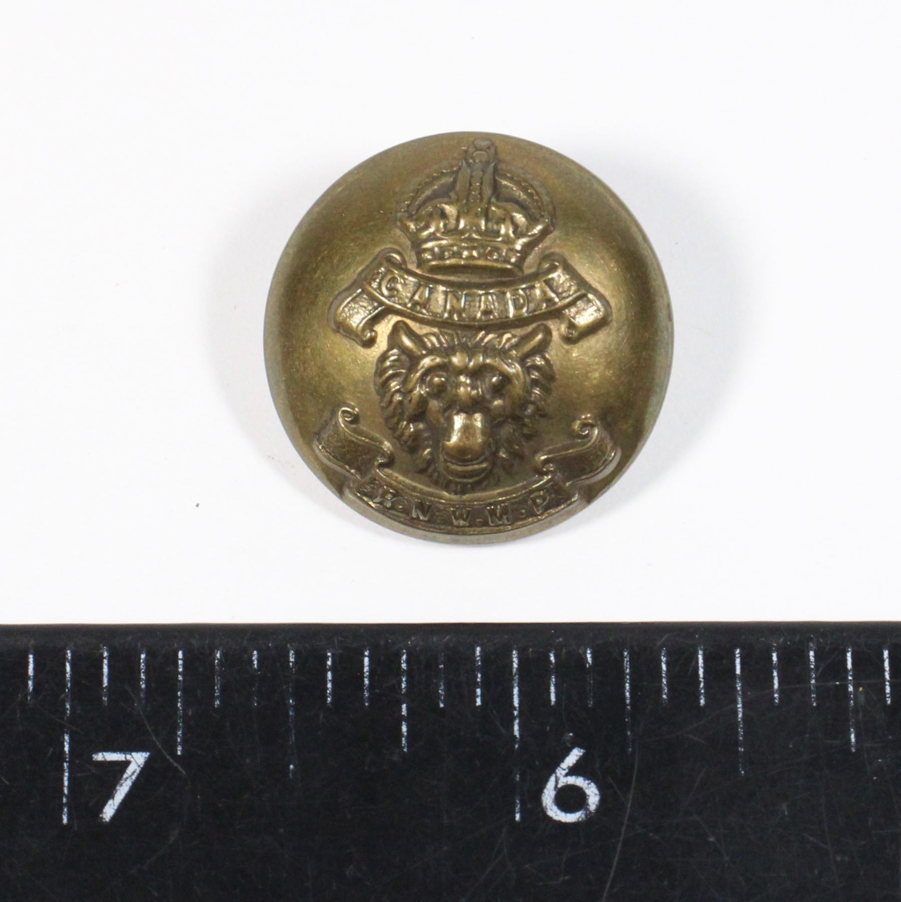 LARGE RNWMP BUTTON, DARK PATINA- MARKED ON REVERSE "MADE IN ENGLAND CROSSED SWORD". EARLY CANADIAN LAW ENFORCEMENT ROYAL NORTH WEST MOUNTED POLICE - 1901-1920 RNWMP INSIGNIA