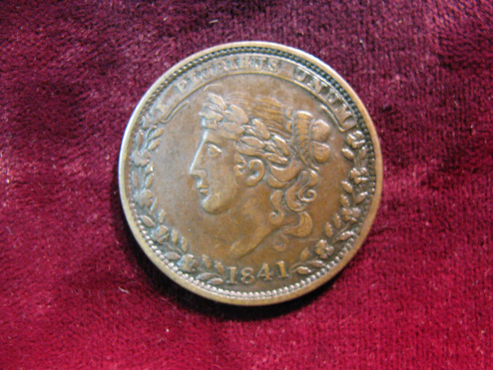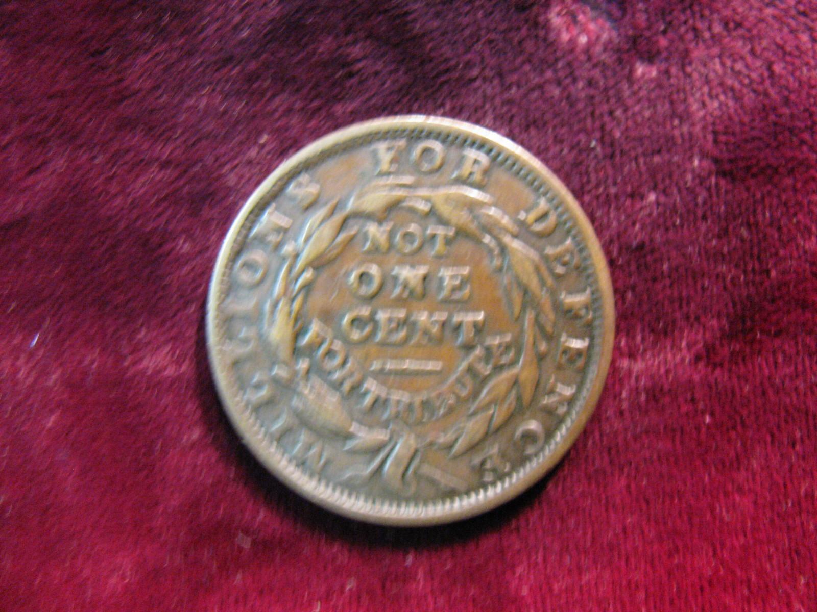 2842. 1841 Hard Times Token "Not One Cent","For tribute","Millions For Defense" .VF