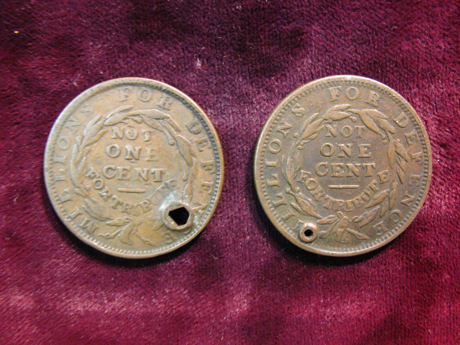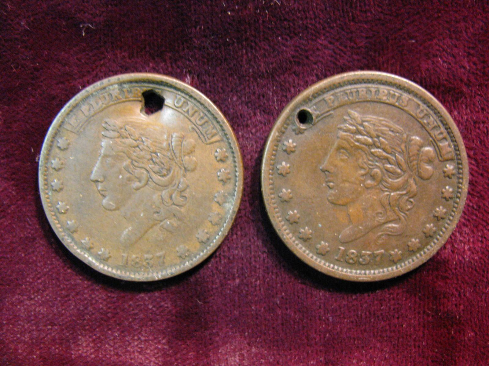 2843. (2) 1837 Hard Times Tokens "Not One Cent" , F+ Holed.