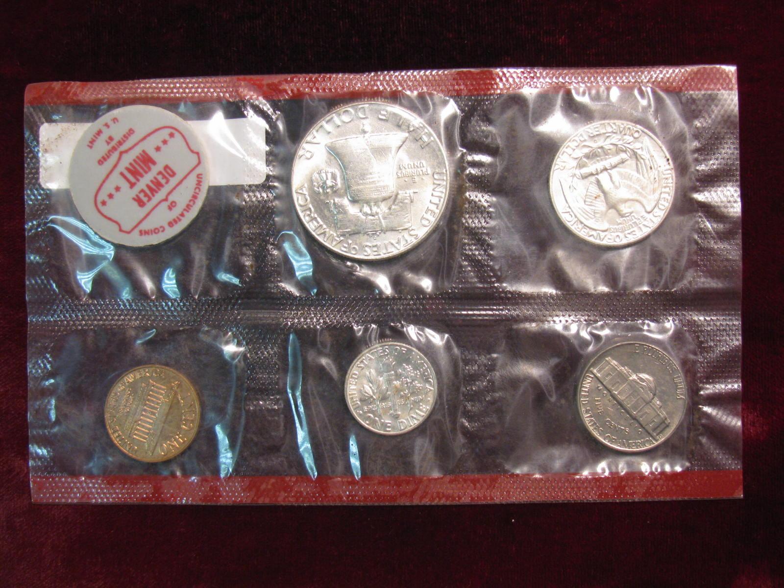 2887. 1963 Denver U.S. Mint Set in original cellophane. No envelope. Includes $.85 face value in 90% Silver BU Coins. Some spots on the cents.