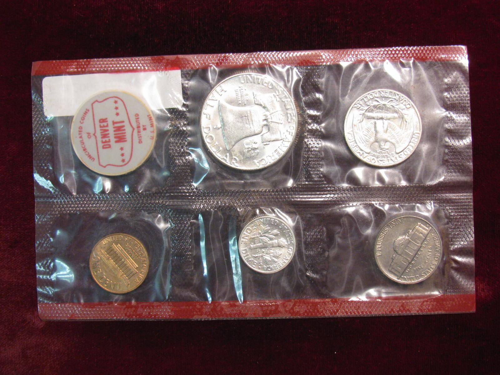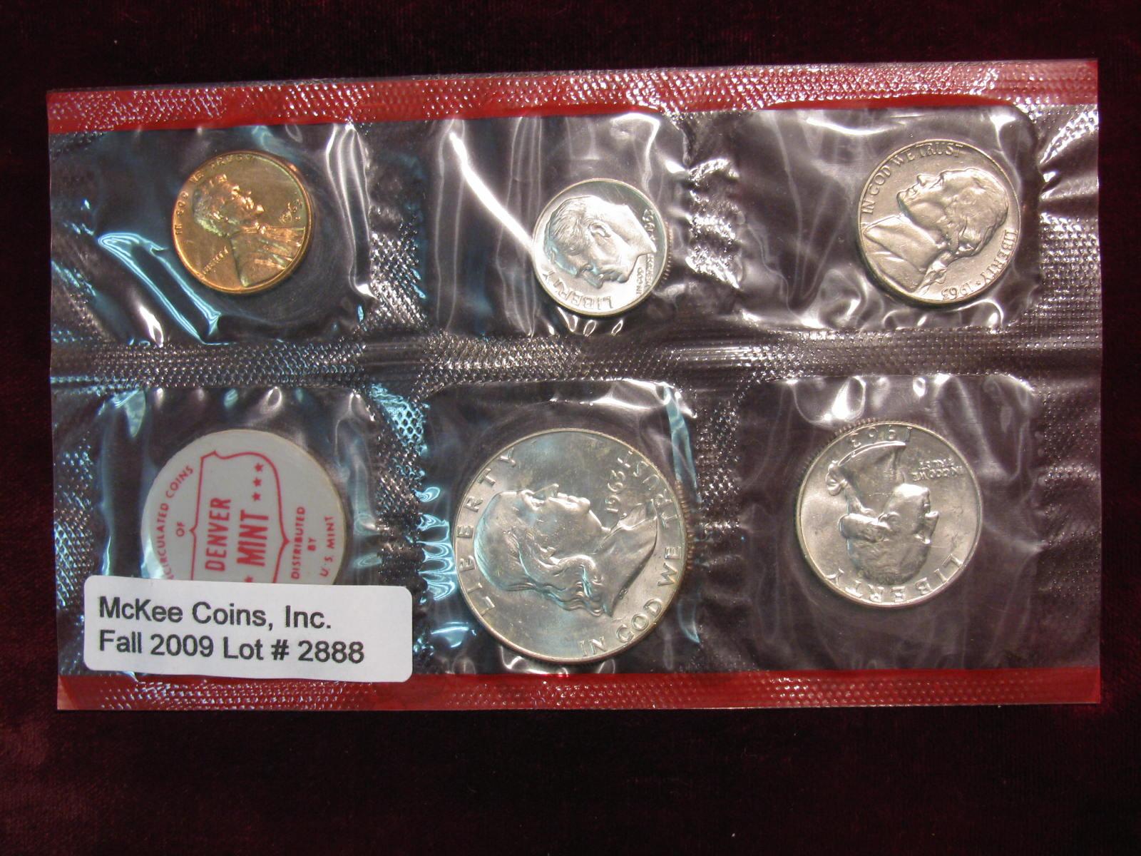2888. 1963 Denver U.S. Mint Set in original cellophane. No envelope. Includes $.85 face value in 90% Silver BU Coins. Some spots on the cents.