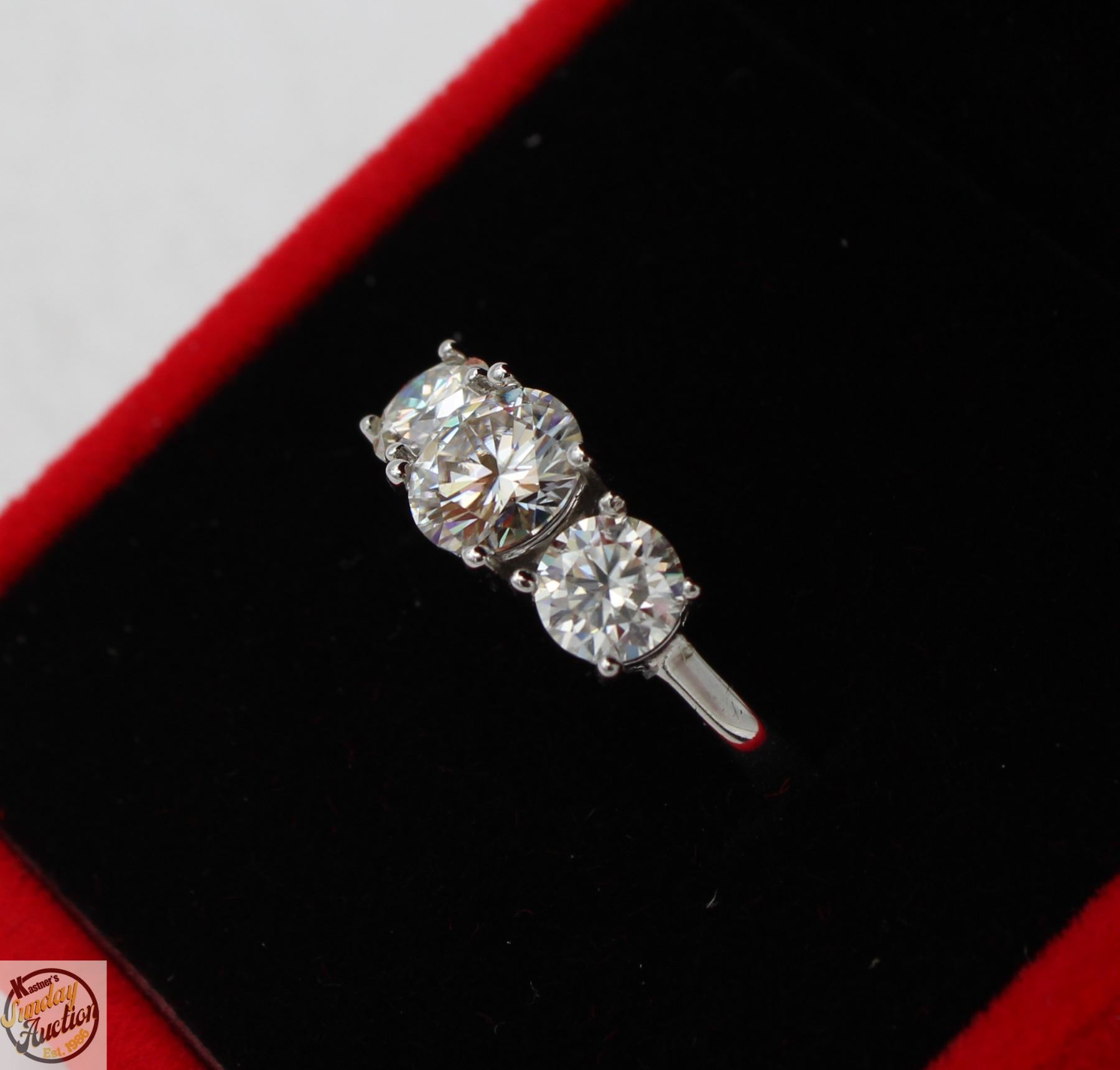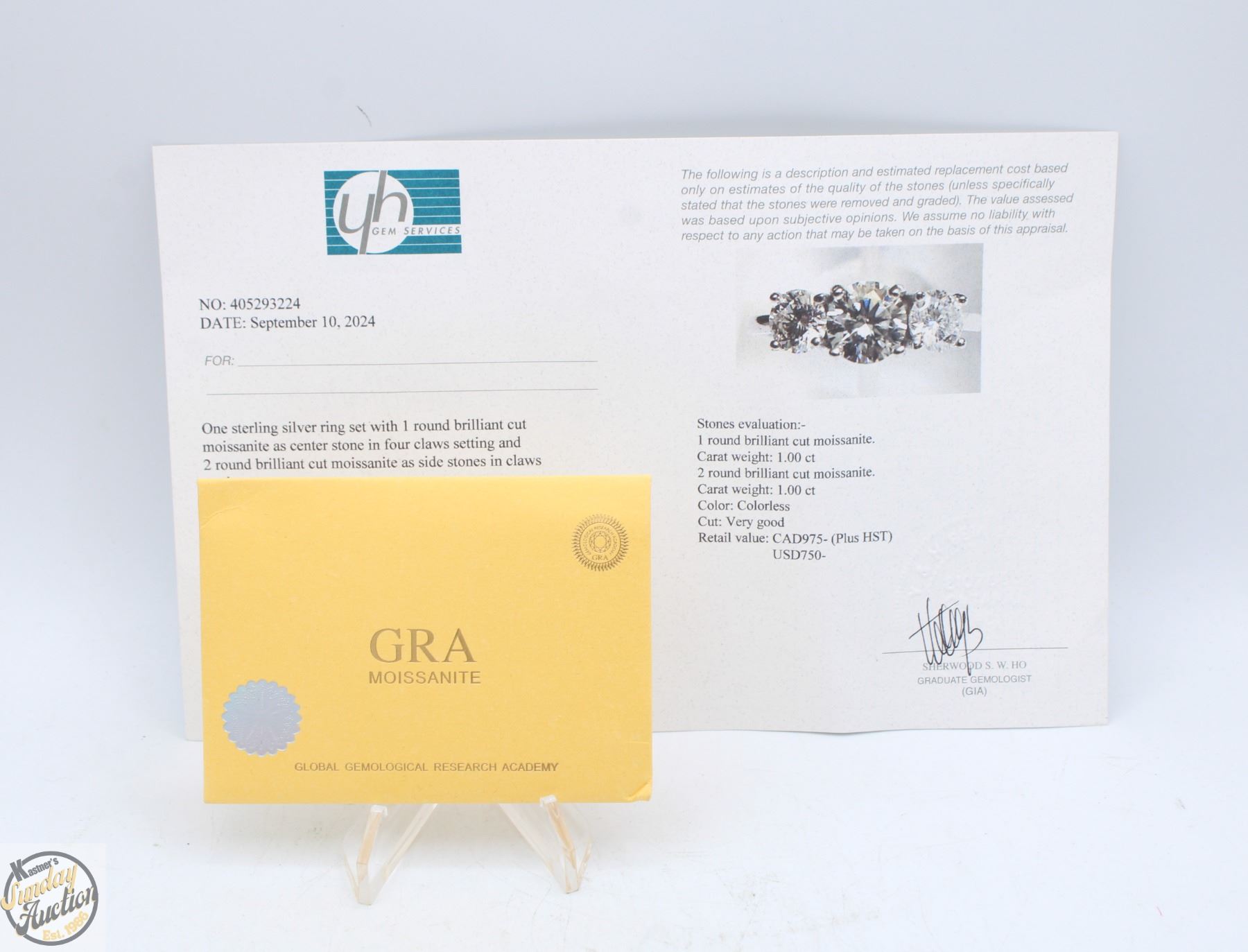 CUT MOISSANITE STONES VVS D COLOR SET WITH 1.00 CT MOISSANITE SET IN CENTER WITH 0.50 CT SET ON EITHER SIDE SET IN 925 SILVER RING SIZE 7.5 RETAIL VALUE $975.00 **ALL ITEMS MUST BE REMOVED BY 5PM SATURDAY, JULY 26th 2025. ALL REMAINING ITEMS WILL BE SUBJECT TO A $6.00 PER DAY STORAGE CHARGE. ANY ITEMS REMAINING AFTER MONDAY, AUGUST 11TH 2025 WILL BE CONSIDERED FORFEITED. NO REFUNDS WILL BE ISSUED FOR FORFEITED ITEMS. TO SCHEDULE A PICK UP APPOINTMENT CLICK HERE