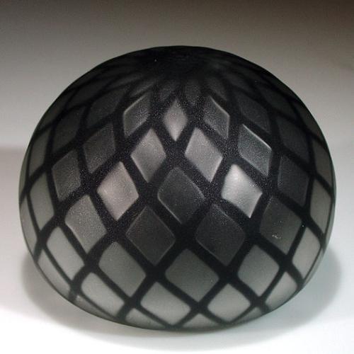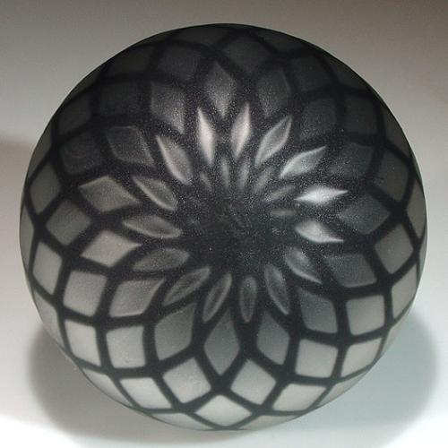 Miscellaneous hollow black and gray satin frosted paperweight, with a pattern of spaced, crisscrossed, curved black lines, which extend from the top of the piece to the base, over a silver-gray surface. Diameter 3 5/8". NO RESERVE