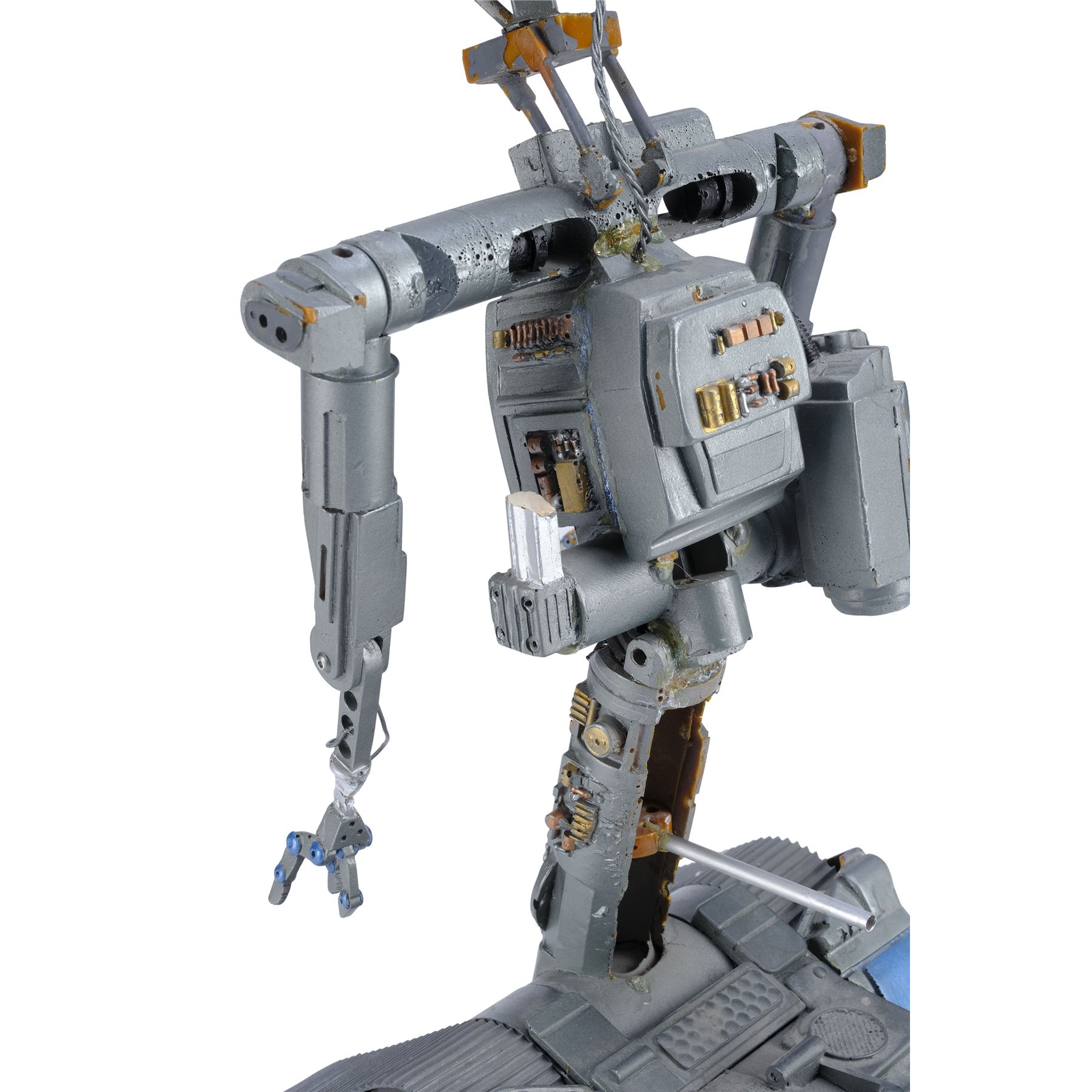 This small Johnny 5 is made of cast resin with an array of twisted metal wires resembling cabling. It has a gray painted finish, with various blue panels and bronze-color embellishments. It features two rubber continuous tracks and was designed to be poseable, but has grown fragile with age. The eyes and some other finer details remain unpainted and the piece has undergone sympathetic restoration to reattach the head and repair the treads. It exhibits paint chipping throughout, exposing the resin underneath, and is missing its lower left eyelid and rear wheel section. Dimensions: 13" x 9.5" x 13" (33.25 cm x 24.25 cm x 33.25)