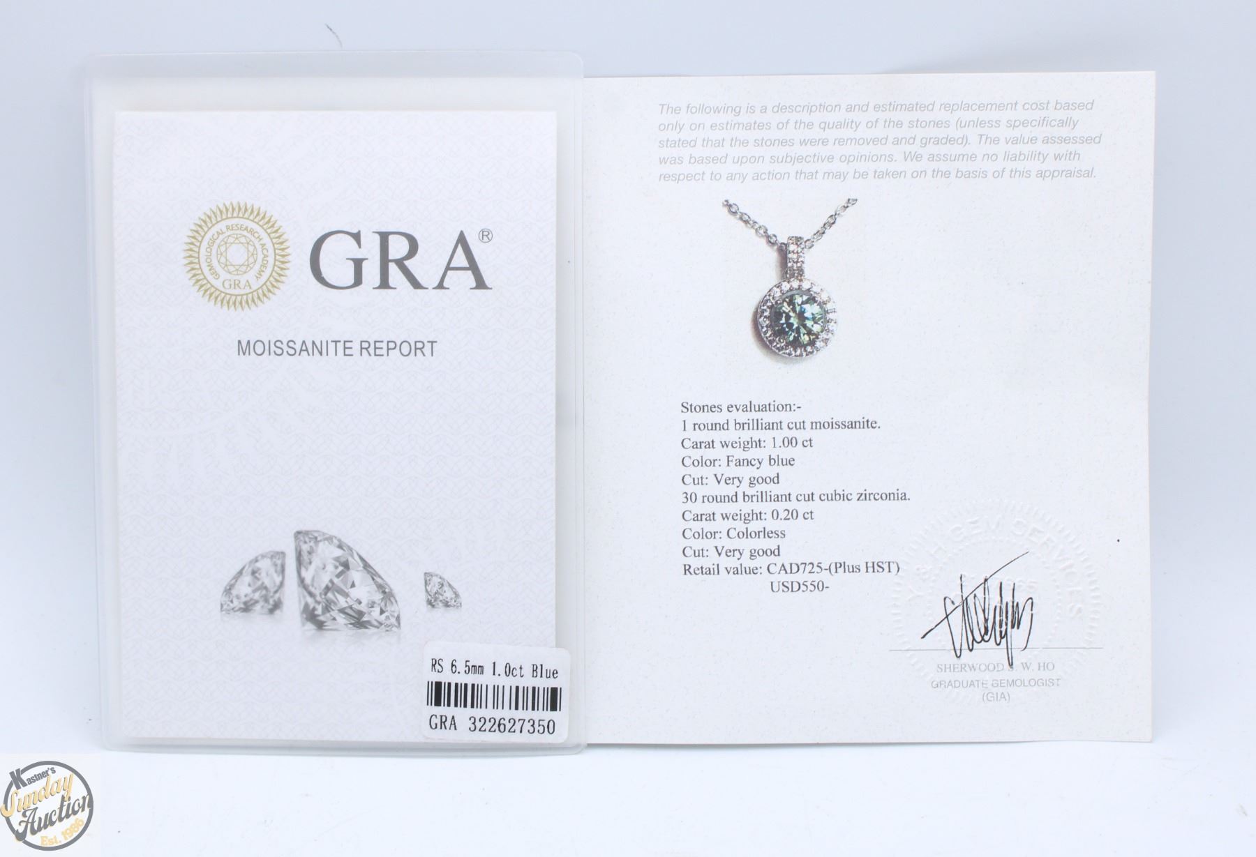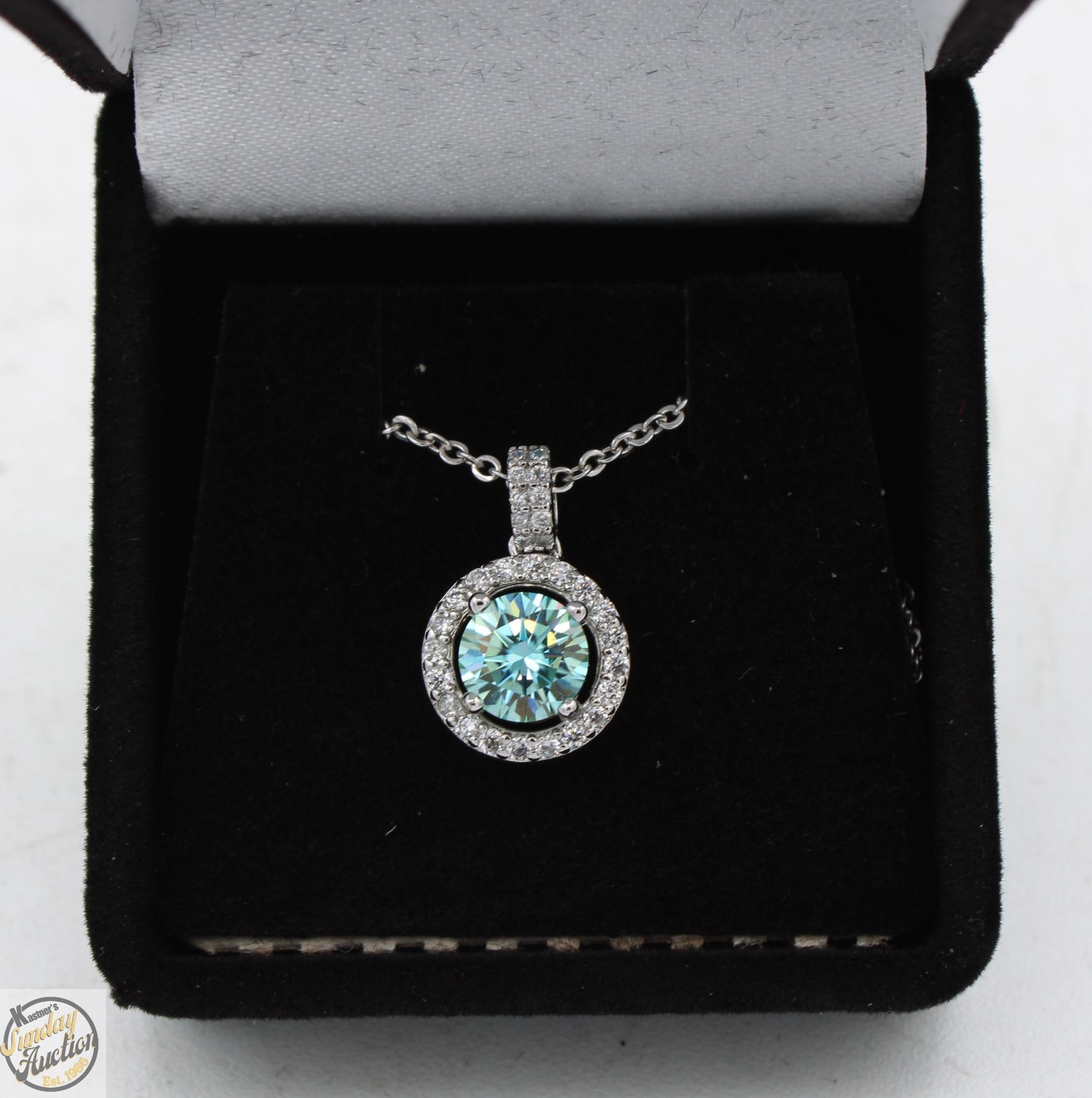 CUT MOISSANITE STONE VVS FANCY BLUE COLOR WITH 30 ROUND BRILLIANT CUT CUBIC ZIRCONIA SET IN ROUND HALO AND IN BALE SET IN 925 SILVER PENDANT RETAIL VALUE $725.00 **ALL ITEMS MUST BE REMOVED BY 5PM SATURDAY, JULY 26th 2025. ALL REMAINING ITEMS WILL BE SUBJECT TO A $6.00 PER DAY STORAGE CHARGE. ANY ITEMS REMAINING AFTER MONDAY, AUGUST 11TH 2025 WILL BE CONSIDERED FORFEITED. NO REFUNDS WILL BE ISSUED FOR FORFEITED ITEMS. TO SCHEDULE A PICK UP APPOINTMENT CLICK HERE