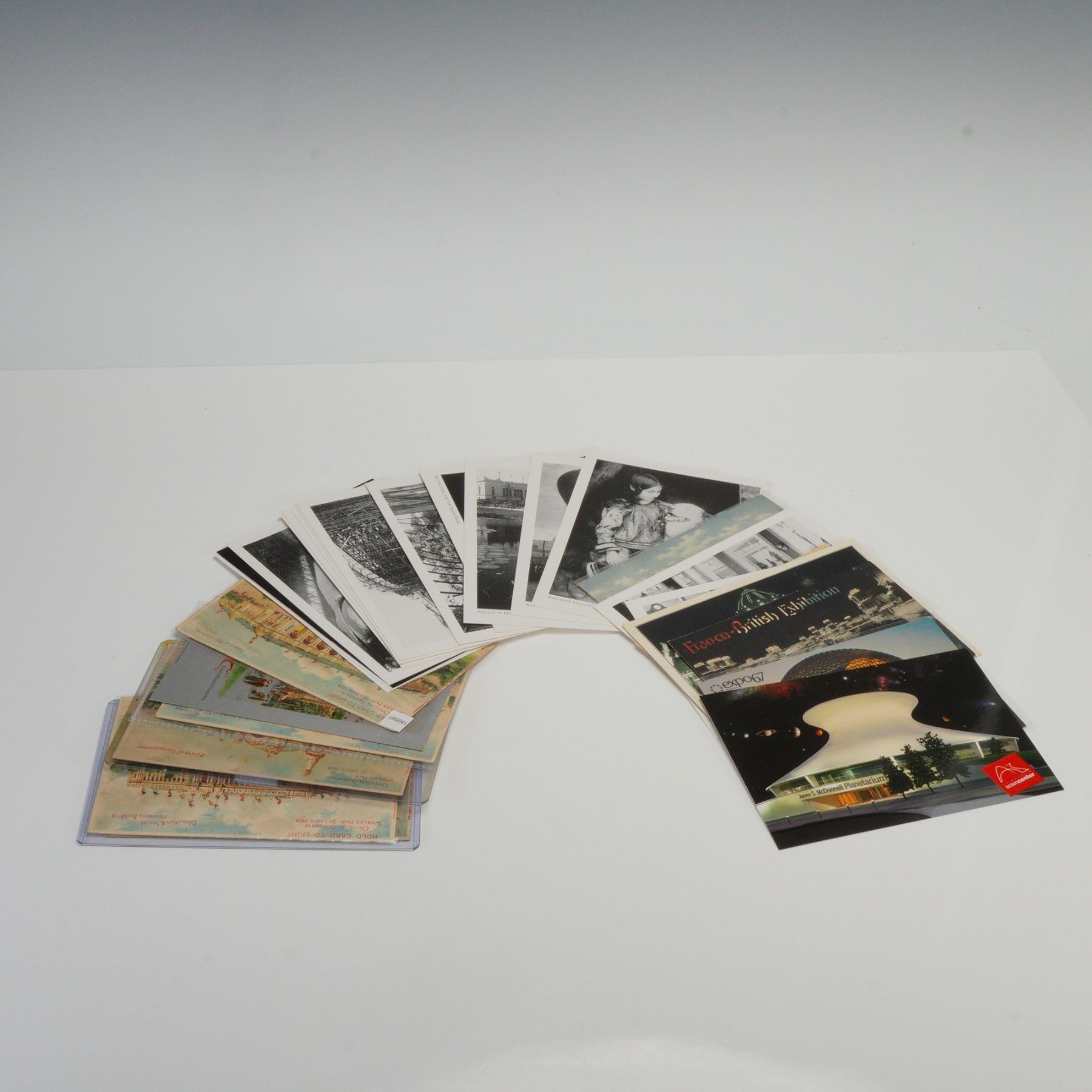 An extensive grouping including a range of subject matter such as architecture, exhibitions, and portraiture of various fairs around the world. Includes fair cards from St. Louis Missouri World's Fair, Franco-British Exhibition, Montreal Canada Expo 67, and New York World's Fair. Several bearing legible postal markings and handwritten inscriptions. Some cards are housed in protective sleeves.