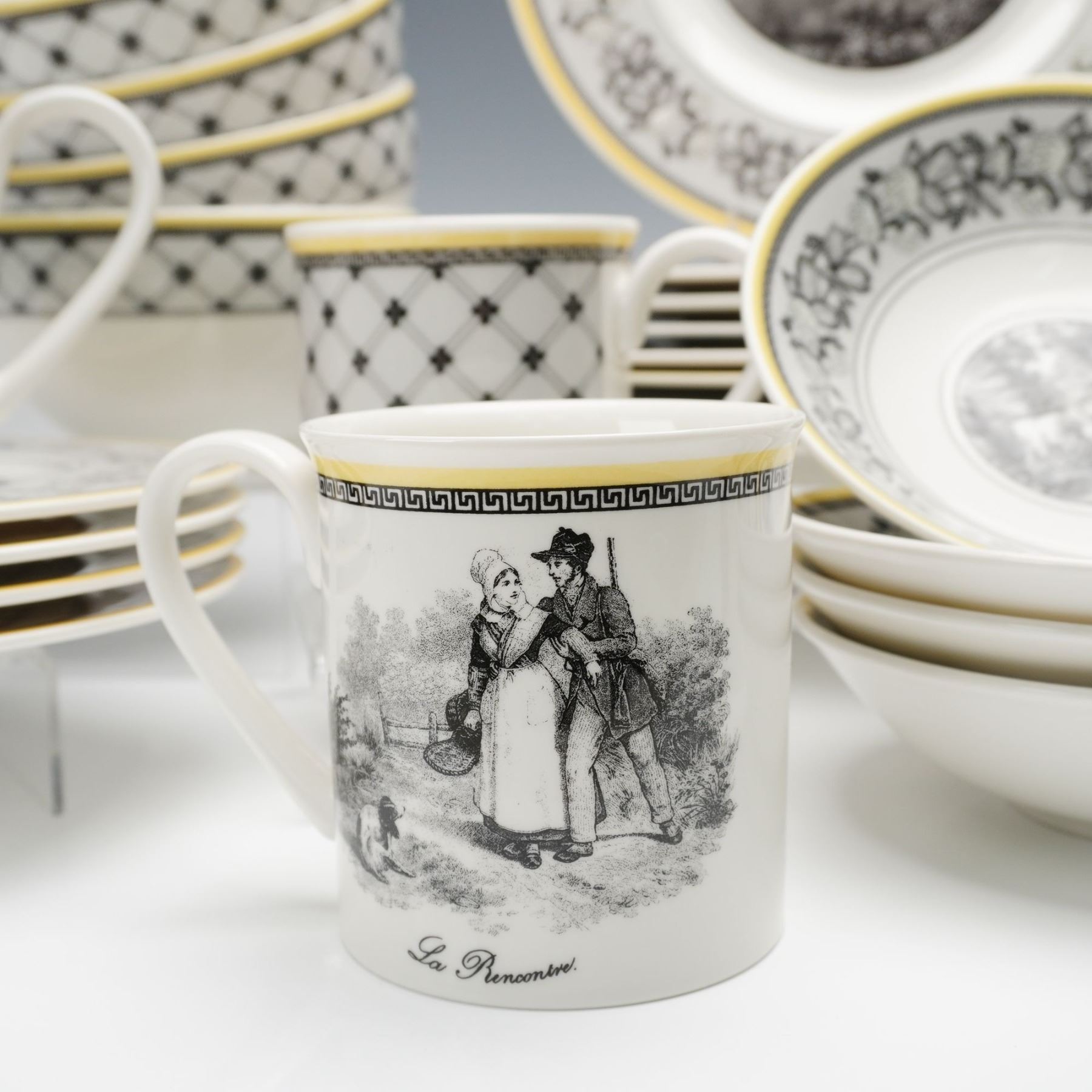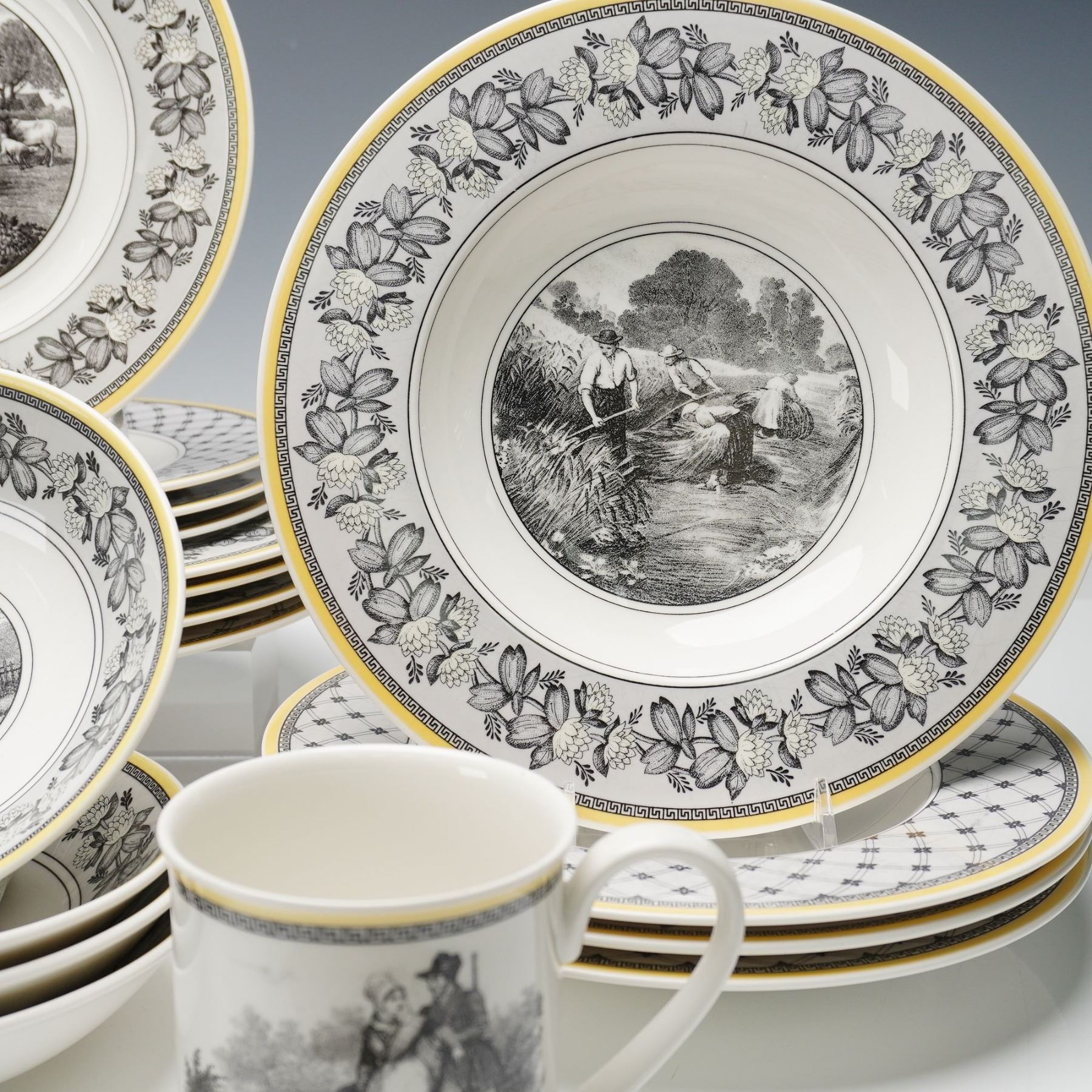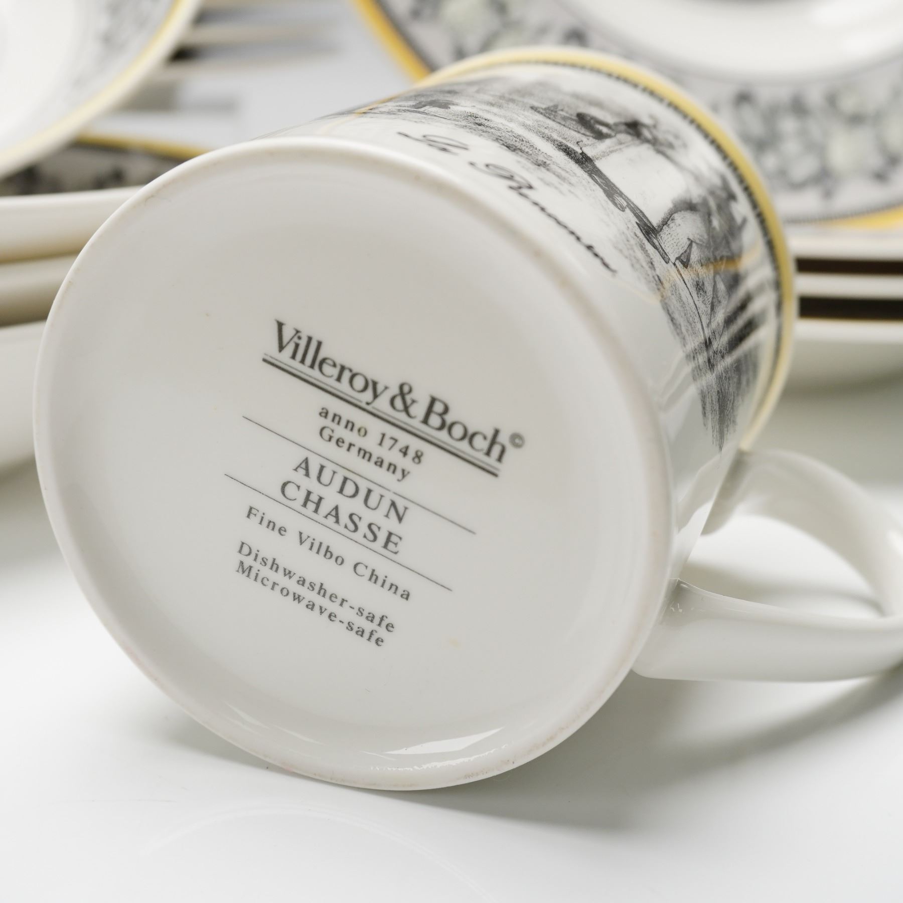 Elegant 28-piece Villeroy & Boch dinnerware set in the Audun Ferme pattern, crafted in Germany from fine Vitro porcelain china. This service for four includes four each of dinner plates, salad plates, bread plates, soup bowls, fruit or dessert bowls, saucers, and cups. The design features pastoral black-and-white toile scenes framed by floral borders with gold trim, evoking 19th-century engravings. Each cup depicts a distinct rustic vignette, such as La Rencontre, while the backstamps read Villeroy & Boch - Audun Ferme - Fine Vilbo China. Dishwasher and microwave safe, this collection beautifully combines classic European country charm with modern functionality.