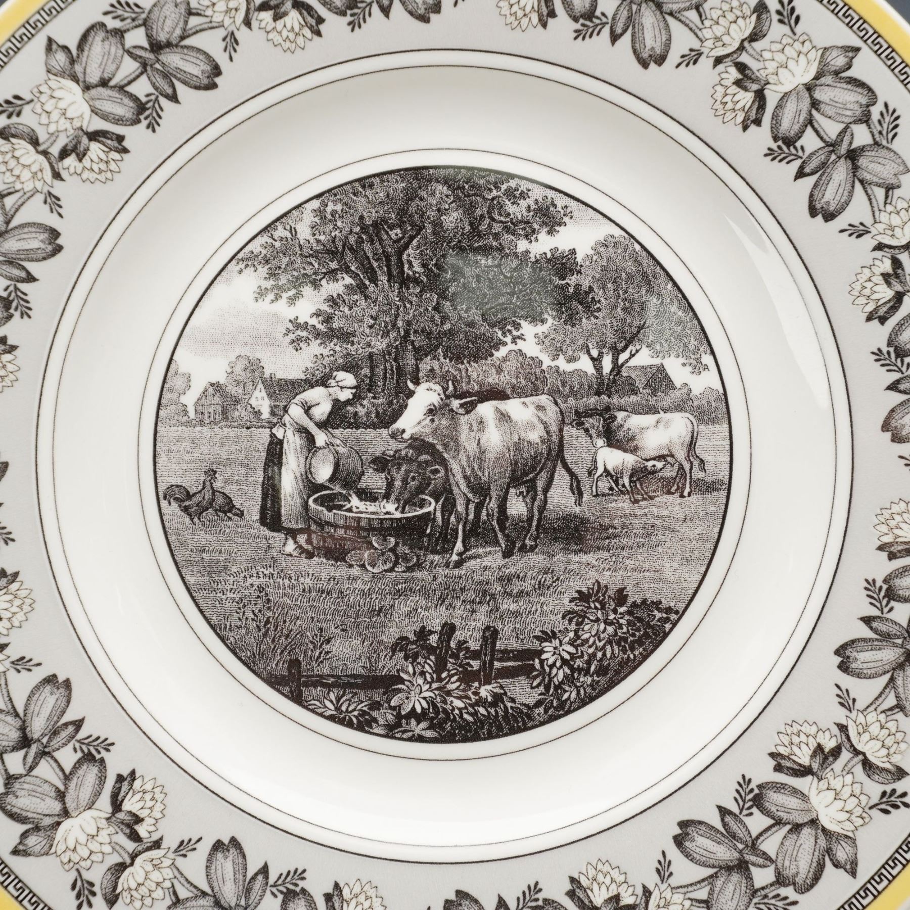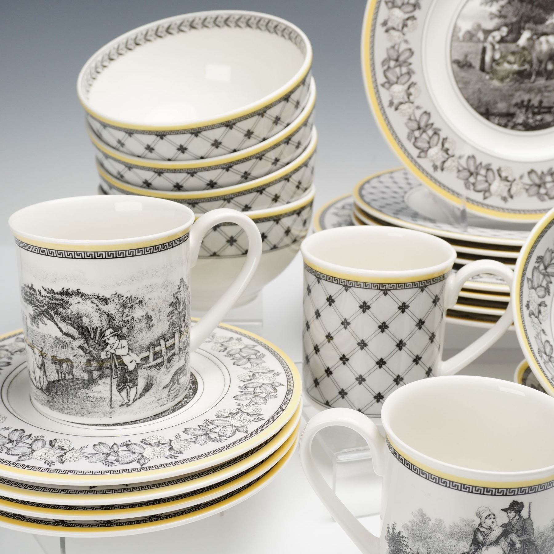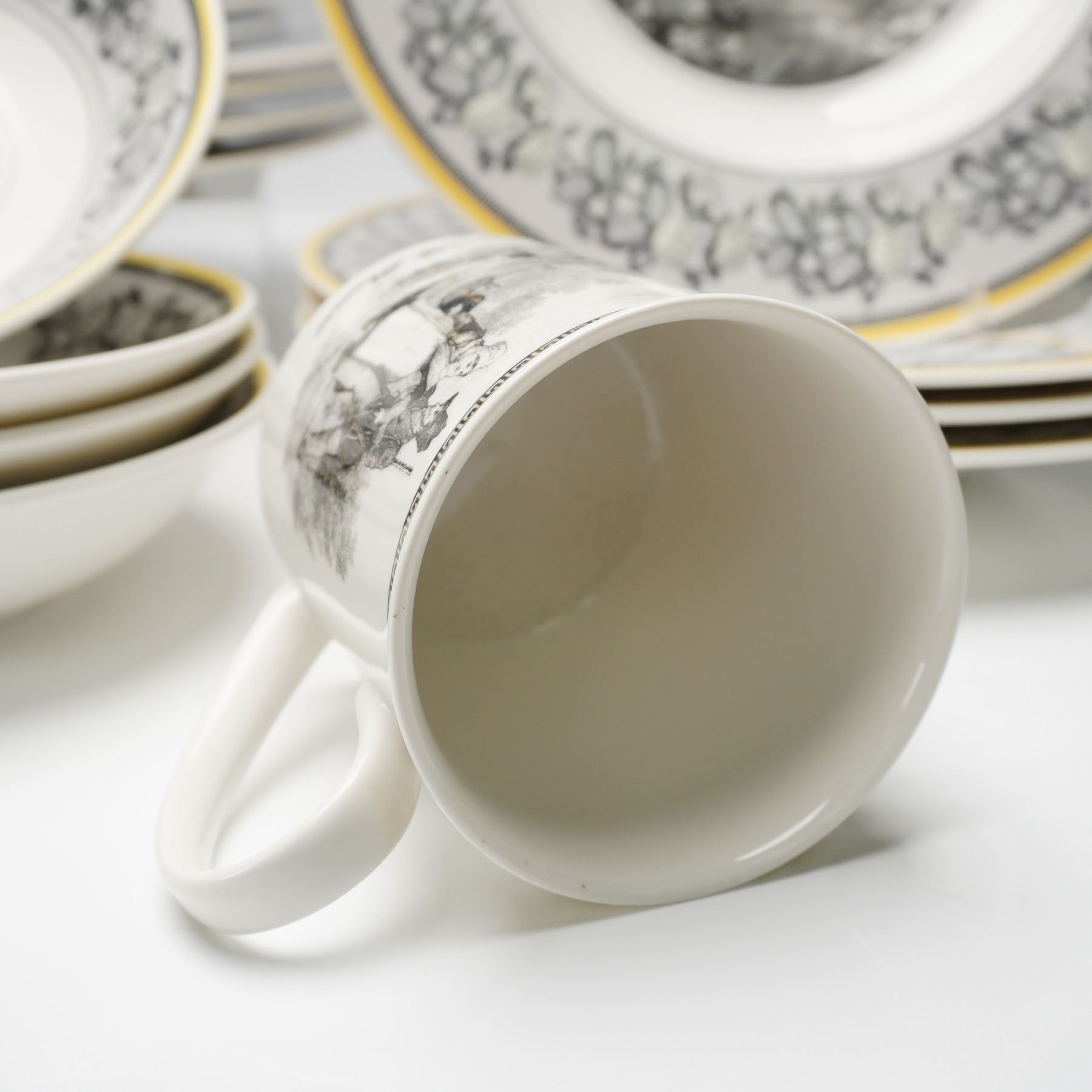 Elegant 28-piece Villeroy & Boch dinnerware set in the Audun Ferme pattern, crafted in Germany from fine Vitro porcelain china. This service for four includes four each of dinner plates, salad plates, bread plates, soup bowls, fruit or dessert bowls, saucers, and cups. The design features pastoral black-and-white toile scenes framed by floral borders with gold trim, evoking 19th-century engravings. Each cup depicts a distinct rustic vignette, such as La Rencontre, while the backstamps read Villeroy & Boch - Audun Ferme - Fine Vilbo China. Dishwasher and microwave safe, this collection beautifully combines classic European country charm with modern functionality.