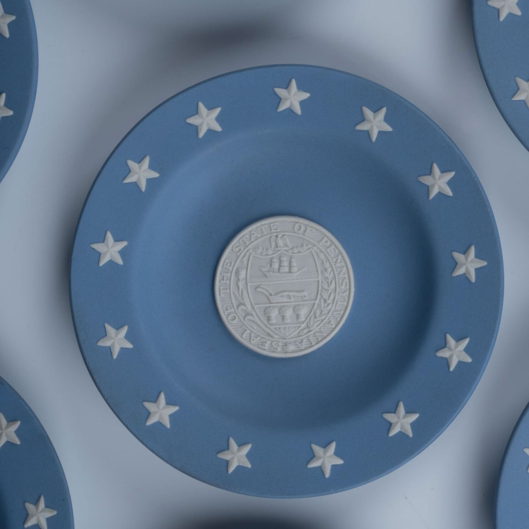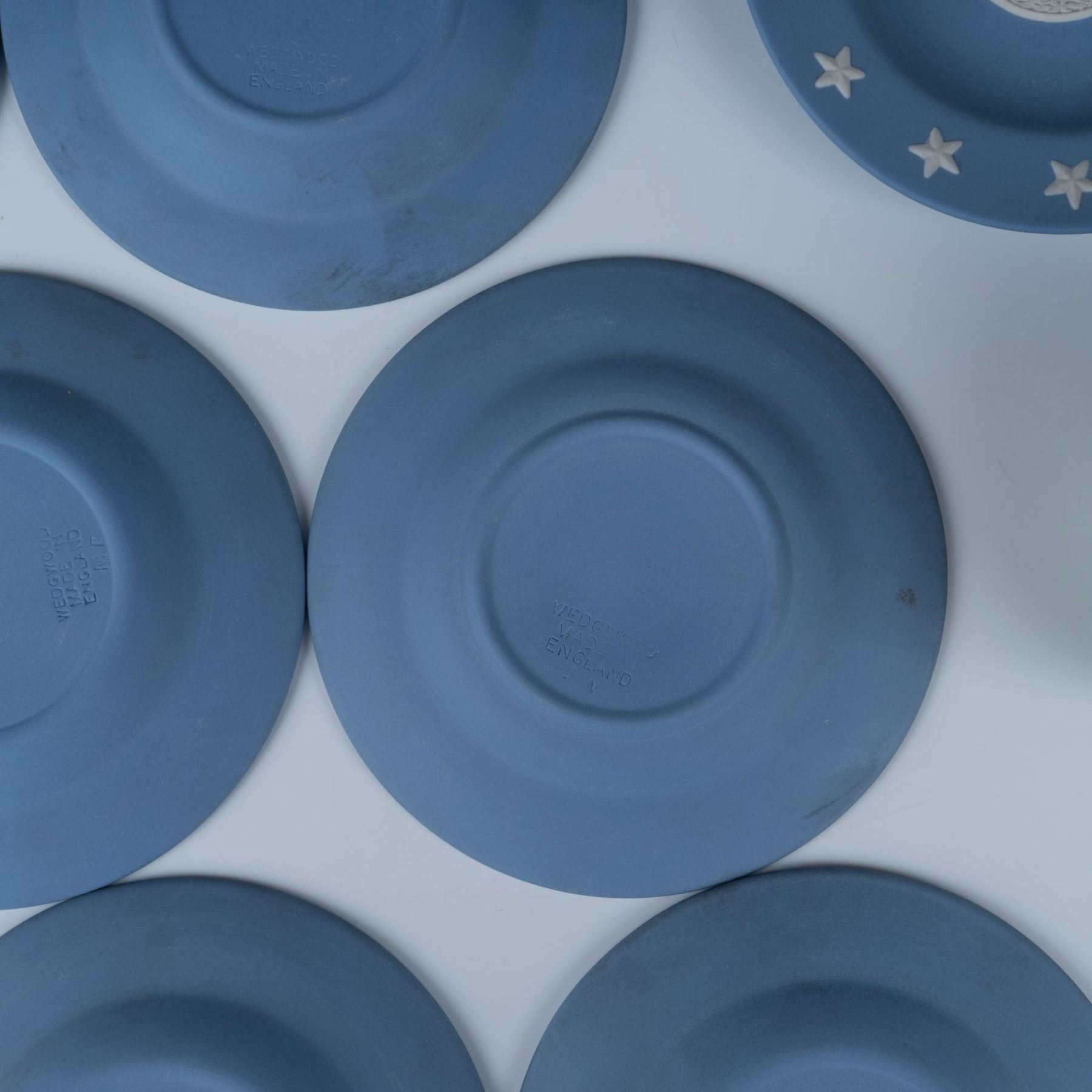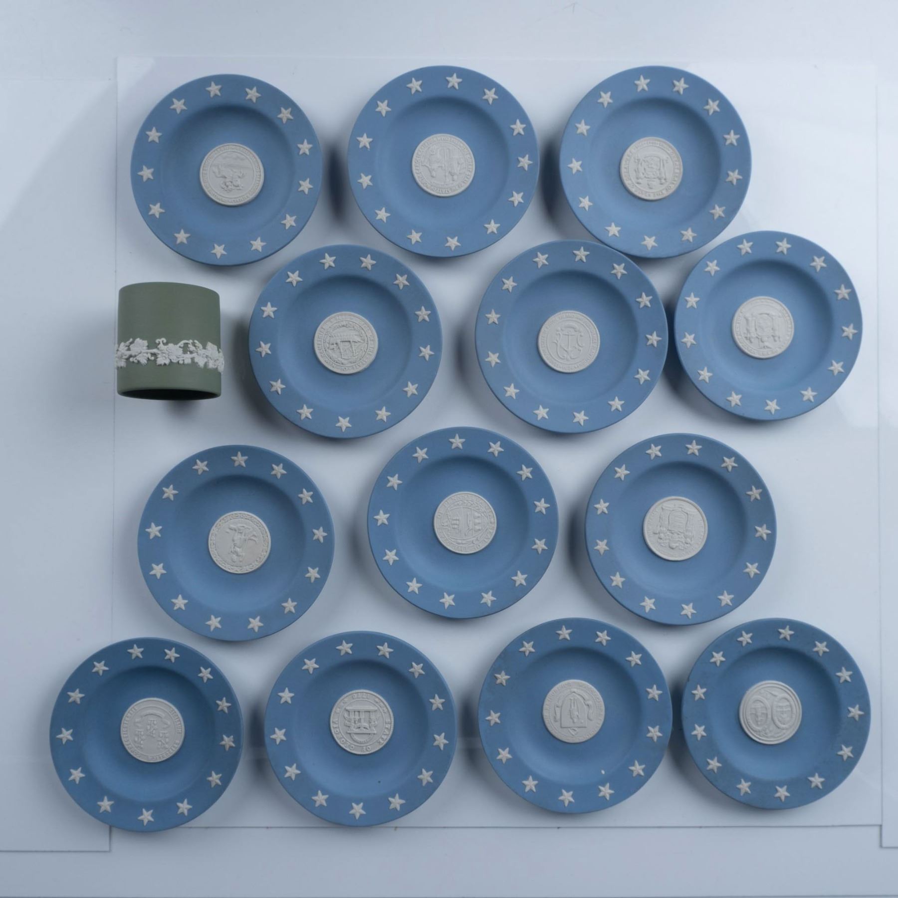 Beautiful group of 27 small plates in blue jasperware with white cameo reliefs of presidents of the United States and States coins. Completed by a Sage Green cup with white vine cameo reliefs. Each plate measures: 0.5''H x 4.5''dia. Cup measures: 2.25''H x 2.25''dia. All marked Wedgwood England.