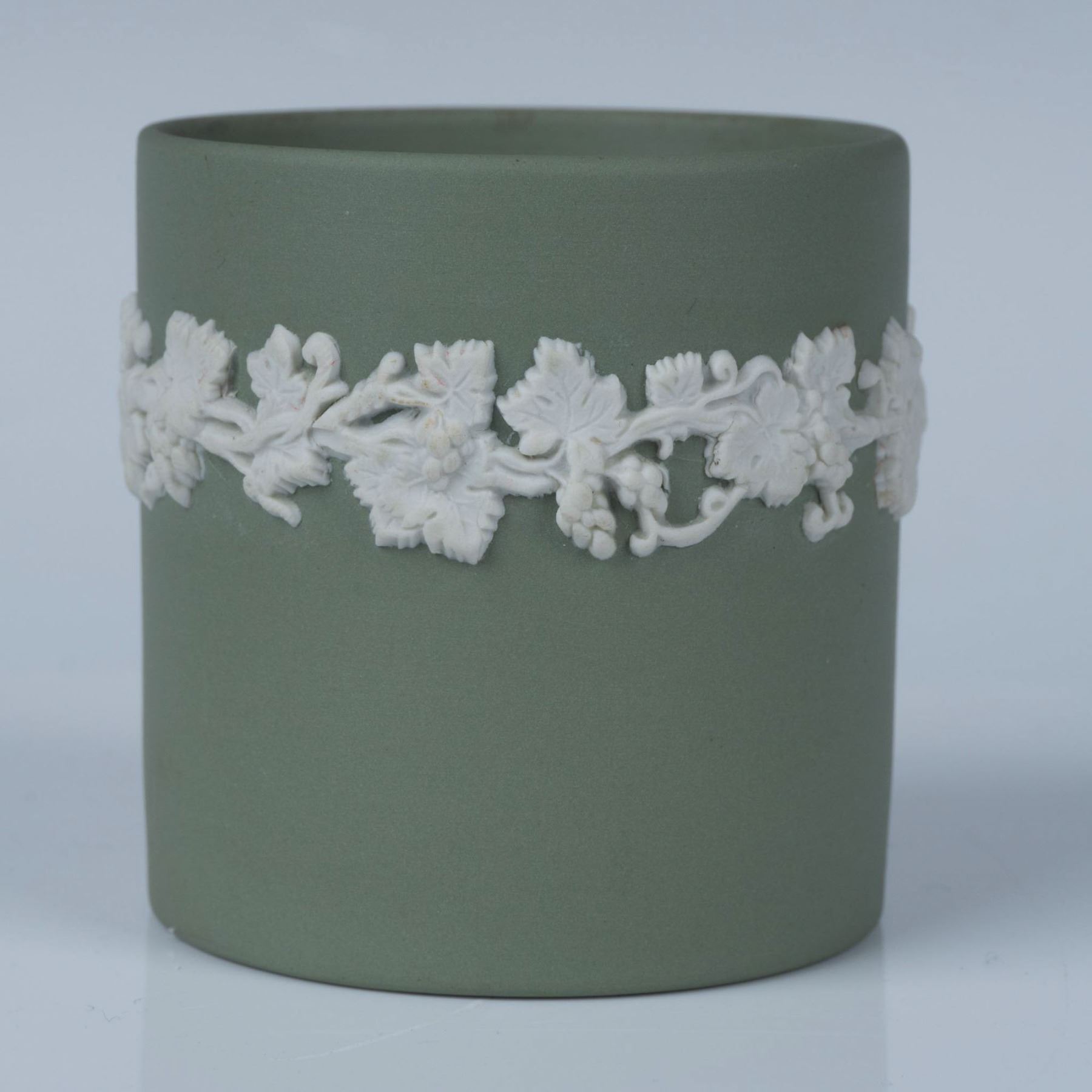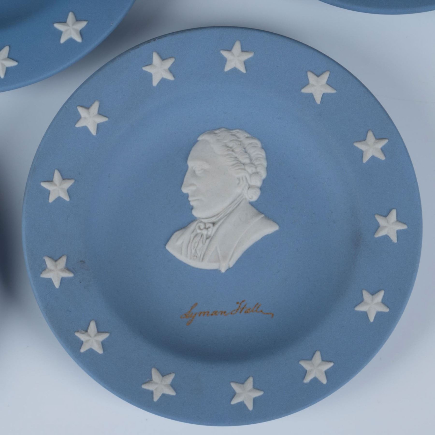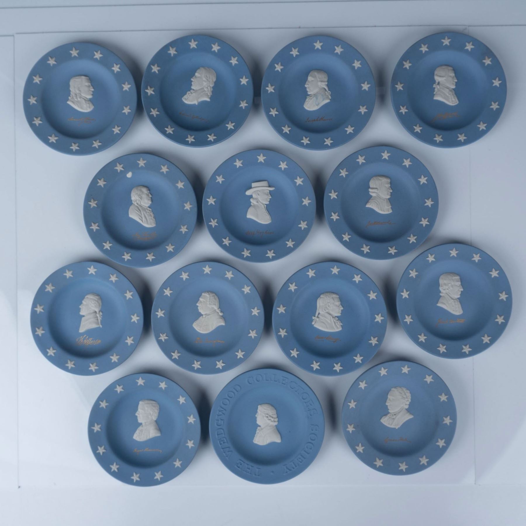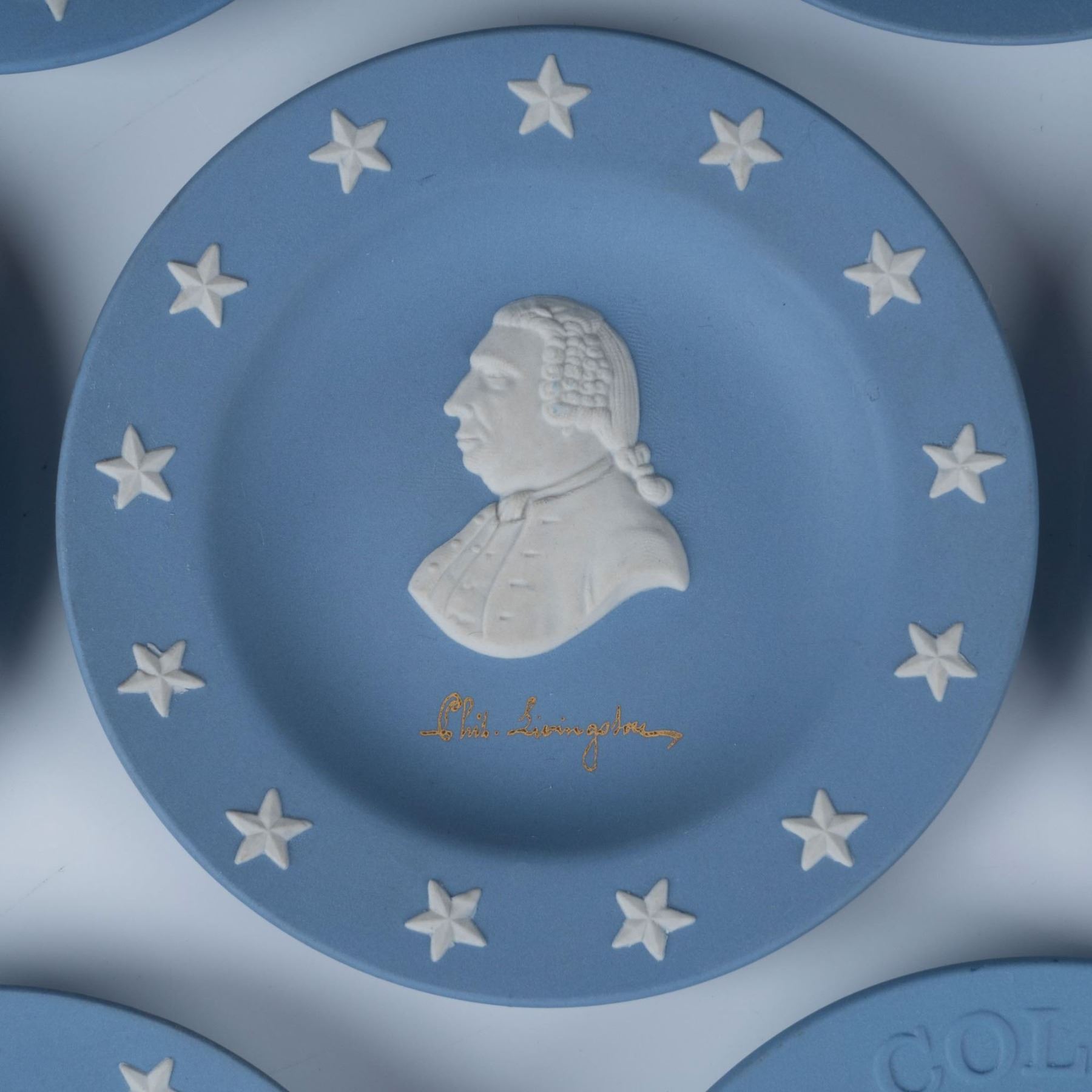 Beautiful group of 27 small plates in blue jasperware with white cameo reliefs of presidents of the United States and States coins. Completed by a Sage Green cup with white vine cameo reliefs. Each plate measures: 0.5''H x 4.5''dia. Cup measures: 2.25''H x 2.25''dia. All marked Wedgwood England.