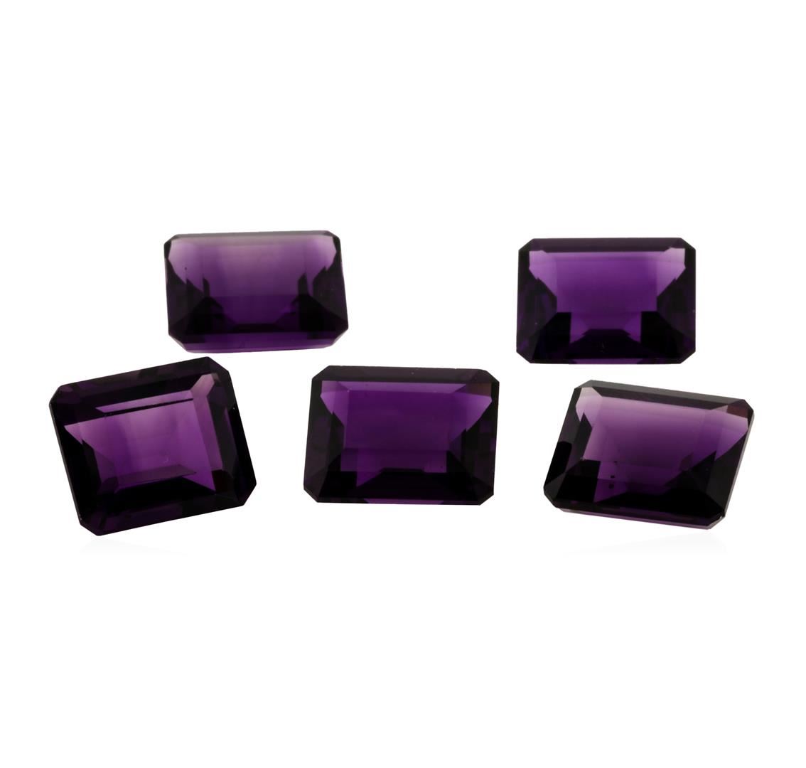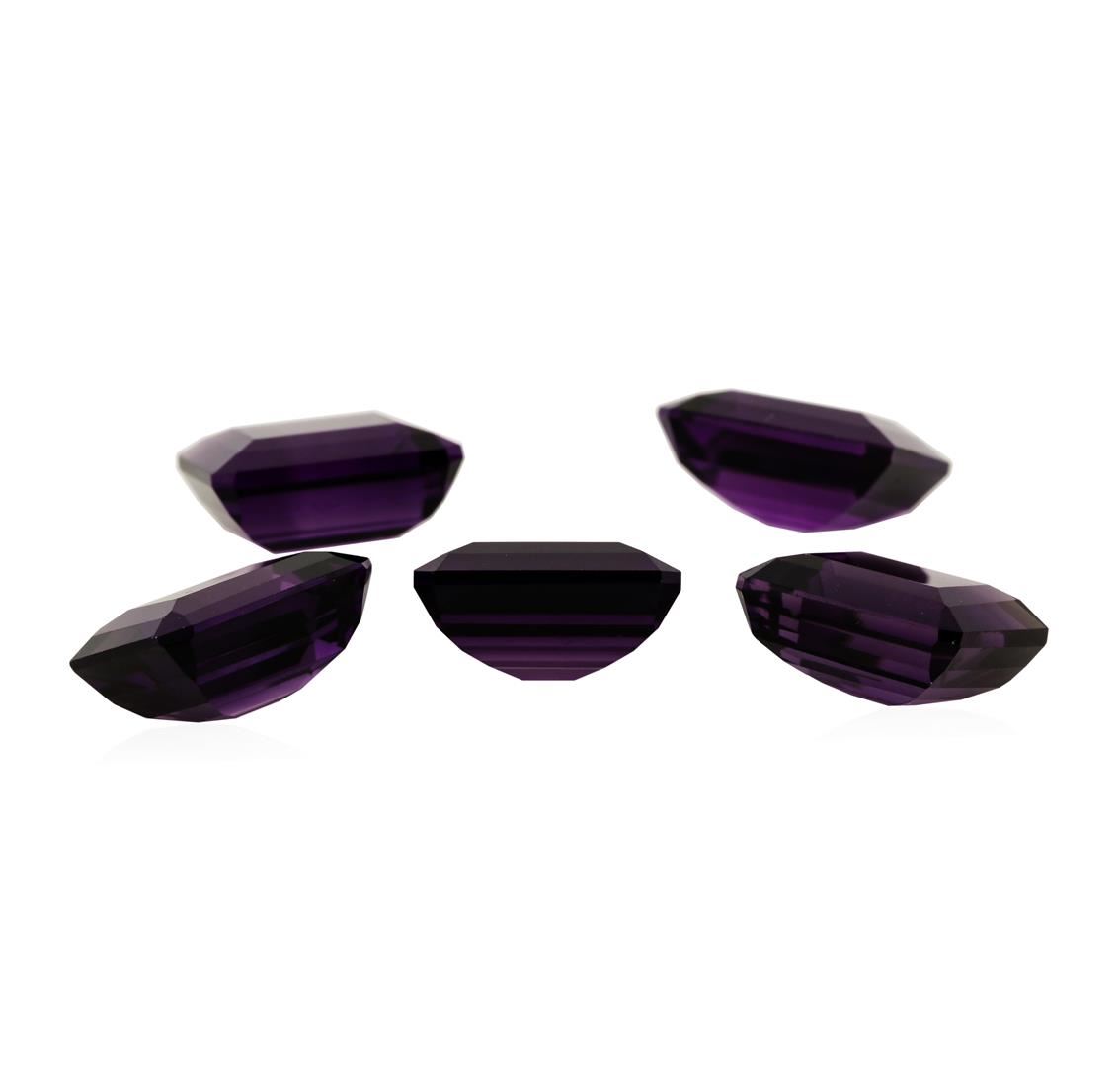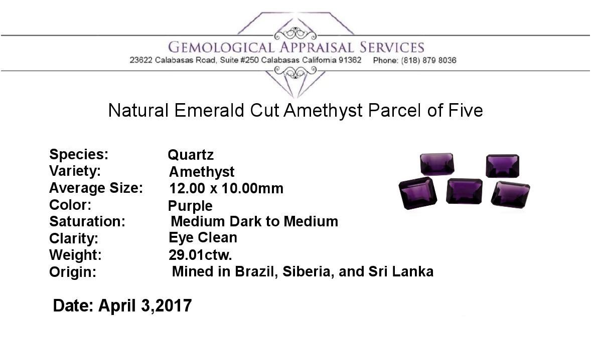 One natural emerald cut amethyst parcel of five with an exact weight of 29.01ctw., clarity is eye clean, purple, medium dark to medium. Gemological Appraisals Services estimates the retail value at $986.34 GAS Appraised.
