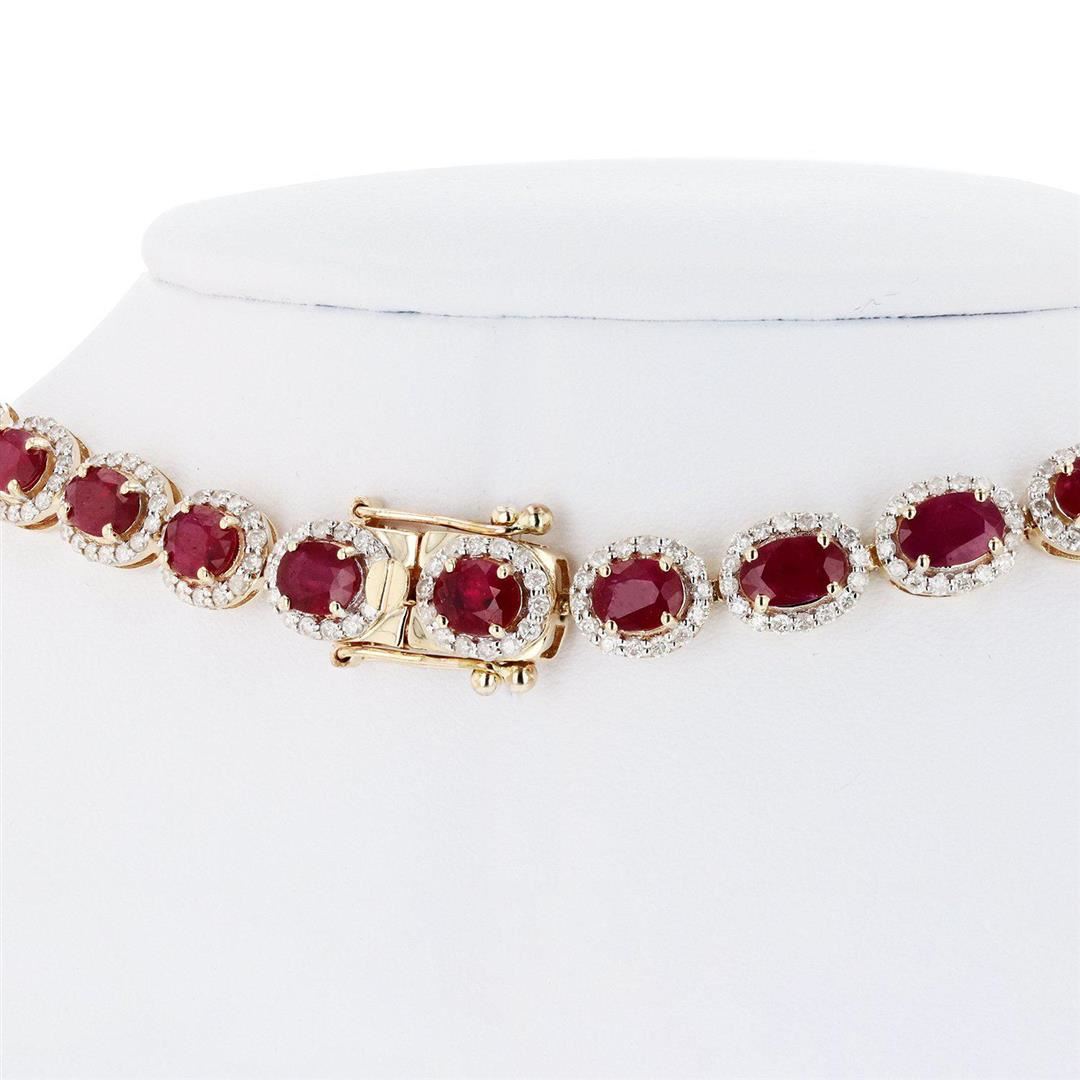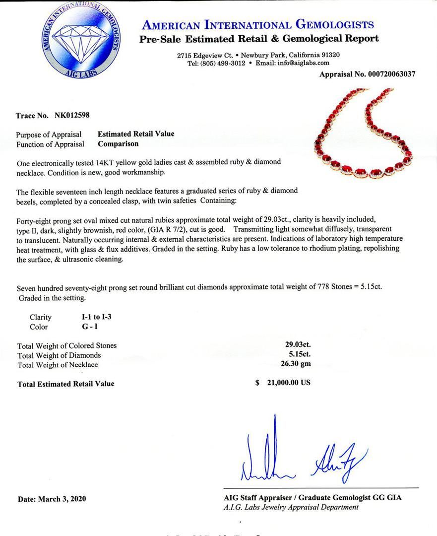 29.03ctw Ruby and 5.15ctw Diamond 14K Yellow Gold Necklace. One electronically tested 14KT yellow gold ladies cast and assembled ruby and diamond necklace. Condition is new, good workmanship. The flexible seventeen inch length necklace features a graduated series of ruby and diamond bezels, completed by a concealed clasp, with twin safeties Containing: Forty-eight prong set oval mixed cut natural rubies approximate total weight of 29.03ct., clarity is heavily included, type II, dark, slightly brownish, red color, (GIA R 7/2), cut is good. Transmitting light somewhat diffusely, transparent to translucent. Naturally occurring internal and external characteristics are present. Indications of laboratory high temperature heat treatment, with glass and flux additives. Graded in the setting. Ruby has a low tolerance to rhodium plating, repolishing the surface, and ultrasonic cleaning. Seven hundred seventy-eight prong set round brilliant cut diamonds approximate total weight of 778 Stones = 5.15ct. Graded in the setting. Clarity I-1 to I-3 Color G - I Total Weight of Colored Stones 29.03ct. Total Weight of Diamonds 5.15ct. Total Weight of Necklace 26.30 gm