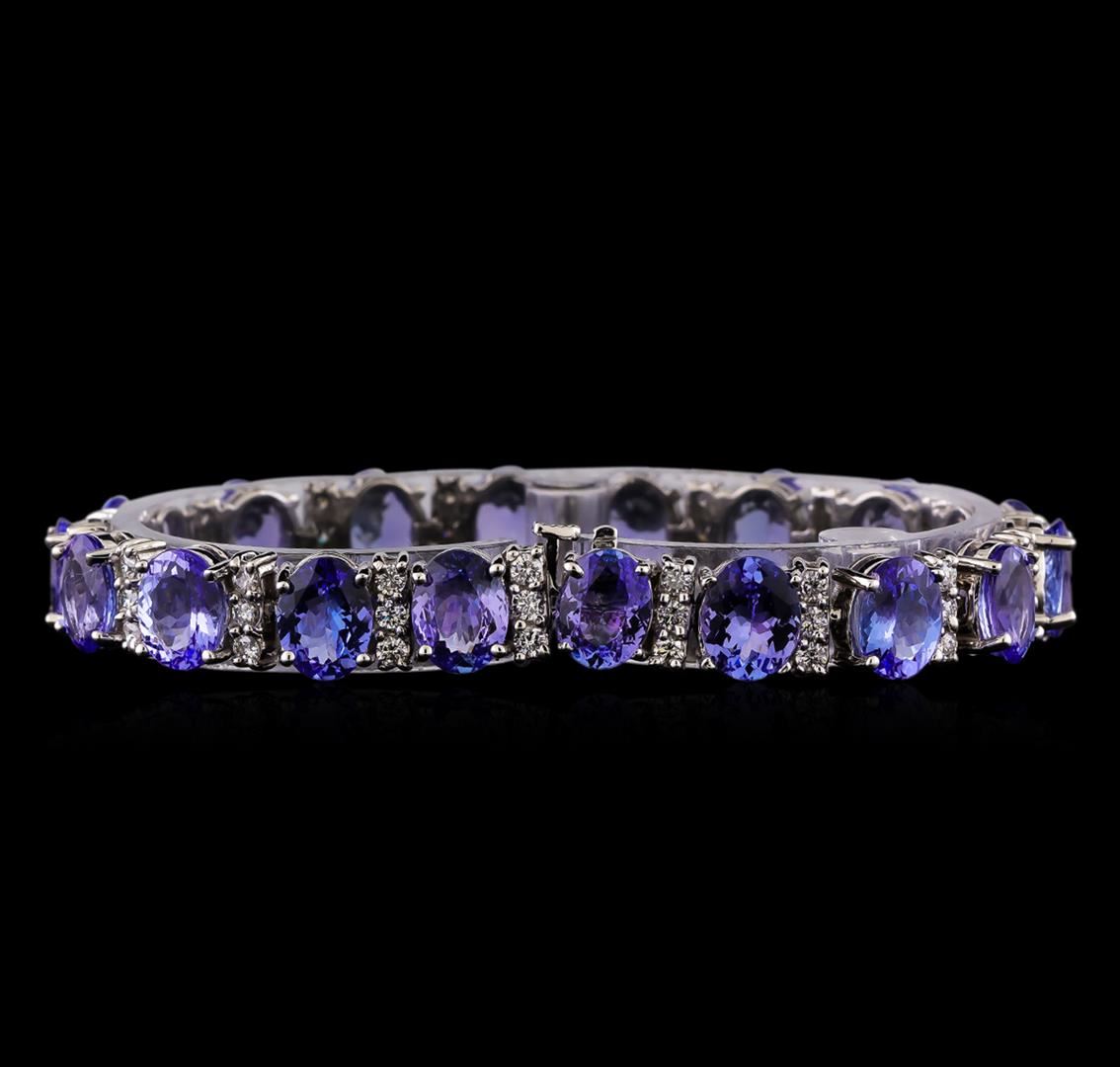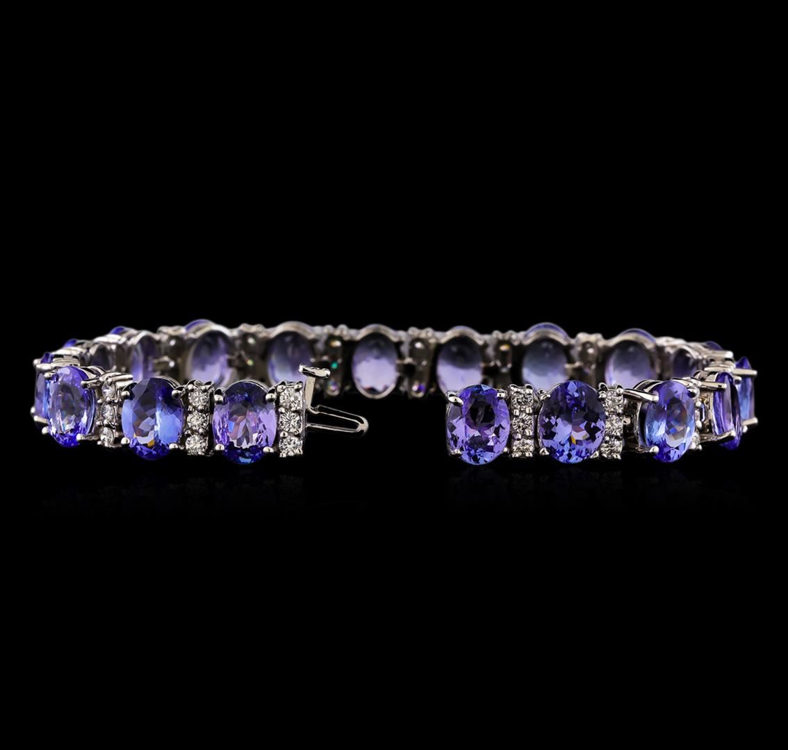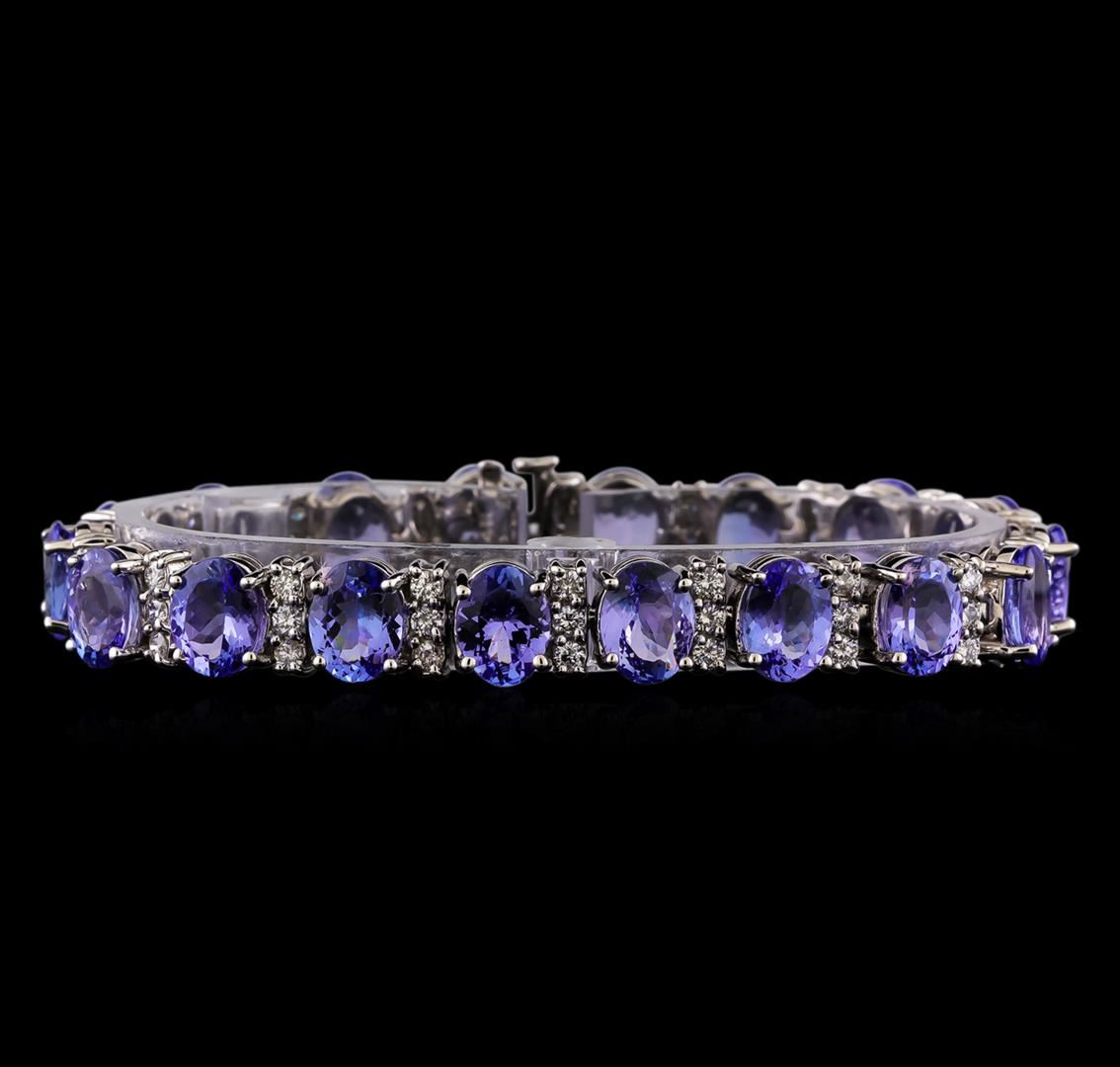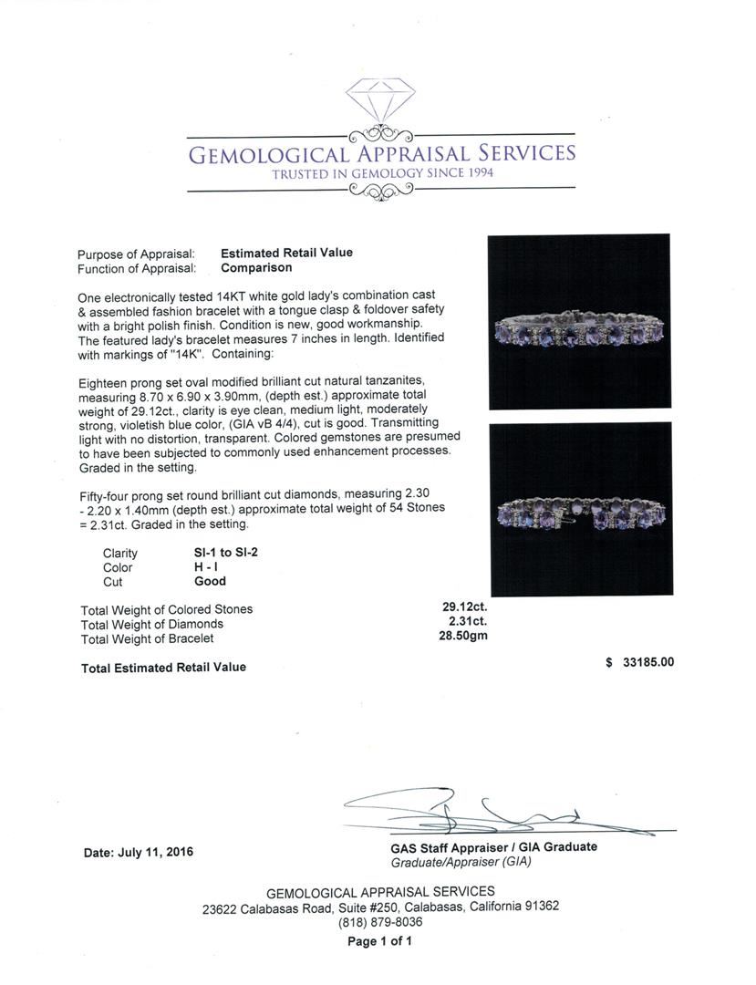 One electronically tested 14KT white gold lady's combination cast & assembled fashion bracelet with a tongue clasp & foldover safety with a bright polish finish. The featured lady's bracelet measures 7 inches in length. Identified with markings of '14K'. Condition is new, good workmanship. Containing: Eighteen prong set oval modified brilliant cut natural tanzanites, measuring 8.70 x 6.90 x 3.90mm, (depth est.) approximate total weight of 29.12ct., clarity is eye clean, medium light, moderately strong, violetish blue color, (GIA vB 4/4), cut is good. Transmitting light with no distortion, transparent. Colored gemstones are presumed to have been subjected to commonly used enhancement processes. Graded in the setting. Fifty-Four prong set round brilliant cut diamonds, measuring 2.30 - 2.20 x 1.40mm (depth est.) approximate total weight of 54 Stones = 2.31ct. Graded in the setting. Clarity SI-1 to SI-2. Color: H - I Cut Good. Total Weight of Colored Stones 29.12ct.. Total Weight of Diamonds 2.31ct.. Total Weight of Bracelet 28.50gm. GAS Appraised at $33,185.00.