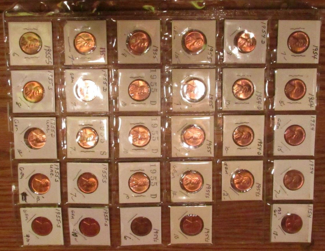(29) 1954-55S Lincoln Cents. All Red Unc to Gem BU. Priced in 1 1/2" x 1 1/2" flips and plastic page to sell at $200++. Typical "Doc" pricing on this group.