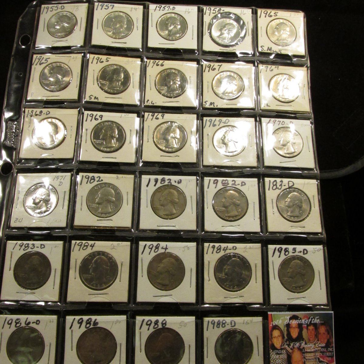 (29) 1955D-1988D Washington Quarters, Several Silver, the vast majority are BU. Stored in a 1 1/2" x 1 1/2" 30-pocket Plastic page.