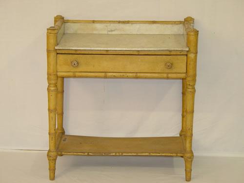 29" 19TH CENT. ENGLISH BAMBOO CARVED MARBLE TOP 1 DRAWER WASHSTAND IN MUSTARD YELLOW PAINT - WEAR, WORMWOOD, IMPERFECTIONS