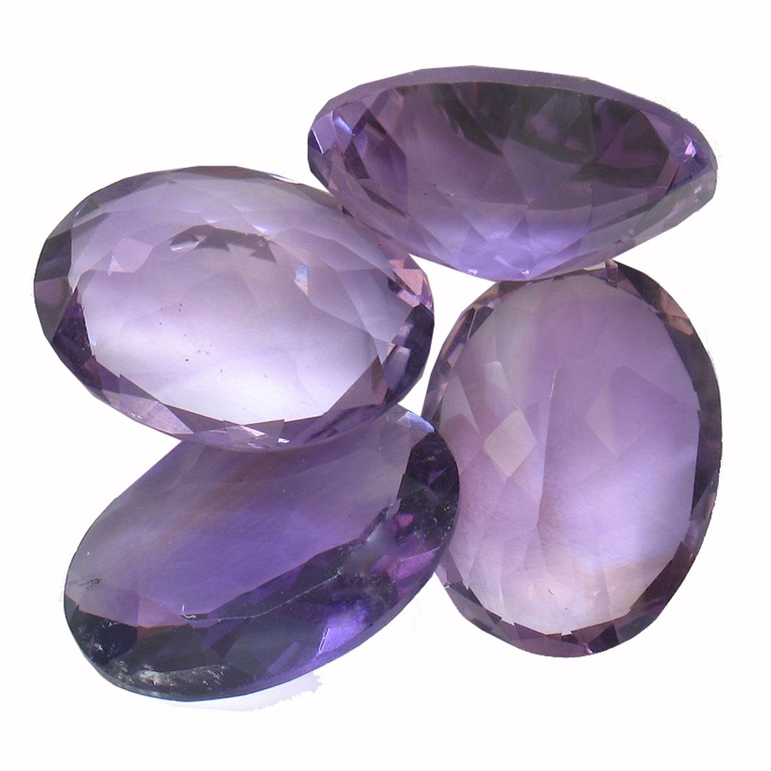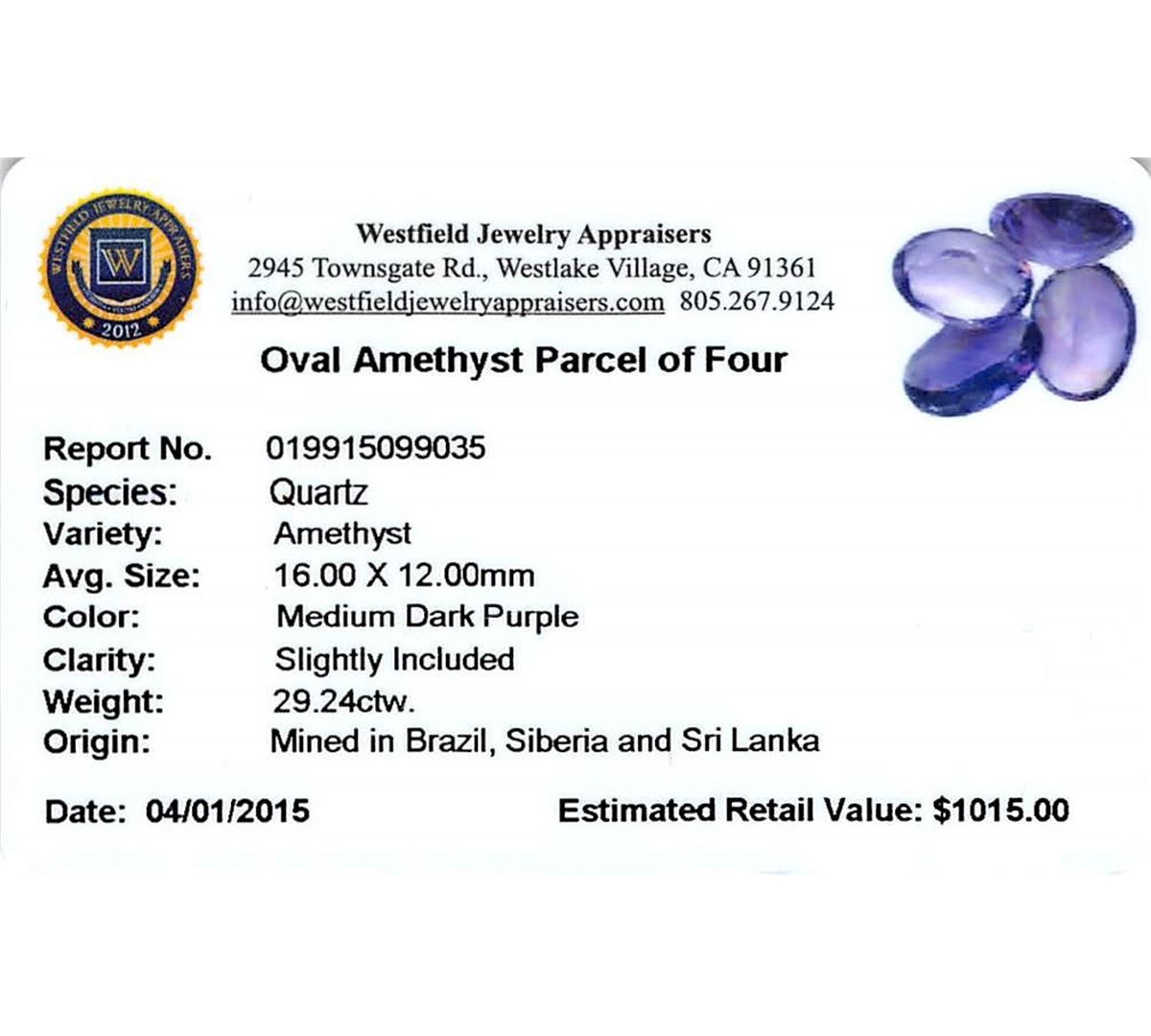 Four oval mixed cut natural amethysts exact total weight 29.24ct., clarity is slightly included, type II, medium dark, very slightly grayish, purple color, (GIA P 6/3), cut is good. Westfield Appraised at $1,015.00.