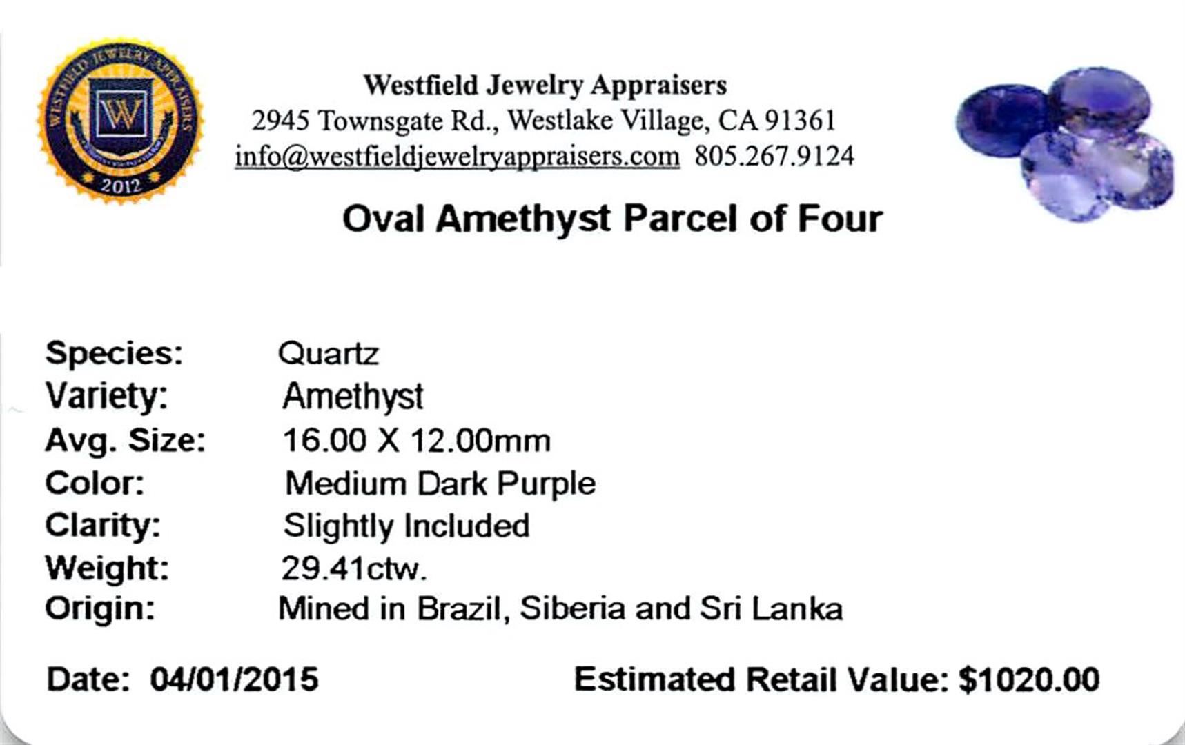 Four oval mixed cut natural amethysts exact total weight 29.41ct., clarity is slightly included, type II, medium dark, very slightly grayish, purple color, (GIA P 6/3), cut is good. Westfield Appraised at $1,020.00.
