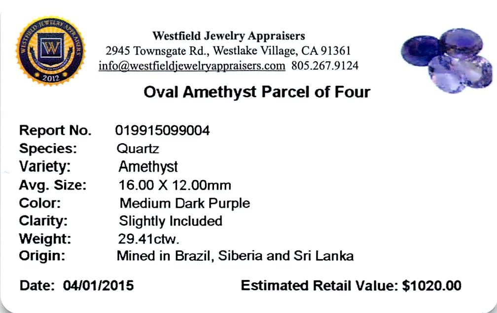 Four oval mixed cut natural amethysts exact total weight 29.41ct., clarity is slightly included, type II, medium dark, very slightly grayish, purple color, (GIA P 6/3), cut is good. Westfield Appraised at $1,020.00.