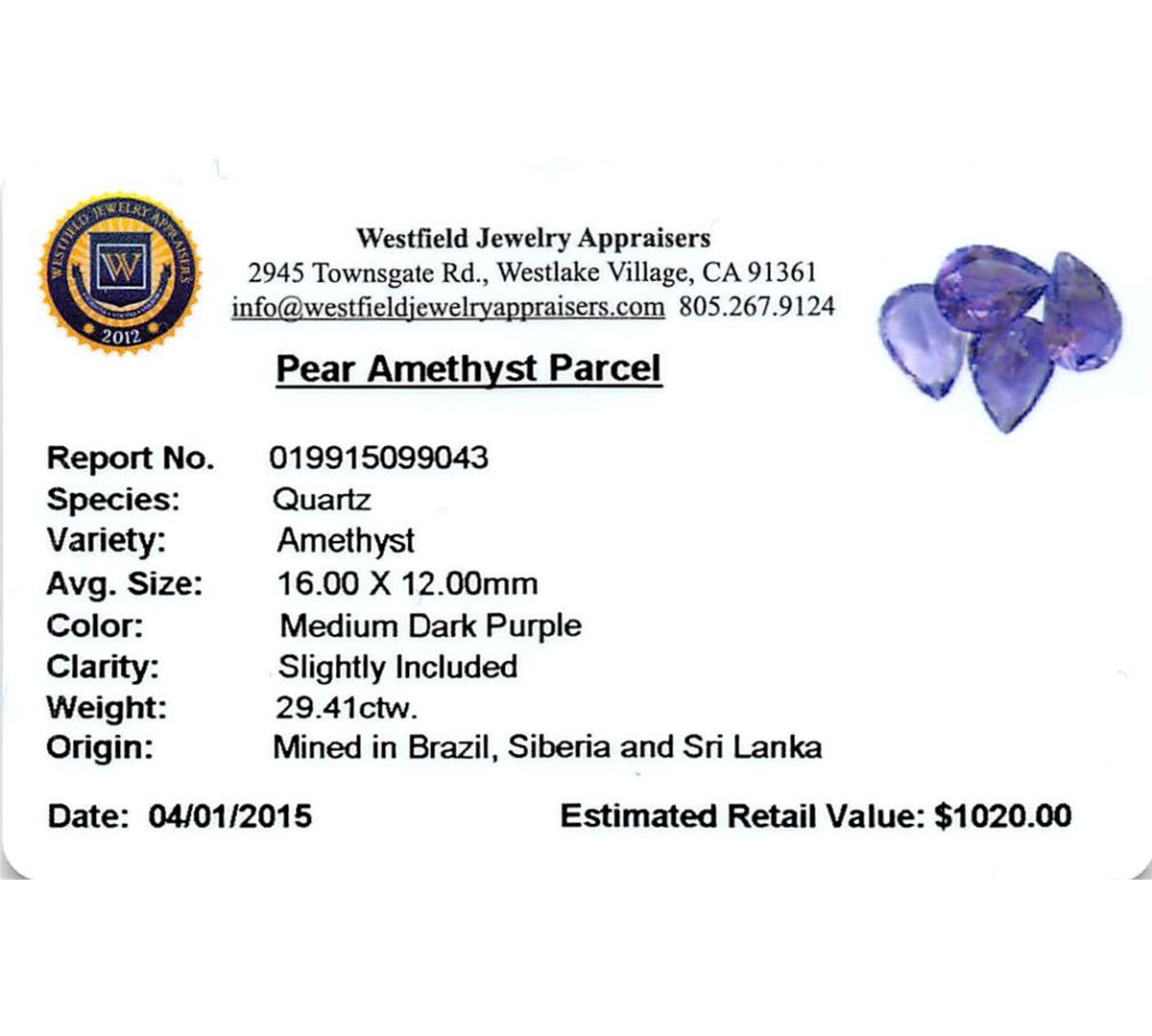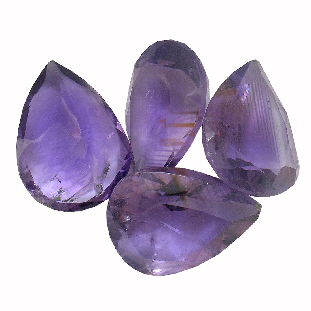 Four pear mixed cut natural amethysts exact total weight 29.41ct., clarity is slightly included, type II, medium dark, very slightly grayish, purple color, (GIA P 6/3), cut is good. Westfield Appraised at $1,020.00.