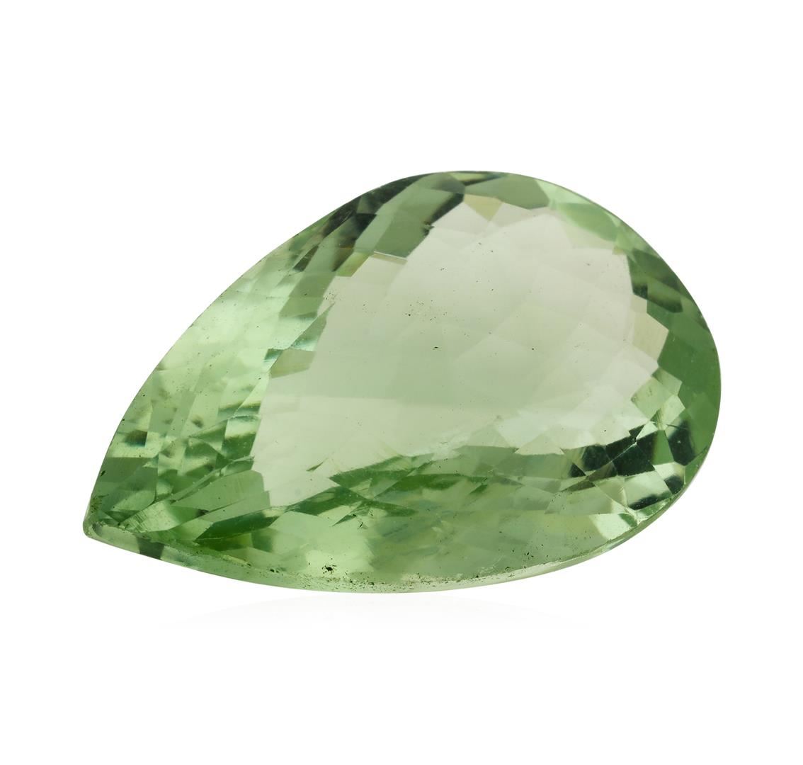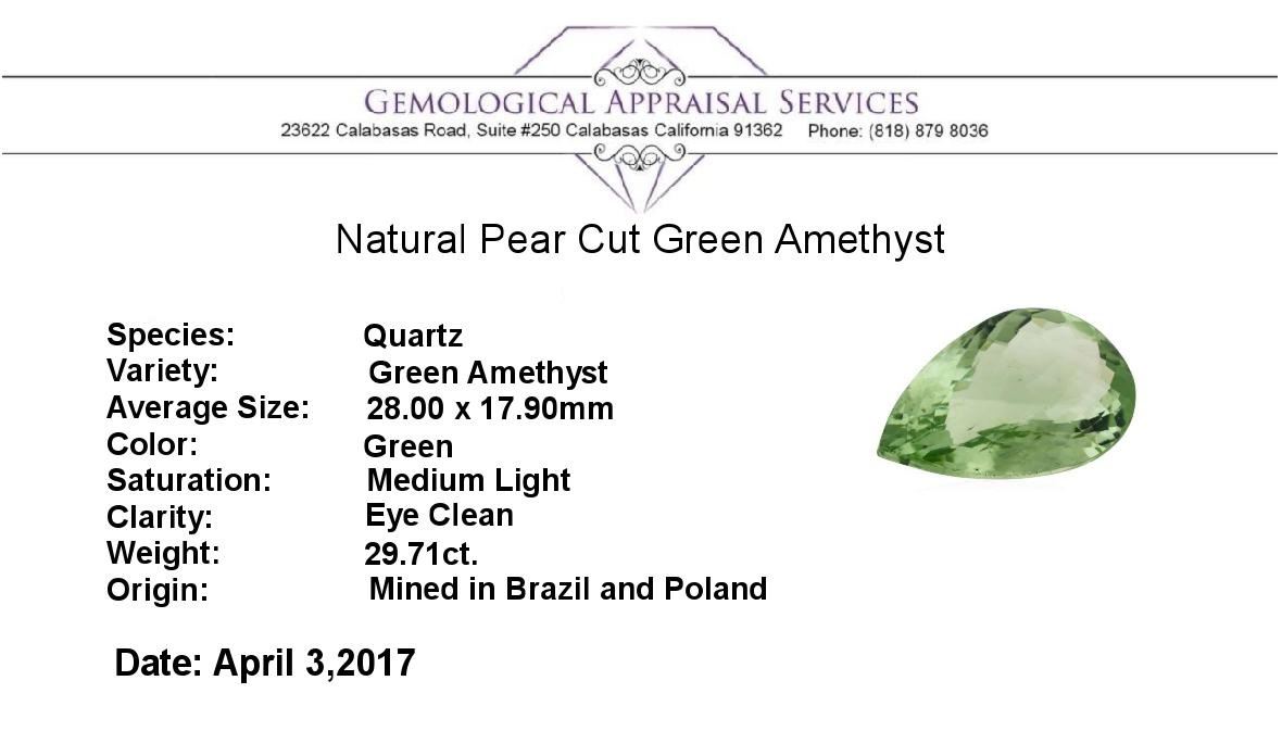 One natural pear cut green amethyst with an exact weight of 29.71ct., clarity is eye clean, green, medium light. Gemological Appraisals Services estimates the retail value at $594.2 GAS Appraised.
