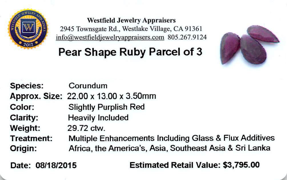 Three pear mixed cut natural rubies, measuring 22.00 x 13.00 x 3.50mm, exact total weight 29.72ct., clarity is heavily included, type II, medium dark, very slightly brownish, slightly purplish red color, (GIA slpR 6/3), cut is good. Transmitting light somewhat diffusely, transparent to translucent. Naturally occurring internal & external characteristics are present. Indications of laboratory high temperature heat treatment, with glass & flux additives. Ruby has a low tolerance to rhodium plating, repolishing the surface, & ultrasonic cleaning. Westfield Appraised at $3,795.00.