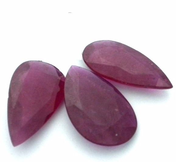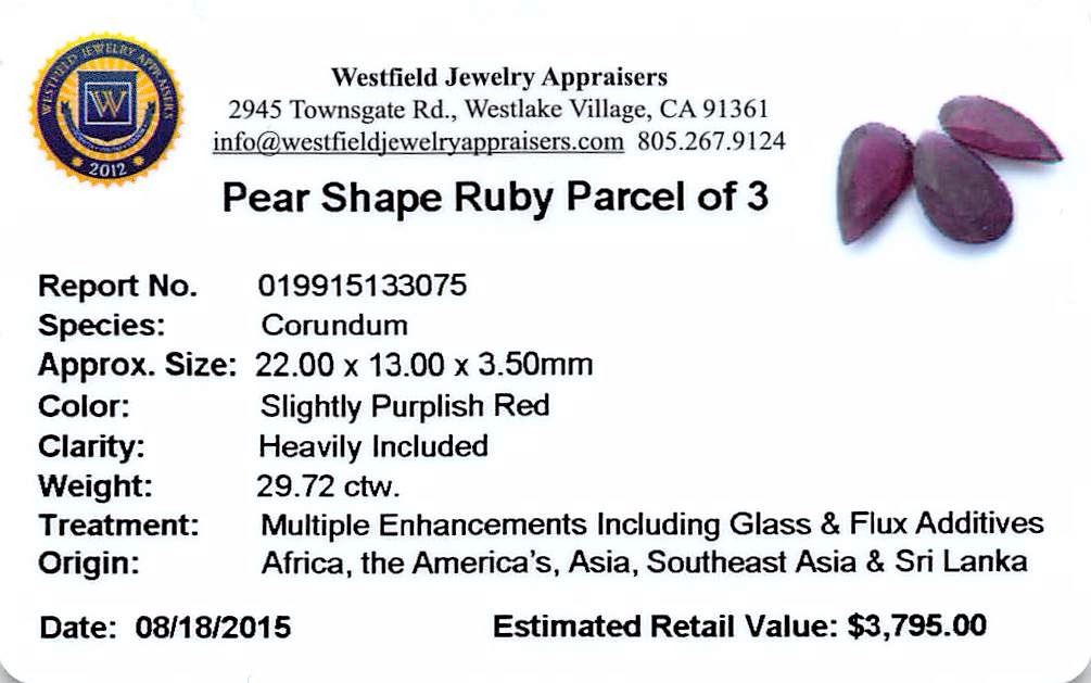 Three pear mixed cut natural rubies, measuring 22.00 x 13.00 x 3.50mm, exact total weight 29.72ct., clarity is heavily included, type II, medium dark, very slightly brownish, slightly purplish red color, (GIA slpR 6/3), cut is good. Transmitting light somewhat diffusely, transparent to translucent. Naturally occurring internal & external characteristics are present. Indications of laboratory high temperature heat treatment, with glass & flux additives. Ruby has a low tolerance to rhodium plating, repolishing the surface, & ultrasonic cleaning. Westfield Appraised at $3,795.00.