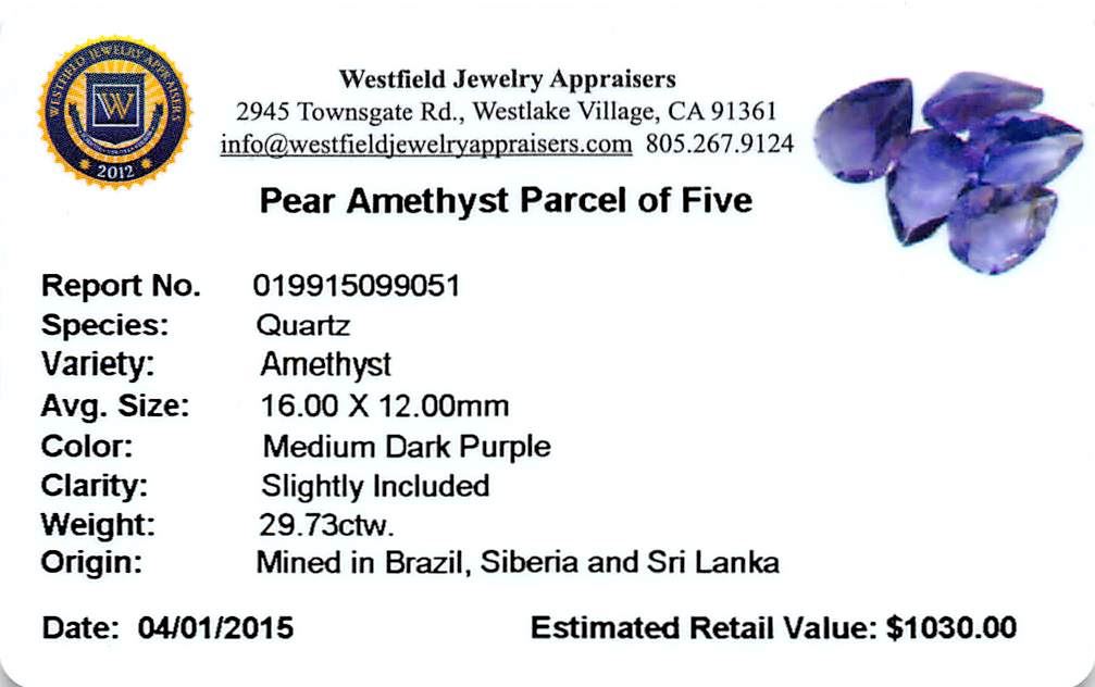Five pear mixed cut natural amethysts exact total weight 29.73ct., clarity is slightly included, type II, medium dark, very slightly grayish, purple color, (GIA P 6/3), cut is good. Westfield Appraised at $1,030.00.