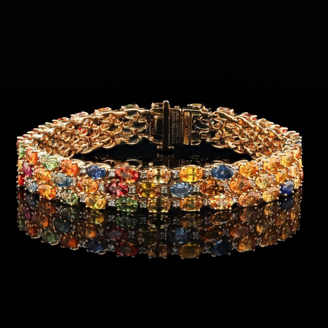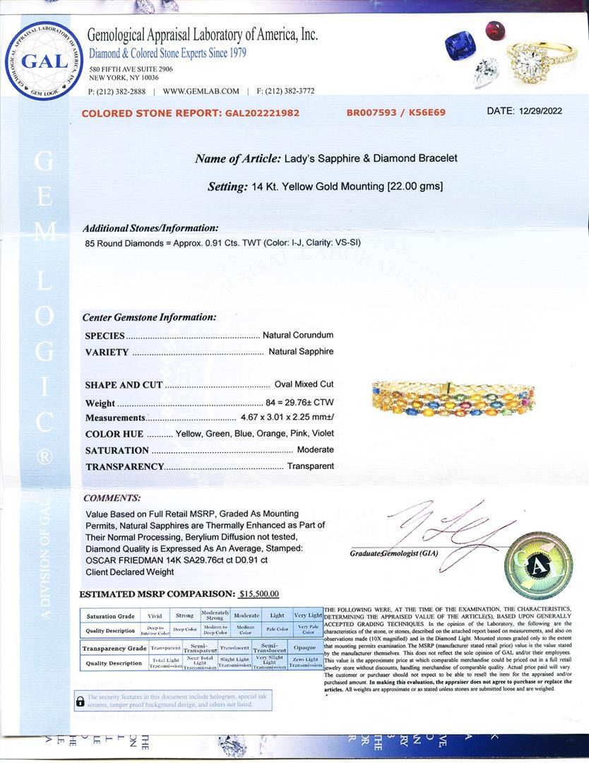 29.76ctw Multi-Color Sapphire and 0.91ctw Diamond 14K Yellow Bracelet. Name of Article: Lady's Sapphire and Diamond Bracelet Setting: 14 Kt. Yellow Gold Mounting [22.00 gms] Additional Stones/Information: 85 Round Diamonds = Approx. 0.91 Cts. TWT (Color: I-J, Clarity: VS-SI) Center Gemstone Information: SPECIES: Natural Corundum VARIETY: Natural Sapphire SHAPE AND CUT: Oval Mixed Cut Weight: 84 = 29.761 CTW Measurements: 4.67 x 3.01 x 2.25 mm COLOR HUE: Yellow, Green, Blue, Orange, Pink, Violet SATURATION: Moderate TRANSPARENCY: Transparent
