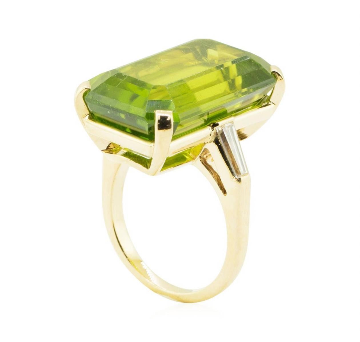 One electronically tested 14KT yellow gold lady's combination cast & assembled 3-stone fashion ring with a cathedral shank with a bright polish finish. The featured lady's ring has a shank measuring 2.00 millimeters in width. Condition is used, good workmanship. Containing: One prong set emerald standard step cut natural peridot, measuring 21.83 x 13.80 x 9.88mm, (depth est.) 10%. bulge factor, approximate weight of 29.50ct., clarity is eye clean, medium, very slightly grayish, yellowish green color, (GIA yG 5/3), cut is very good. Transmitting light with a minimum of distortion, transparent. Gemstone has surface abrasions on the table. Colored gemstones are presumed to have been subjected to commonly used enhancement processes. Graded in the setting. Two channel set baguette cut (tapered) diamonds, measuring from 6.15 x 2.20 x 1.87mm (depth est.) to 6.20 x 2.25 x 1.91mm (depth est.) approximate total weight of 2 Stones = 0.40ct. Graded in the setting. Color G - H Clarity VS-1 to VS-2 Cut Very Good. Total Weight of Colored Stones 29.50ct.. Total Weight of Diamonds 0.40ct.. Total Weight of Ring 12.20gm GAS Appraised at $5685.00. GAS Appraised.