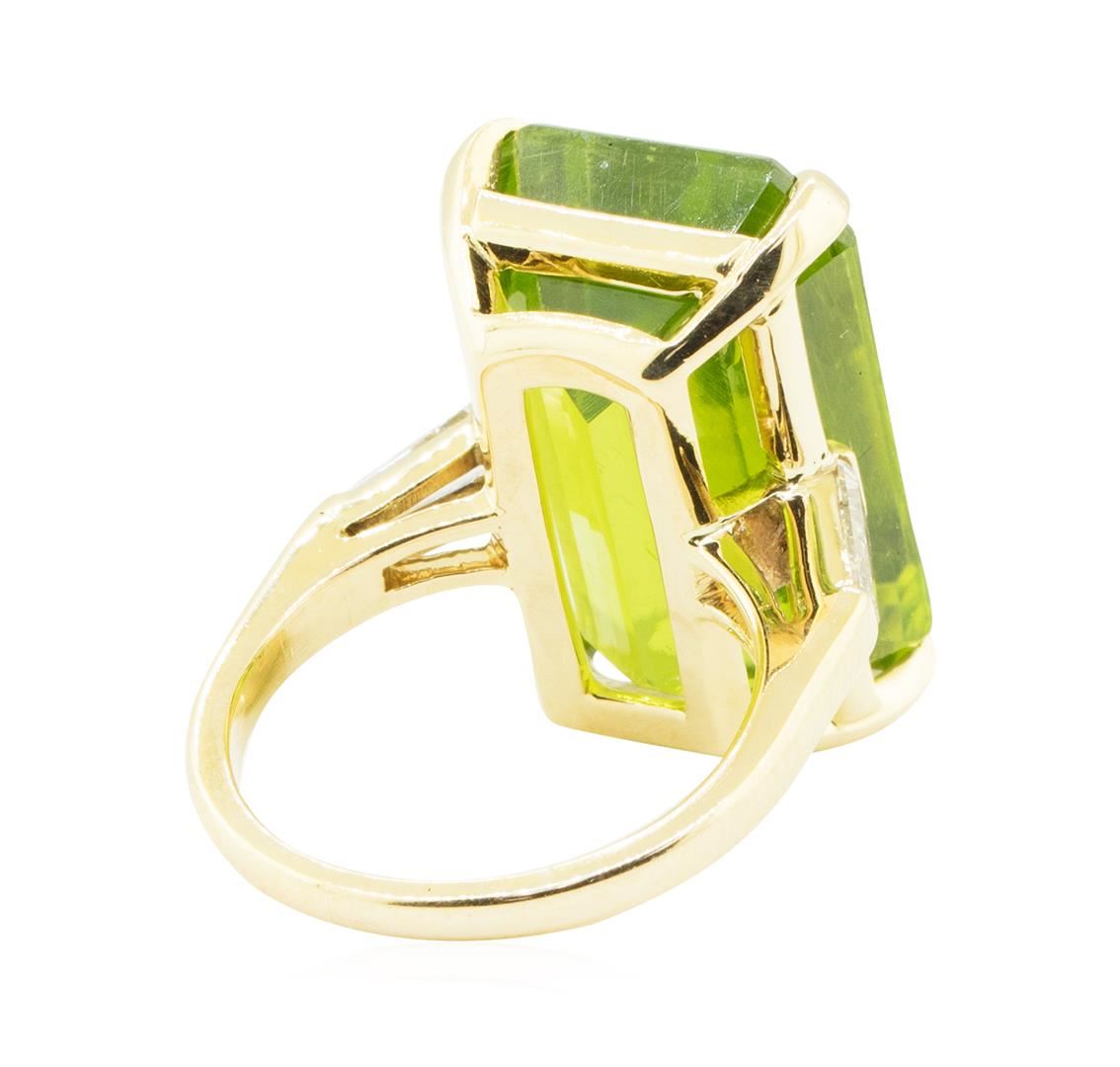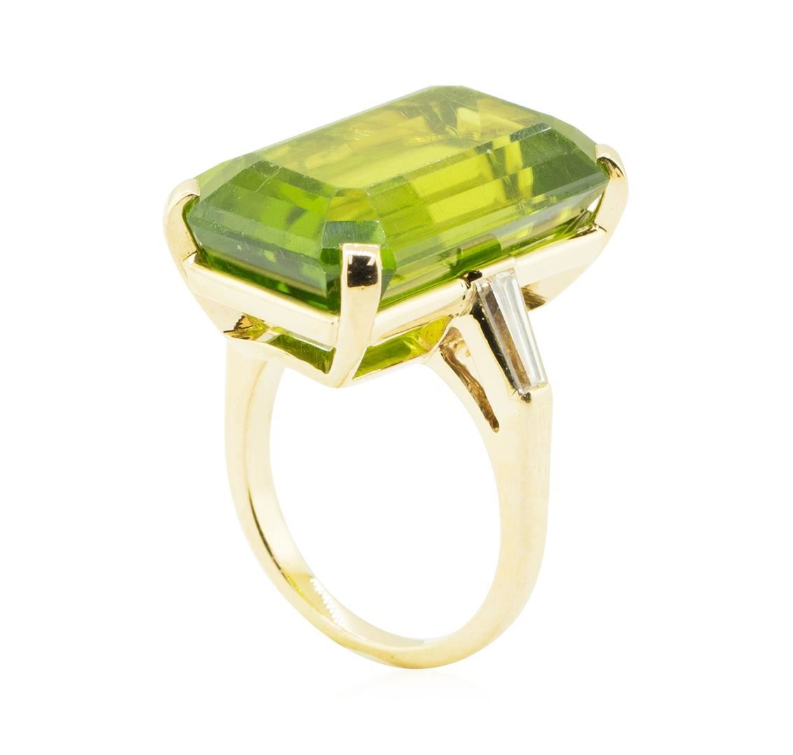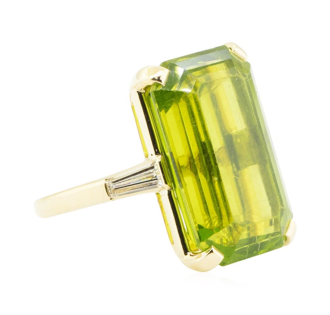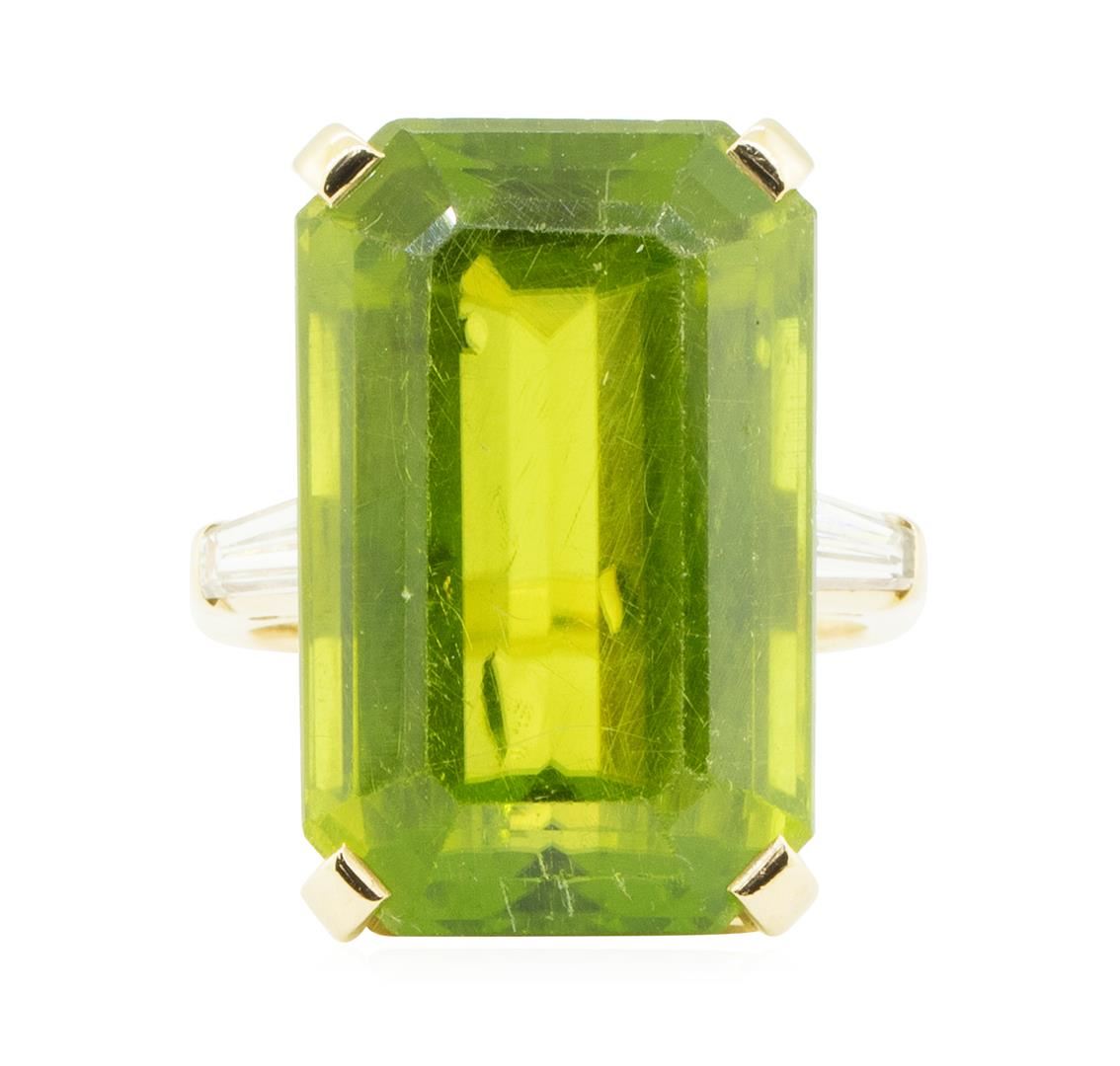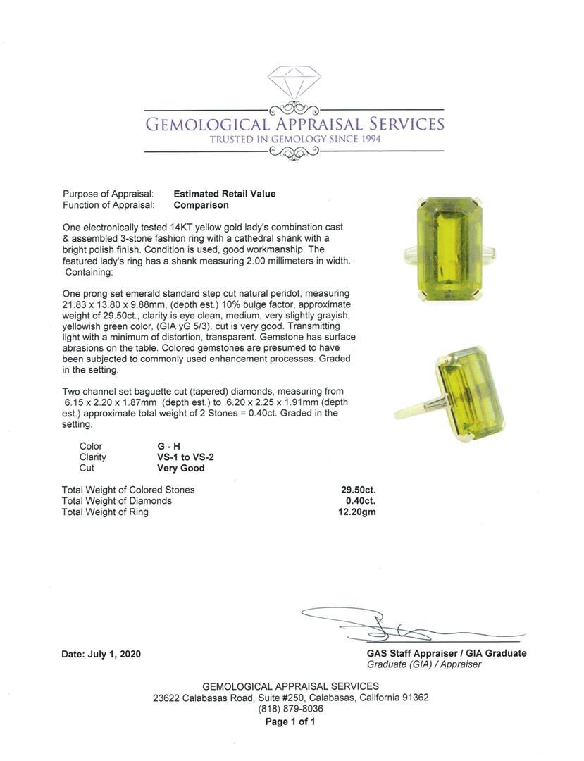 One electronically tested 14KT yellow gold lady's combination cast & assembled 3-stone fashion ring with a cathedral shank with a bright polish finish. The featured lady's ring has a shank measuring 2.00 millimeters in width. Condition is used, good workmanship. Containing: One prong set emerald standard step cut natural peridot, measuring 21.83 x 13.80 x 9.88mm, (depth est.) 10%. bulge factor, approximate weight of 29.50ct., clarity is eye clean, medium, very slightly grayish, yellowish green color, (GIA yG 5/3), cut is very good. Transmitting light with a minimum of distortion, transparent. Gemstone has surface abrasions on the table. Colored gemstones are presumed to have been subjected to commonly used enhancement processes. Graded in the setting. Two channel set baguette cut (tapered) diamonds, measuring from 6.15 x 2.20 x 1.87mm (depth est.) to 6.20 x 2.25 x 1.91mm (depth est.) approximate total weight of 2 Stones = 0.40ct. Graded in the setting. Color G - H Clarity VS-1 to VS-2 Cut Very Good. Total Weight of Colored Stones 29.50ct.. Total Weight of Diamonds 0.40ct.. Total Weight of Ring 12.20gm GAS Appraised at $5685.00. GAS Appraised.