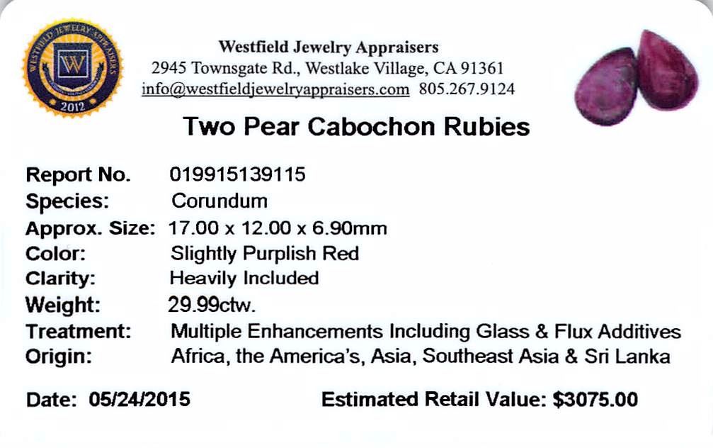Two pear cabochon cut natural rubies, measuring 17.00 x 12.00 x 6.90mm, exact total weight 29.99ct., clarity is heavily included, type II, dark, very slightly brownish, slightly purplish red color, (GIA slpR 7/3), cut is good. Transmitting light diffusely, opaque. Naturally occurring internal & external characteristics are present. Indications of laboratory high temperature heat treatment, with glass & flux additives. Ruby has a low tolerance to rhodium plating, repolishing the surface, & ultrasonic cleaning. Westfield Appraised at $3,075.00.