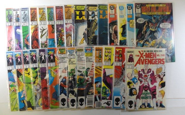 G.I.Joe. Includes: FALLEN ANGELS #1-8 Marvel Comic Lot 1987 The New Mutants/X-Men, Complete Set The X-MEN Vs. The AVENGERS #1-4 Marvel Limited Series 1987, LUGER #1 - #3 Set (NM) Bruce Jones, Bo Hampton, Eclipse Comics, THE SAGA OF RAS AL GHUL #1-4 Very Fine/Near Mint Complete Set 1988, Complete Set of SPELLBOUND #1-6 NM/M Marvel Limited Series 1988 Louise Simonson, Complete Set of G.I. JOE ORDER OF BATTLE #1-4 Marvel Limited Series 1986. Est. Value $50.00 - $75.00.