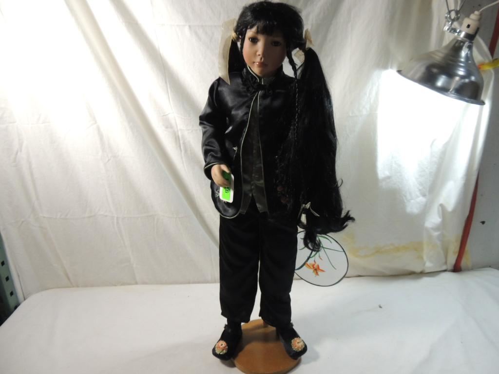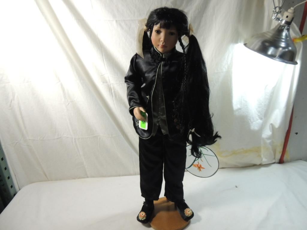 RETIRED DOLL, PARADISE GALLERY DOLLS STANDING WOODEN STAND INCLUDED. SILK? OUTFIT FAN INCLUDED, DECORATIVE BLACK HAIR BROWN EYES, SIGNED AND NUMBERED. COLLECTIBLE GREAT CONDITION AS SHOWN SEE PHOTO FOR MORE DETAILS.