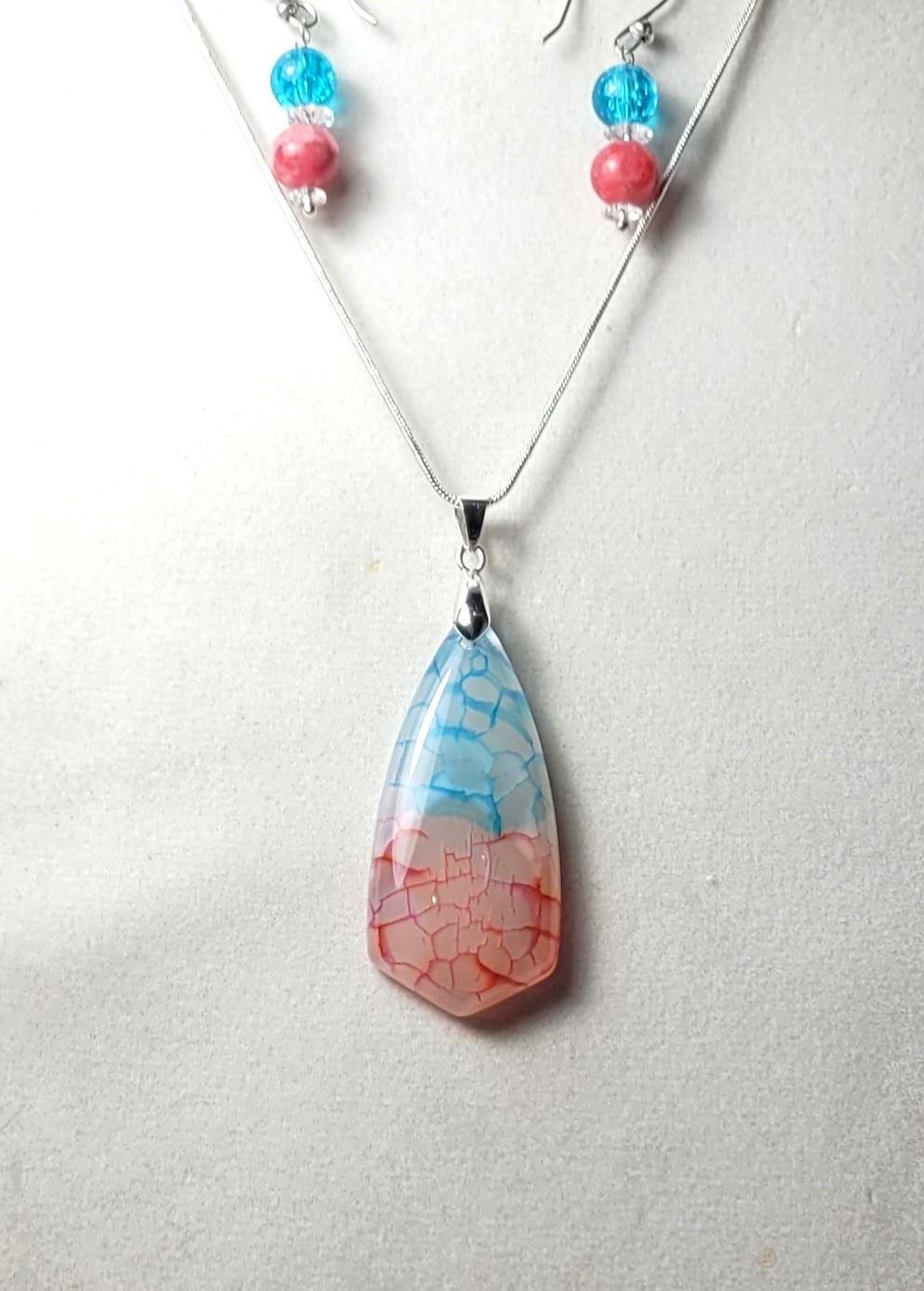 DRAGON'S VEIN 48X 20X 7MM PENDANT ON 18" SNAKE CHAIN & COORDINATING CORAL COLORED JADE & BLUE TITANIUM CRYSTAL DROP EARRINGS. J EWELERY