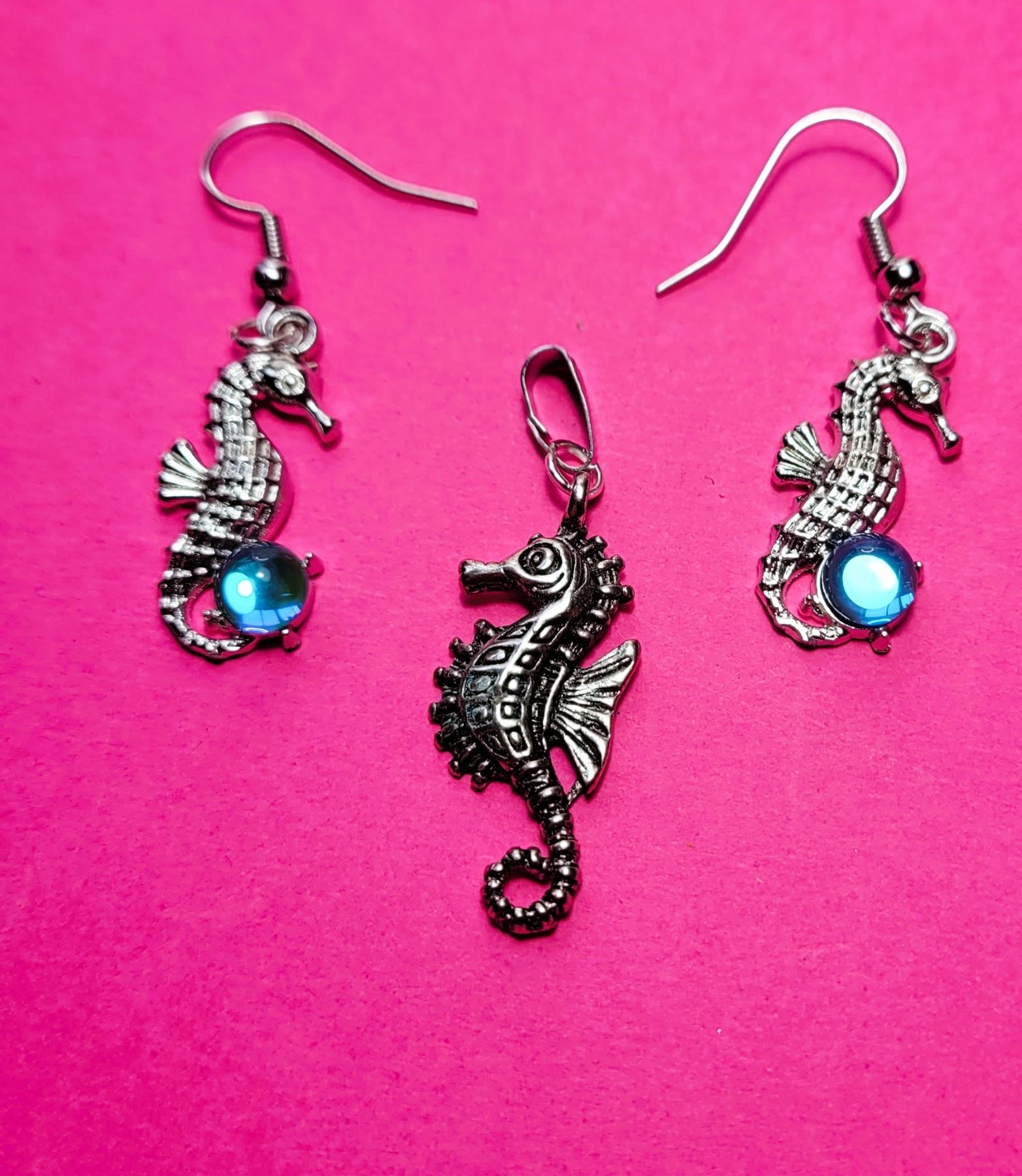 SEAHORSE DROP EARRINGS ON NICKLE FREE FISH HOOK WIRES AND COORDINATING PENDANT. JEWELLERY