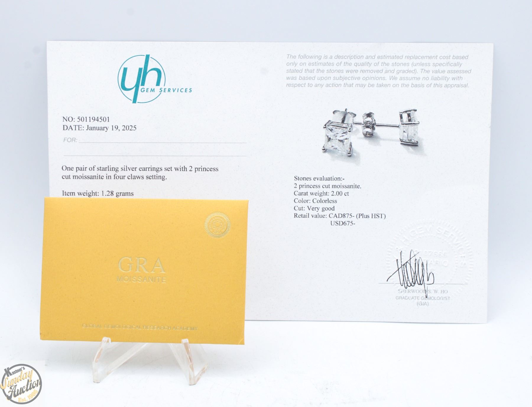 CUT MOISSANITE STONES VVS D COLOR SET IN 4 CLAW BASKET HEAD SET IN 925 SILVER EARRINGS RETAIL VALUE $875.00**ALL ITEMS MUST BE REMOVED BY 5PM SATURDAY, JULY 19TH 2025. ALL REMAINING ITEMS WILL BE SUBJECT TO A $6.00 PER DAY STORAGE CHARGE. ANY ITEMS REMAINING AFTER MONDAY, AUGUST 4TH, 2025 WILL BE CONSIDERED FORFEITED. NO REFUNDS WILL BE ISSUED FOR FORFEITED ITEMS. TO SCHEDULE A PICK UP APPOINTMENT CLICK HERE