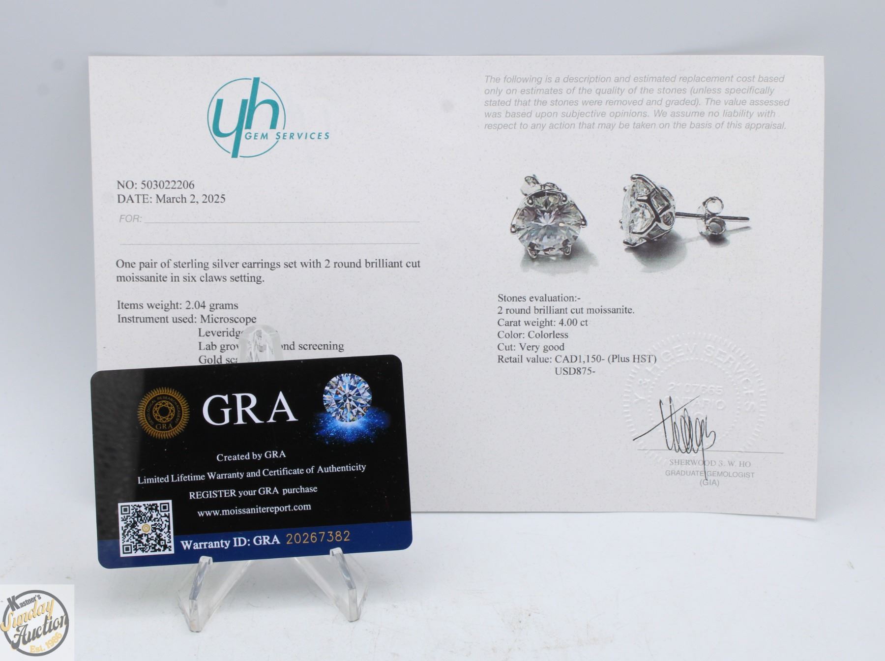 BRILLIANT CUT MOISSANITE STONES VVS D COLOR SET IN 6 CLAW FILAGREE HEAD SET IN 925 SILVER EARRINGS RETAIL VALUE $1,150.00**ALL ITEMS MUST BE REMOVED BY 5PM SATURDAY, JULY 19TH 2025. ALL REMAINING ITEMS WILL BE SUBJECT TO A $6.00 PER DAY STORAGE CHARGE. ANY ITEMS REMAINING AFTER MONDAY, AUGUST 4TH, 2025 WILL BE CONSIDERED FORFEITED. NO REFUNDS WILL BE ISSUED FOR FORFEITED ITEMS. TO SCHEDULE A PICK UP APPOINTMENT CLICK HERE