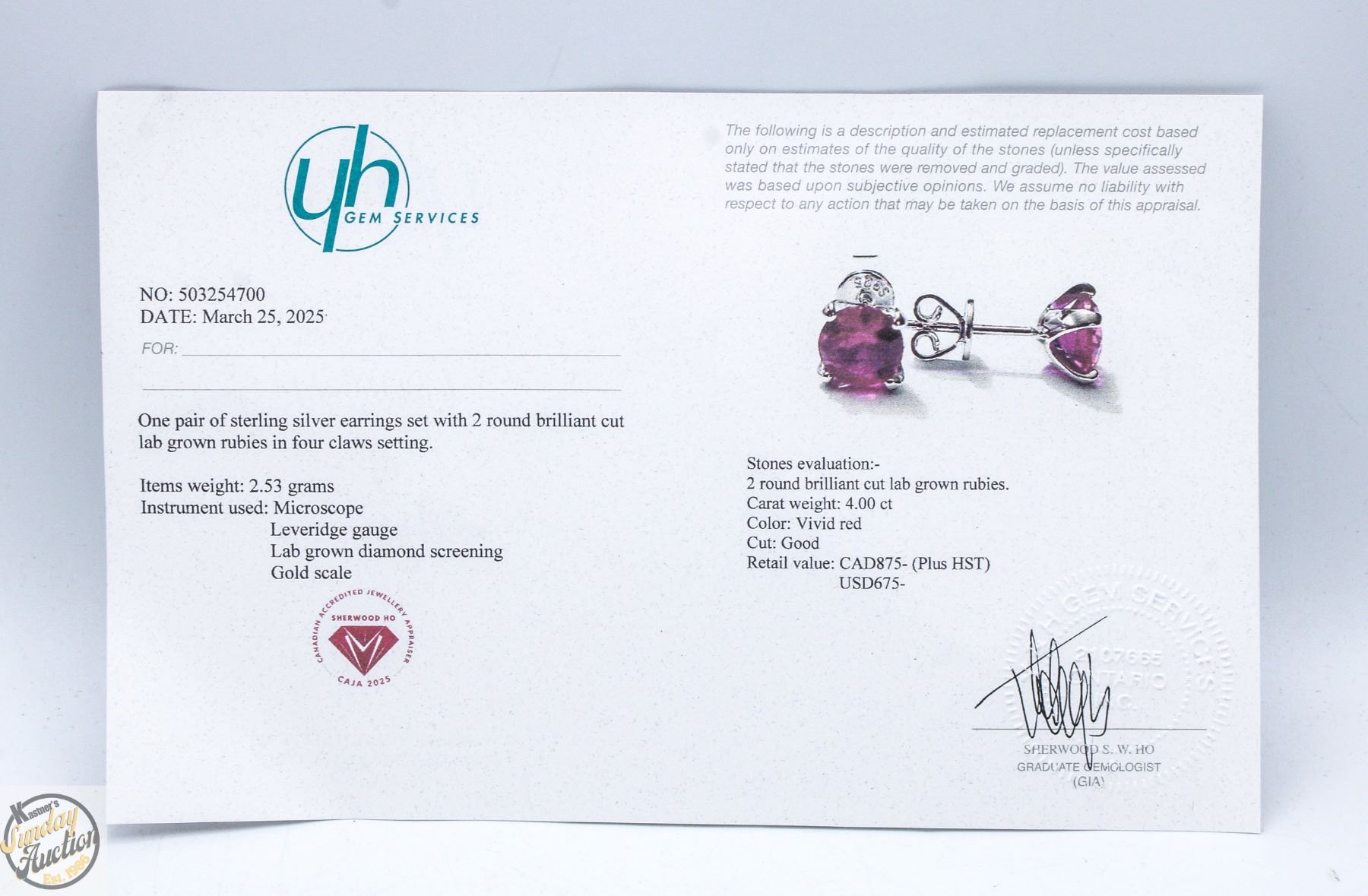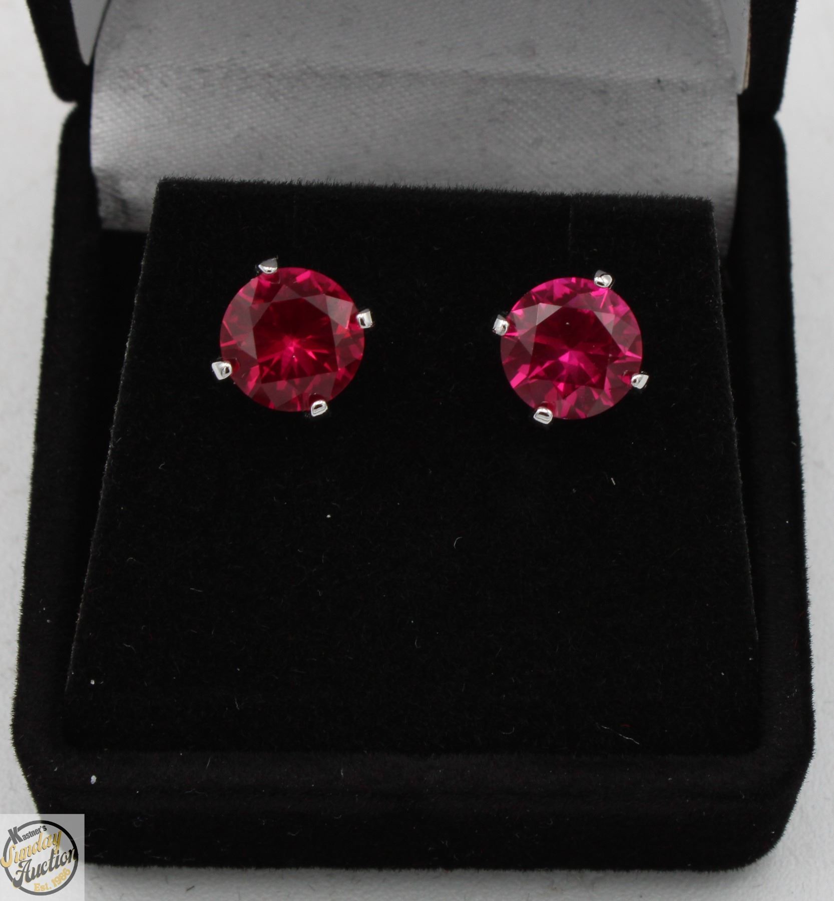 GROWN RUBIES CLEAR WITH RED COLOR SET IN 4 CLAW V HEAD SET IN 925 SILVER EARRINGS RETAIL VALUE $875.00**ALL ITEMS MUST BE REMOVED BY 5PM SATURDAY, JULY 19TH 2025. ALL REMAINING ITEMS WILL BE SUBJECT TO A $6.00 PER DAY STORAGE CHARGE. ANY ITEMS REMAINING AFTER MONDAY, AUGUST 4TH, 2025 WILL BE CONSIDERED FORFEITED. NO REFUNDS WILL BE ISSUED FOR FORFEITED ITEMS. TO SCHEDULE A PICK UP APPOINTMENT CLICK HERE