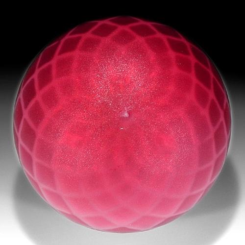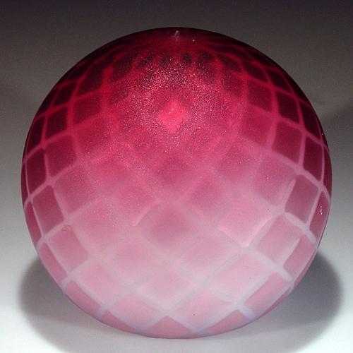 Miscellaneous hollow satin frosted red paperweight, with a pattern of spaced, crisscrossed, curved red-to-white lines, which extend from the top of the piece to the base. The surface of the paperweight is dark red at the top, fading to pale pink at the base. Diameter 3 7/8". NO RESERVE