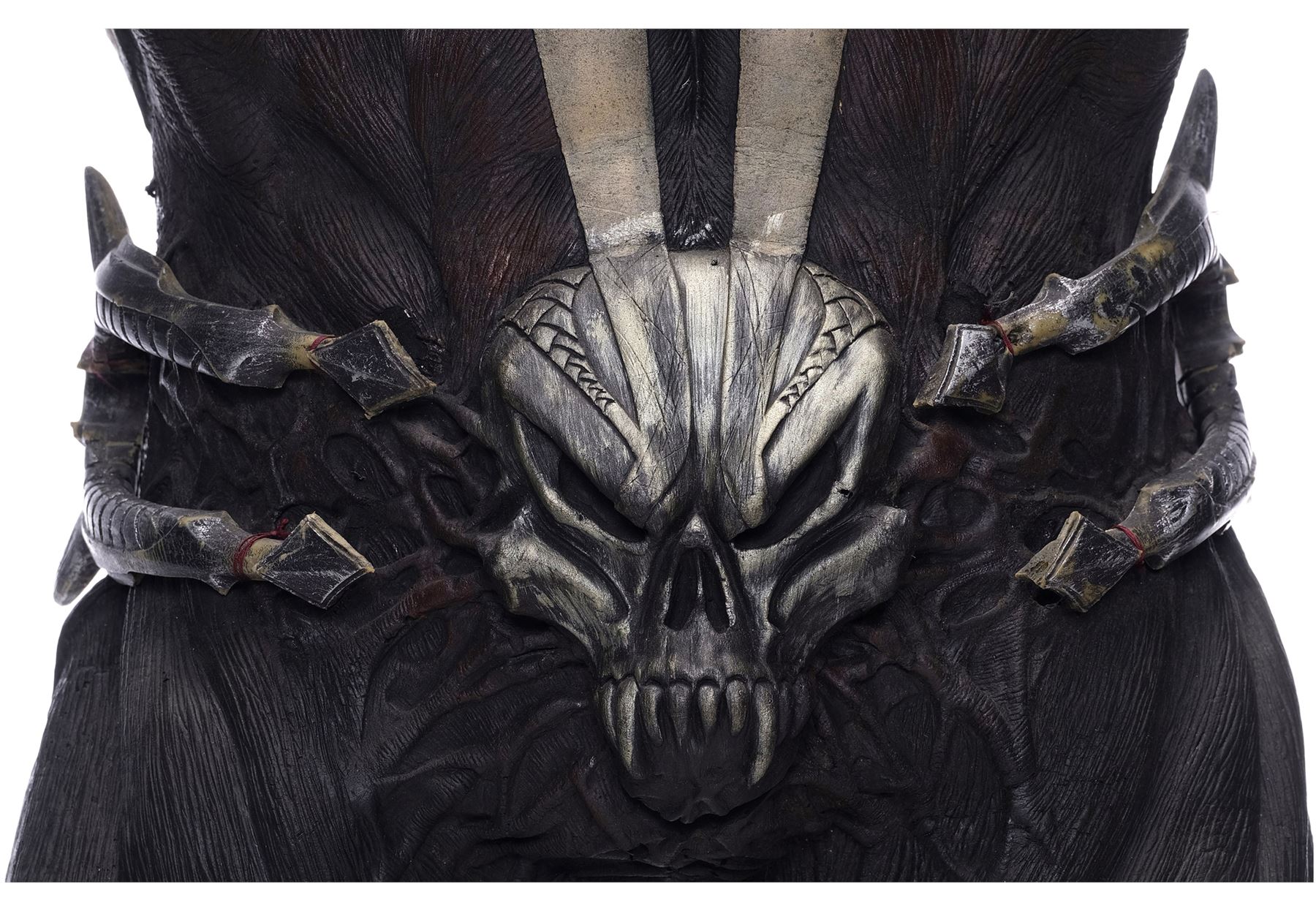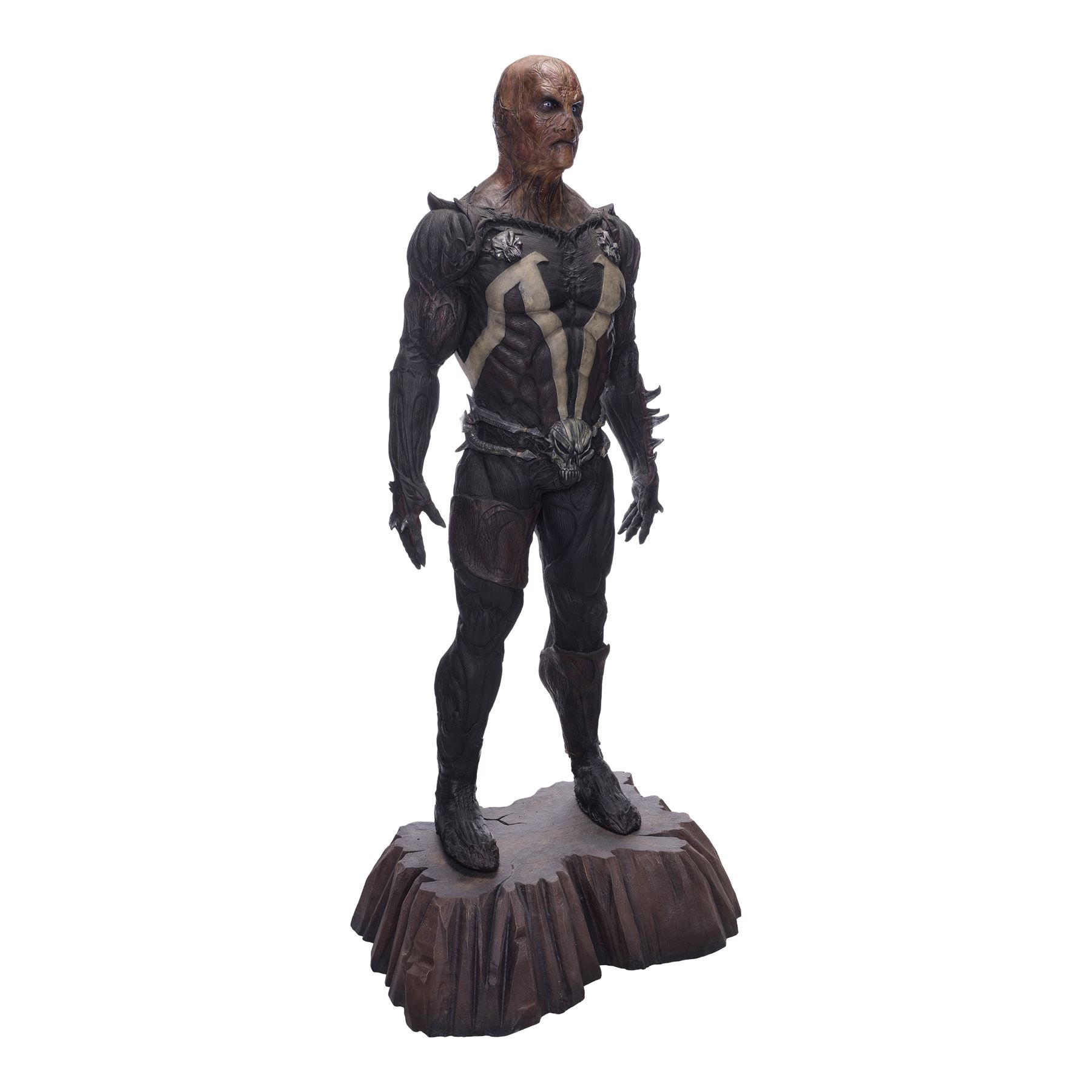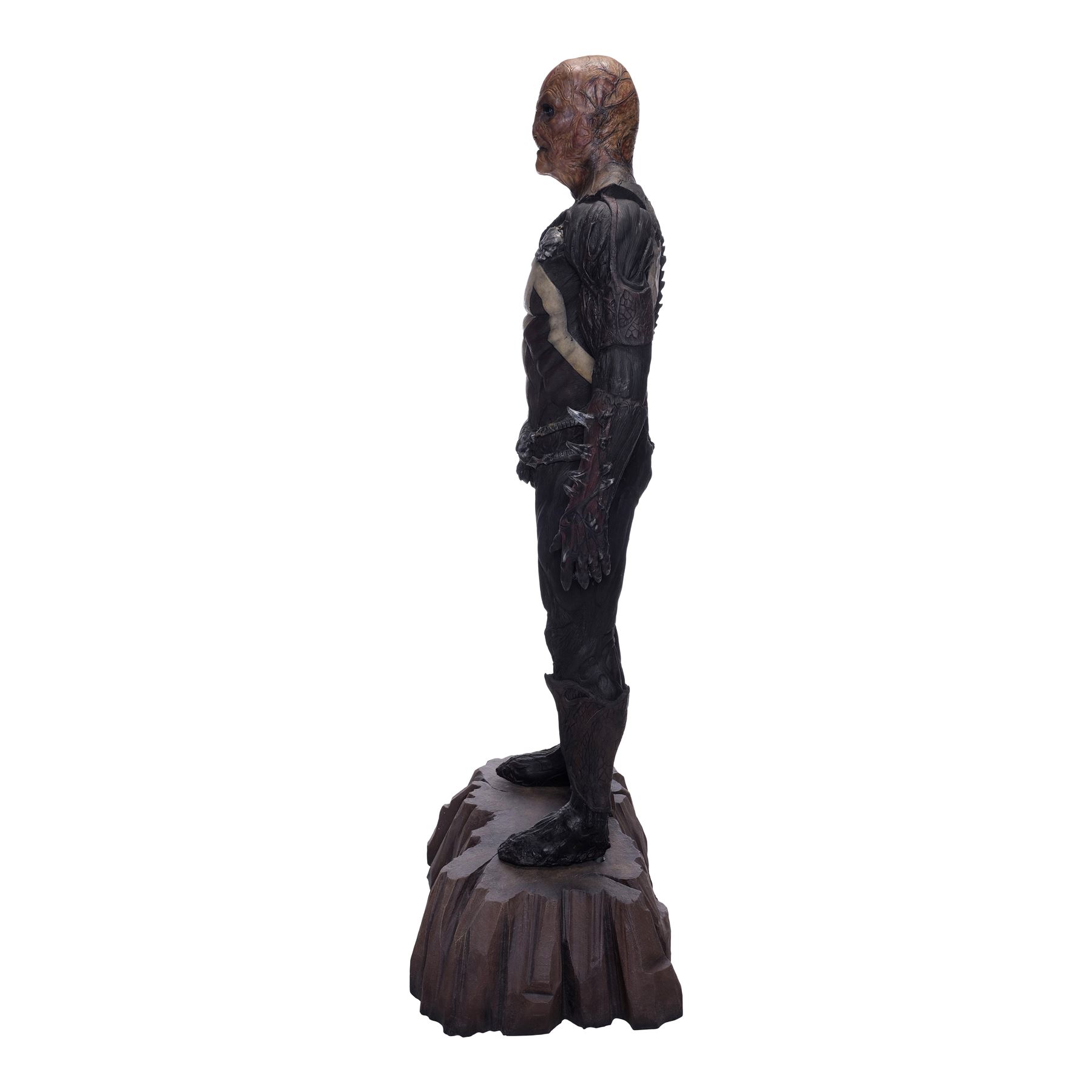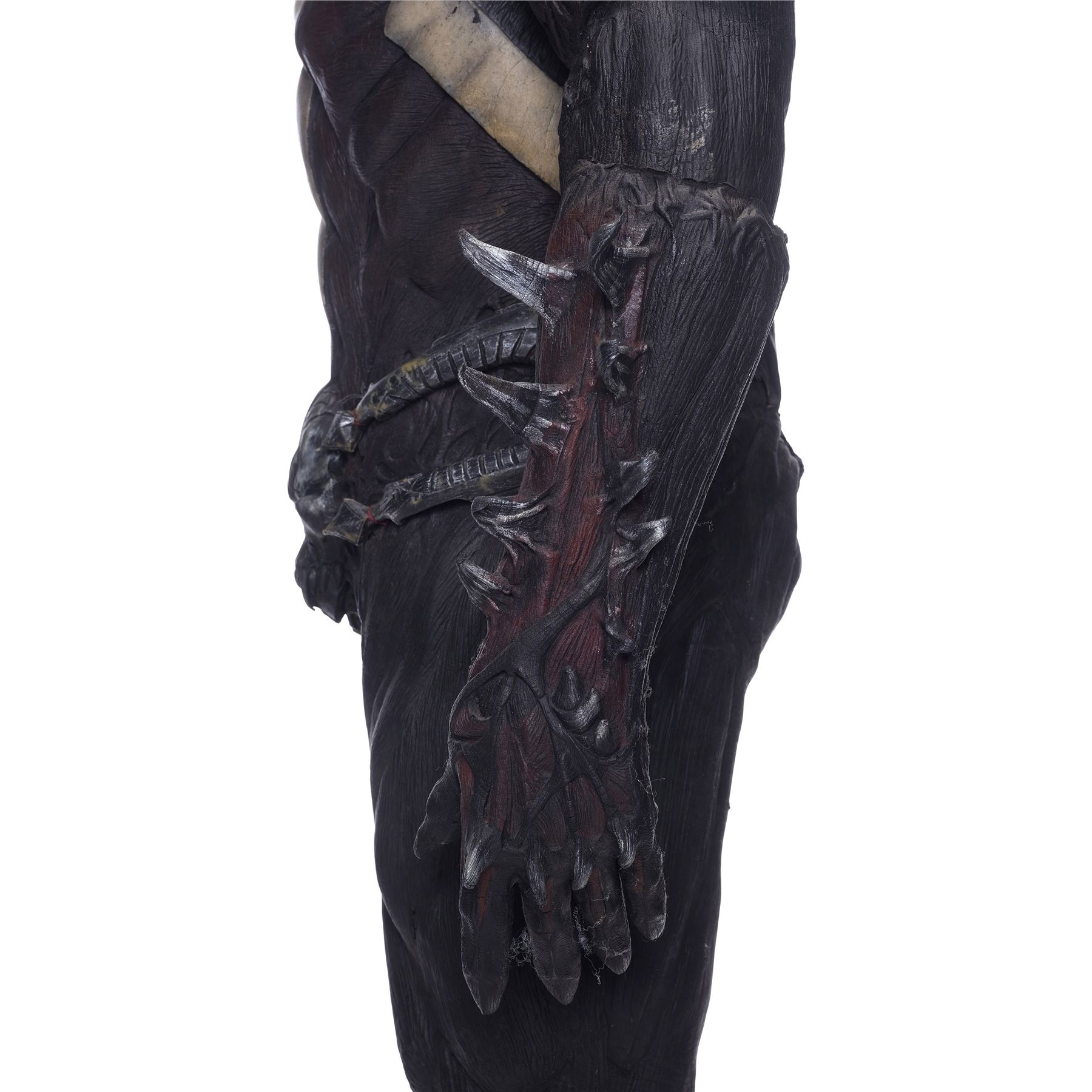 This lot consists of a black nylon bodysuit covered in black and brown painted foam with black foam gloves; silver-color painted sculpted rubber hip covers; and a black rubber and metal cable rope. This costume, with a zipper and button enclosure along the spine, comes on a foam mannequin display featuring a sculpted head that has been fitted with detailed burnt-skin prosthetics from production and a pair of replica blue acrylic eyes. The mannequin is mounted on a brown-painted foam base. This lot exhibits cracking foam material along the spine, calves, and gloves. Dimensions: 35.5" x 25" x 83.5" (90.25 cm x 63.5 cm x 212 cm)