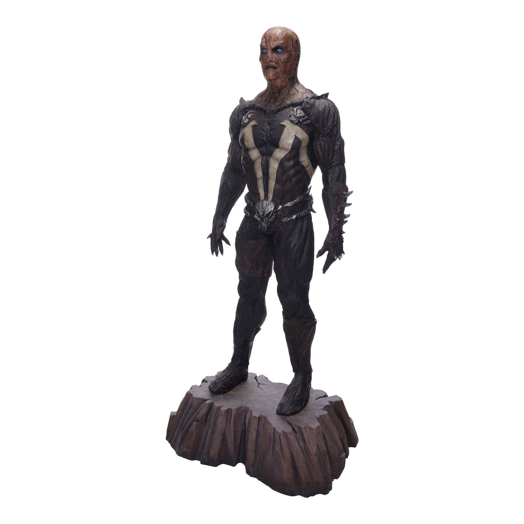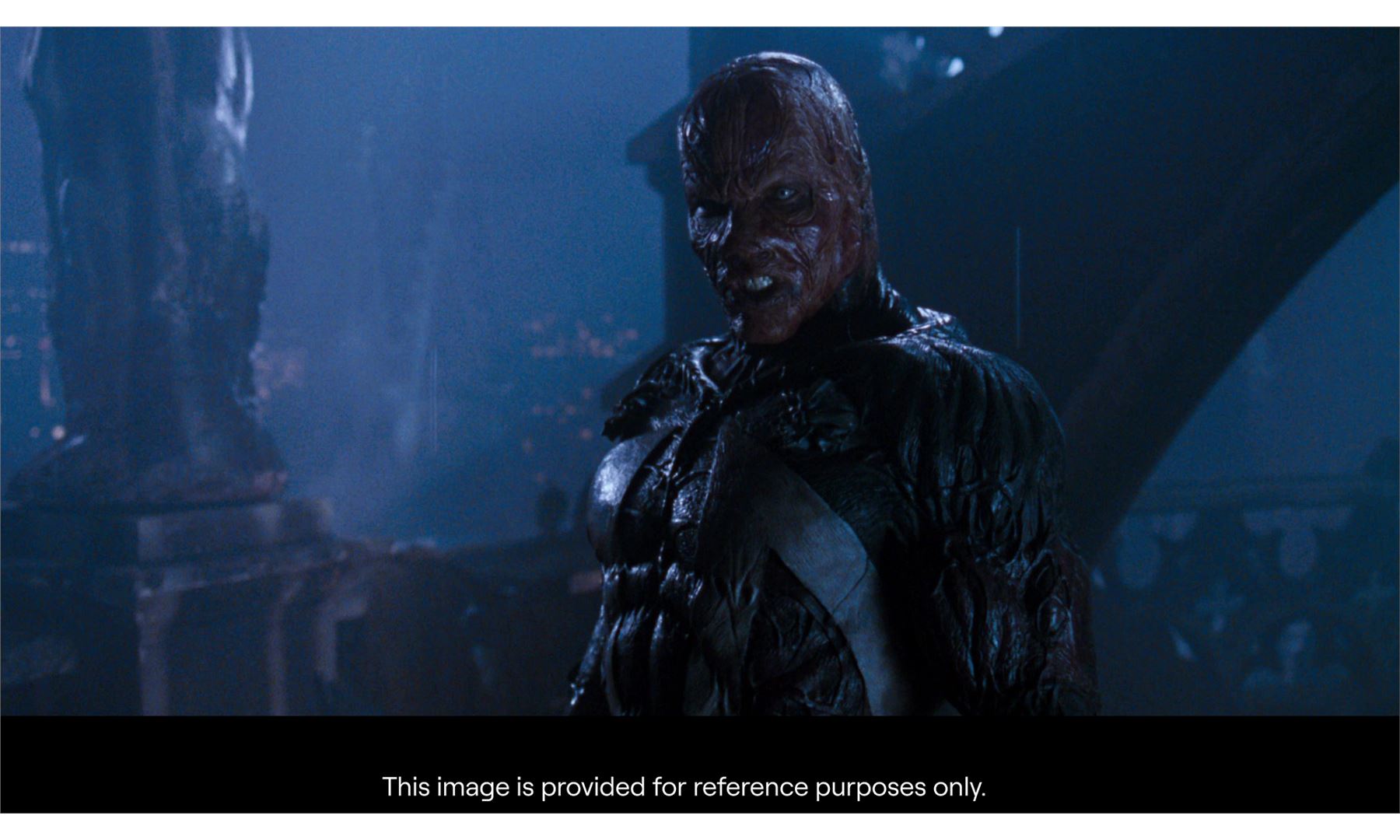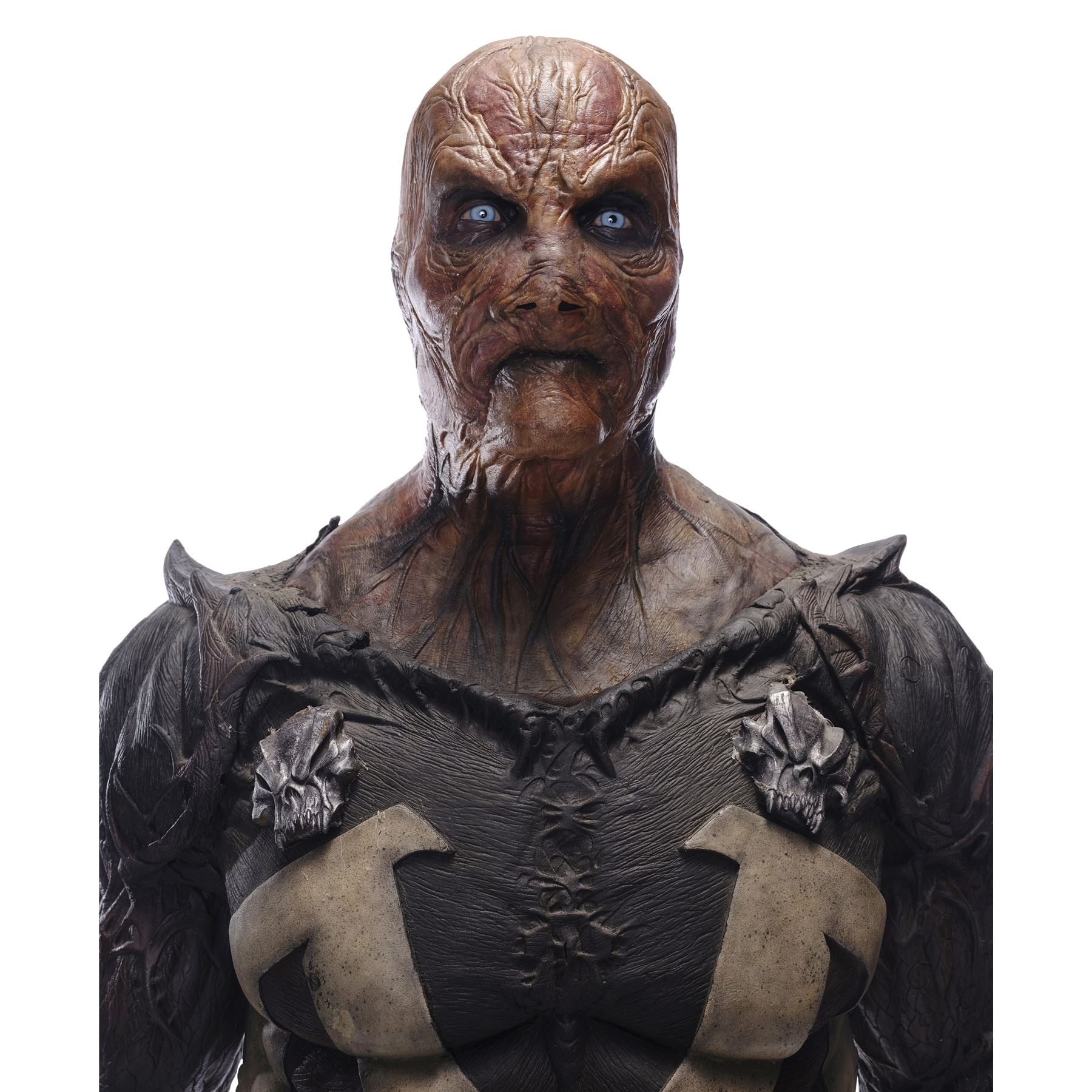 This lot consists of a black nylon bodysuit covered in black and brown painted foam with black foam gloves; silver-color painted sculpted rubber hip covers; and a black rubber and metal cable rope. This costume, with a zipper and button enclosure along the spine, comes on a foam mannequin display featuring a sculpted head that has been fitted with detailed burnt-skin prosthetics from production and a pair of replica blue acrylic eyes. The mannequin is mounted on a brown-painted foam base. This lot exhibits cracking foam material along the spine, calves, and gloves. Dimensions: 35.5" x 25" x 83.5" (90.25 cm x 63.5 cm x 212 cm)