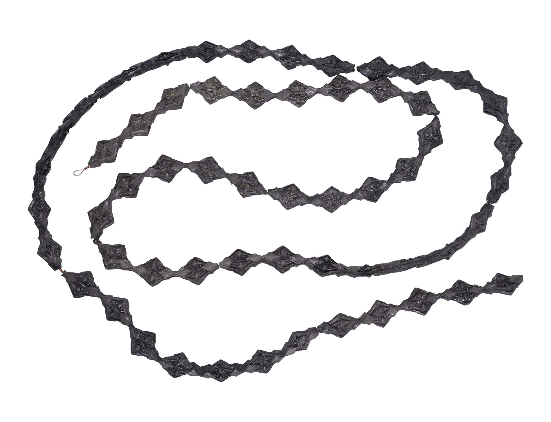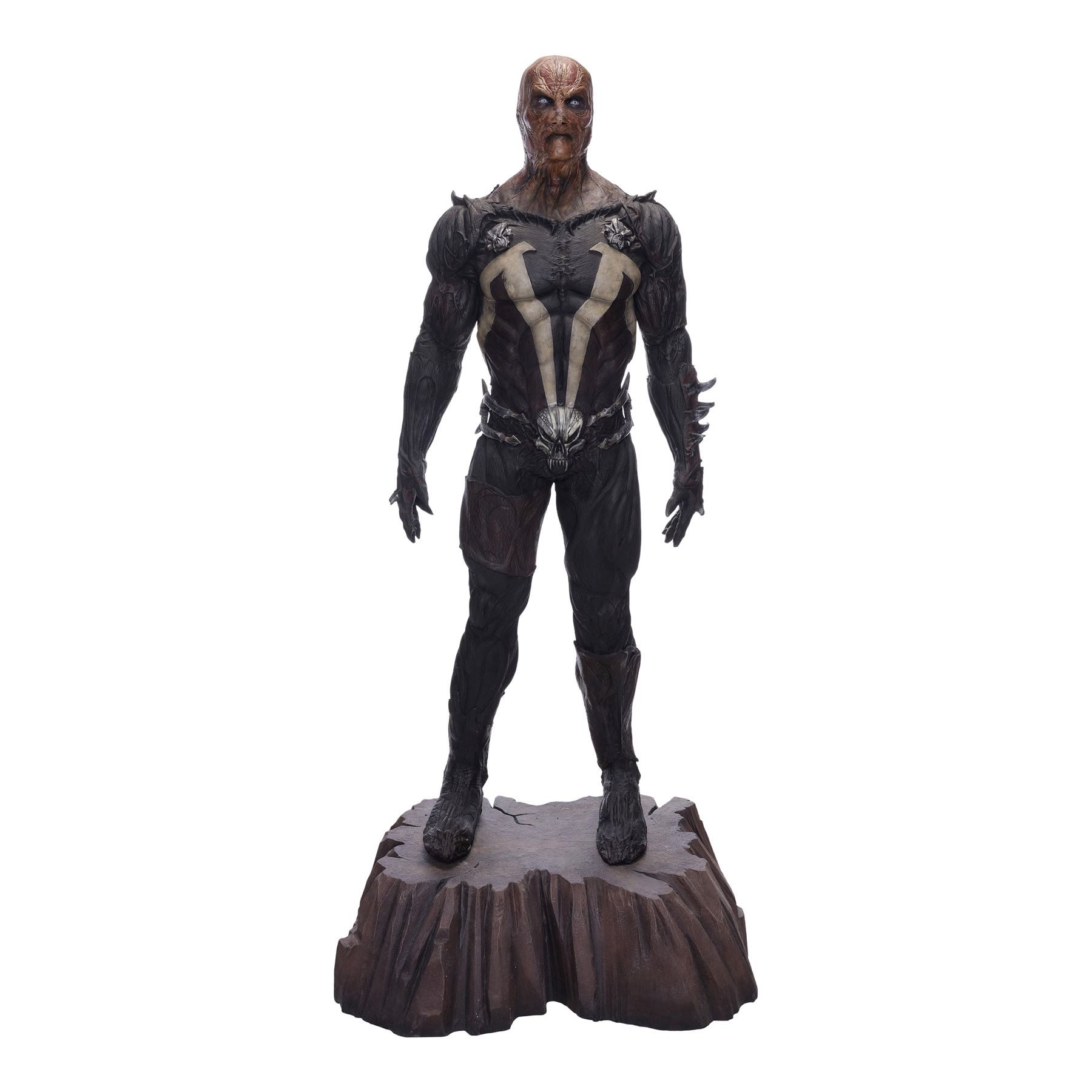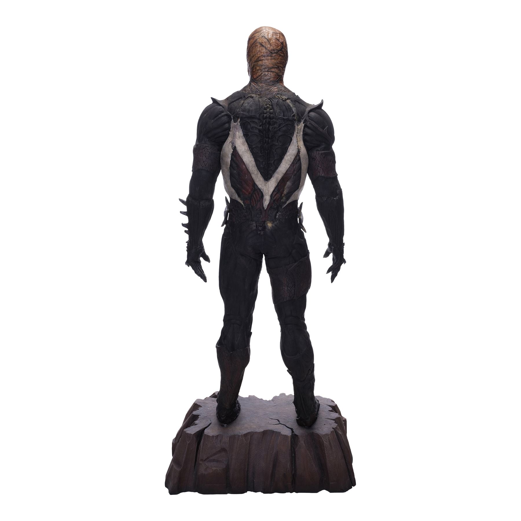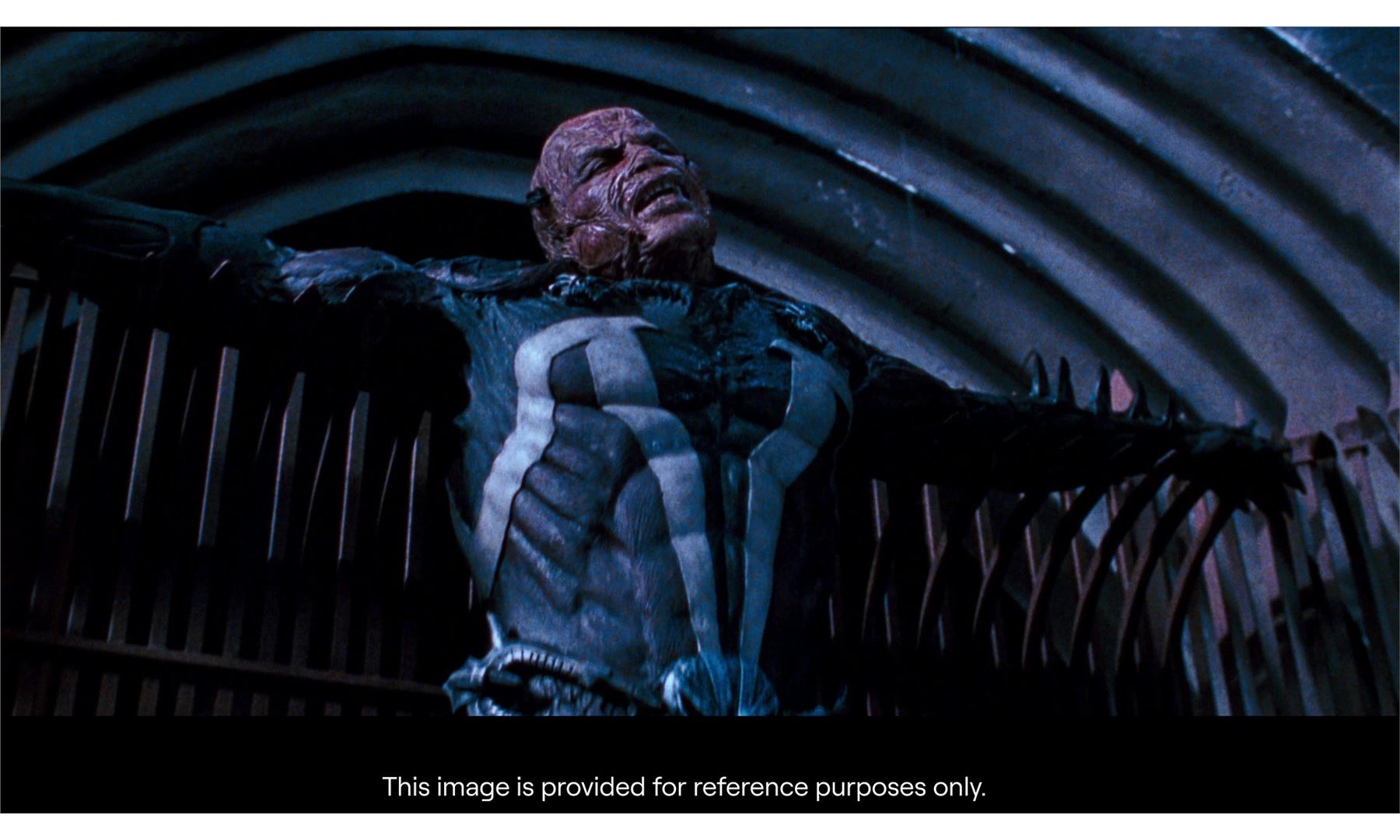 This lot consists of a black nylon bodysuit covered in black and brown painted foam with black foam gloves; silver-color painted sculpted rubber hip covers; and a black rubber and metal cable rope. This costume, with a zipper and button enclosure along the spine, comes on a foam mannequin display featuring a sculpted head that has been fitted with detailed burnt-skin prosthetics from production and a pair of replica blue acrylic eyes. The mannequin is mounted on a brown-painted foam base. This lot exhibits cracking foam material along the spine, calves, and gloves. Dimensions: 35.5" x 25" x 83.5" (90.25 cm x 63.5 cm x 212 cm)