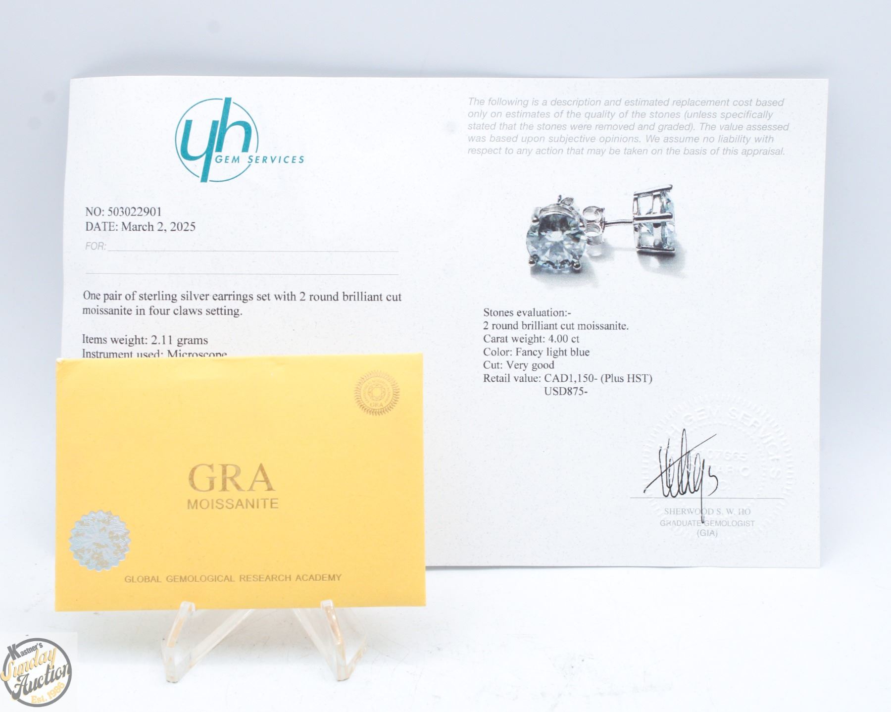 BRILLIANT CUT MOISSANITE STONES VVS FANCY LIGHT BLUE COLOR SET IN 4 CLAW BASKET HEAD SET IN 925 SILVER EARRINGS RETAIL VALUE $1,150.00**ALL ITEMS MUST BE REMOVED BY 5PM SATURDAY, JULY 19TH 2025. ALL REMAINING ITEMS WILL BE SUBJECT TO A $6.00 PER DAY STORAGE CHARGE. ANY ITEMS REMAINING AFTER MONDAY, AUGUST 4TH, 2025 WILL BE CONSIDERED FORFEITED. NO REFUNDS WILL BE ISSUED FOR FORFEITED ITEMS. TO SCHEDULE A PICK UP APPOINTMENT CLICK HERE