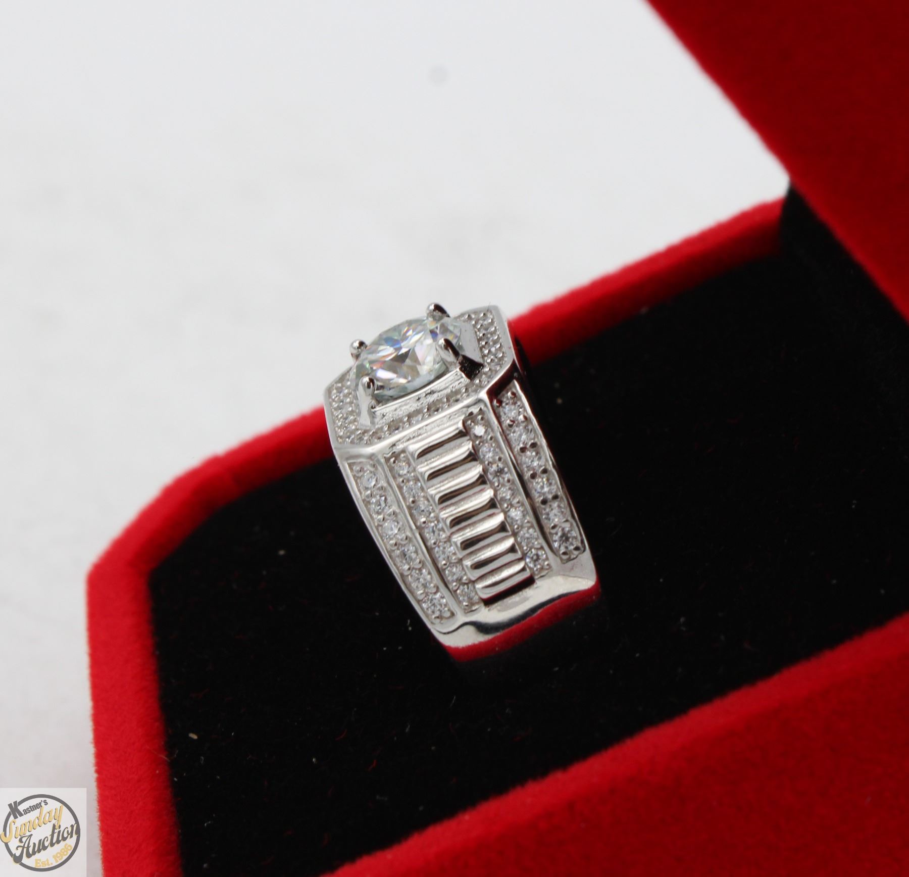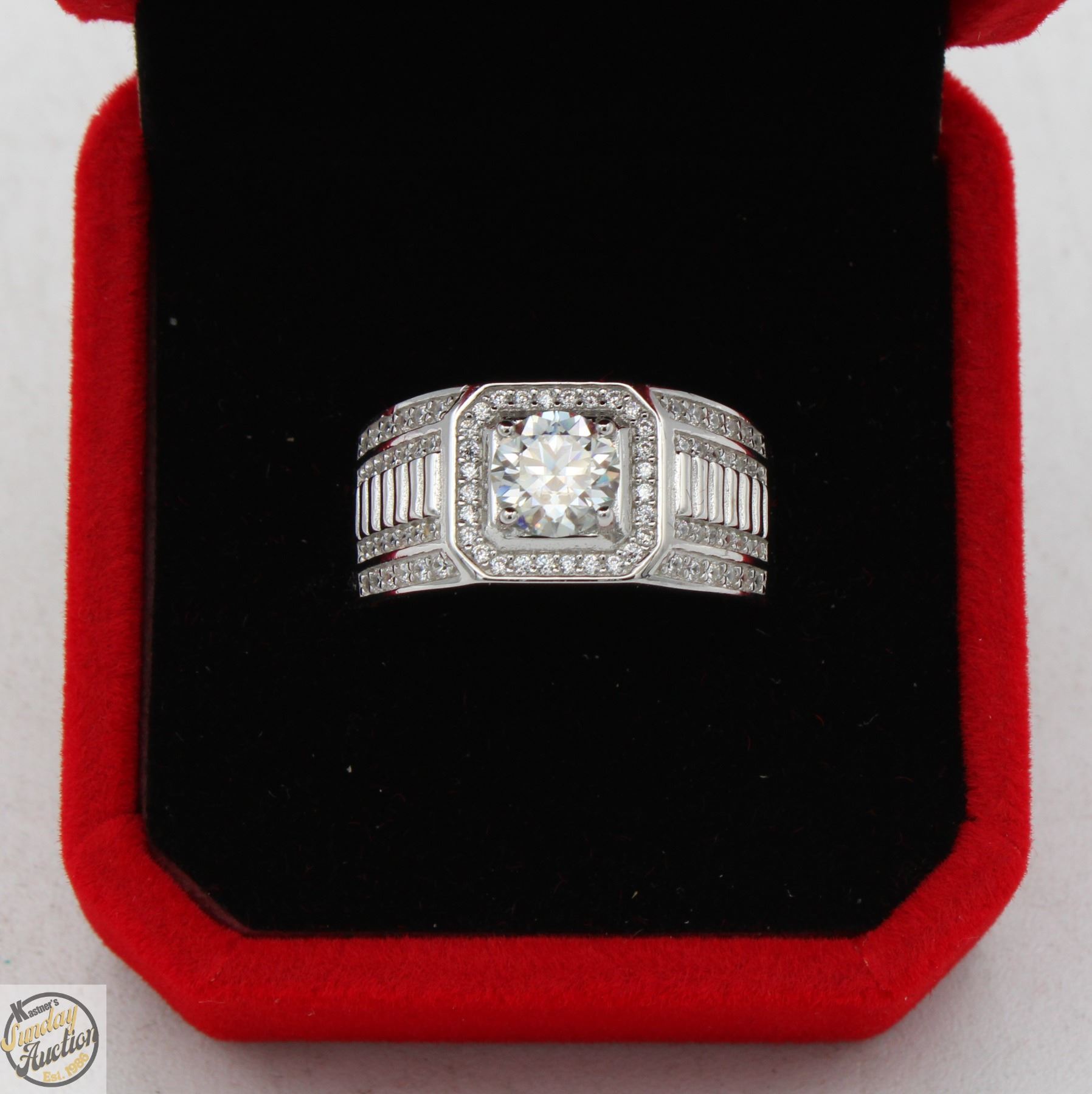 CUT MOISSANITE STONE VVS D COLOR WITH 84 ROUND BRILLIANT CUT CUBIC ZIRCONIA SET IN SQUARE HALO AND SET IN SHANKS SET IN 925 SILVER RING SIZE 9.5 RETAIL VALUE $1,200.00**ALL ITEMS MUST BE REMOVED BY 5PM SATURDAY, JULY 19TH 2025. ALL REMAINING ITEMS WILL BE SUBJECT TO A $6.00 PER DAY STORAGE CHARGE. ANY ITEMS REMAINING AFTER MONDAY, AUGUST 4TH, 2025 WILL BE CONSIDERED FORFEITED. NO REFUNDS WILL BE ISSUED FOR FORFEITED ITEMS. TO SCHEDULE A PICK UP APPOINTMENT CLICK HERE