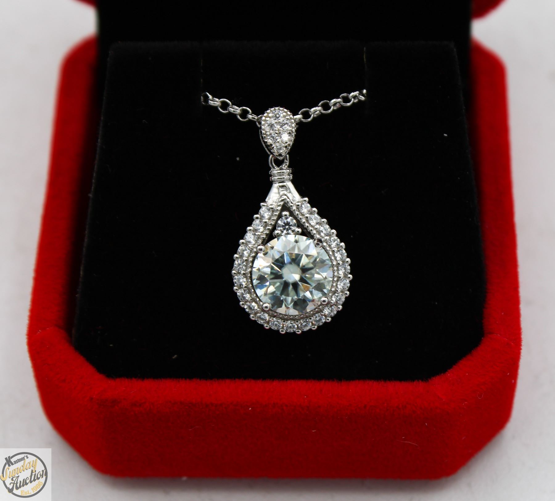 ROUND BRILLIANT CUT MOISSANITE STONE VVS D COLOR SET WITH 29 ROUND BRILLIANT CUT CUBIC ZIRCONIA SET IN TEAR DROP HALO SET IN 925 SILVER PENDANT **ALL ITEMS MUST BE REMOVED BY 5PM SATURDAY, JULY 26th 2025. ALL REMAINING ITEMS WILL BE SUBJECT TO A $6.00 PER DAY STORAGE CHARGE. ANY ITEMS REMAINING AFTER MONDAY, AUGUST 11TH 2025 WILL BE CONSIDERED FORFEITED. NO REFUNDS WILL BE ISSUED FOR FORFEITED ITEMS. TO SCHEDULE A PICK UP APPOINTMENT CLICK HERE