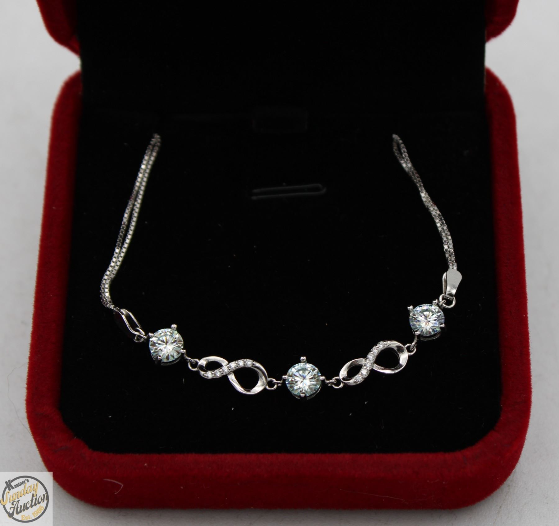 CUT MOISSANITE STONES FOR THE 3 STONES VVS D COLOR SET WITH 12 ROUND BRILLIANT CUT CUBIC ZIRCONIA SET IN INFINITY DESIGN SET IN 925 SILVER BRACELET **ALL ITEMS MUST BE REMOVED BY 5PM SATURDAY, JULY 26th 2025. ALL REMAINING ITEMS WILL BE SUBJECT TO A $6.00 PER DAY STORAGE CHARGE. ANY ITEMS REMAINING AFTER MONDAY, AUGUST 11TH 2025 WILL BE CONSIDERED FORFEITED. NO REFUNDS WILL BE ISSUED FOR FORFEITED ITEMS. TO SCHEDULE A PICK UP APPOINTMENT CLICK HERE